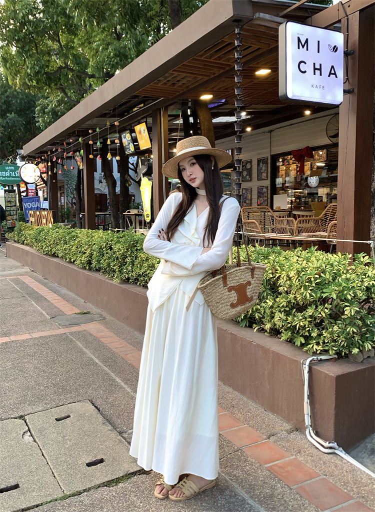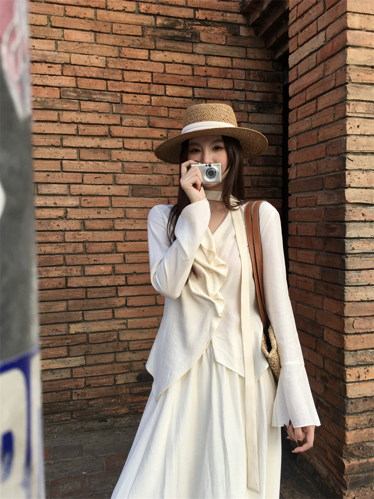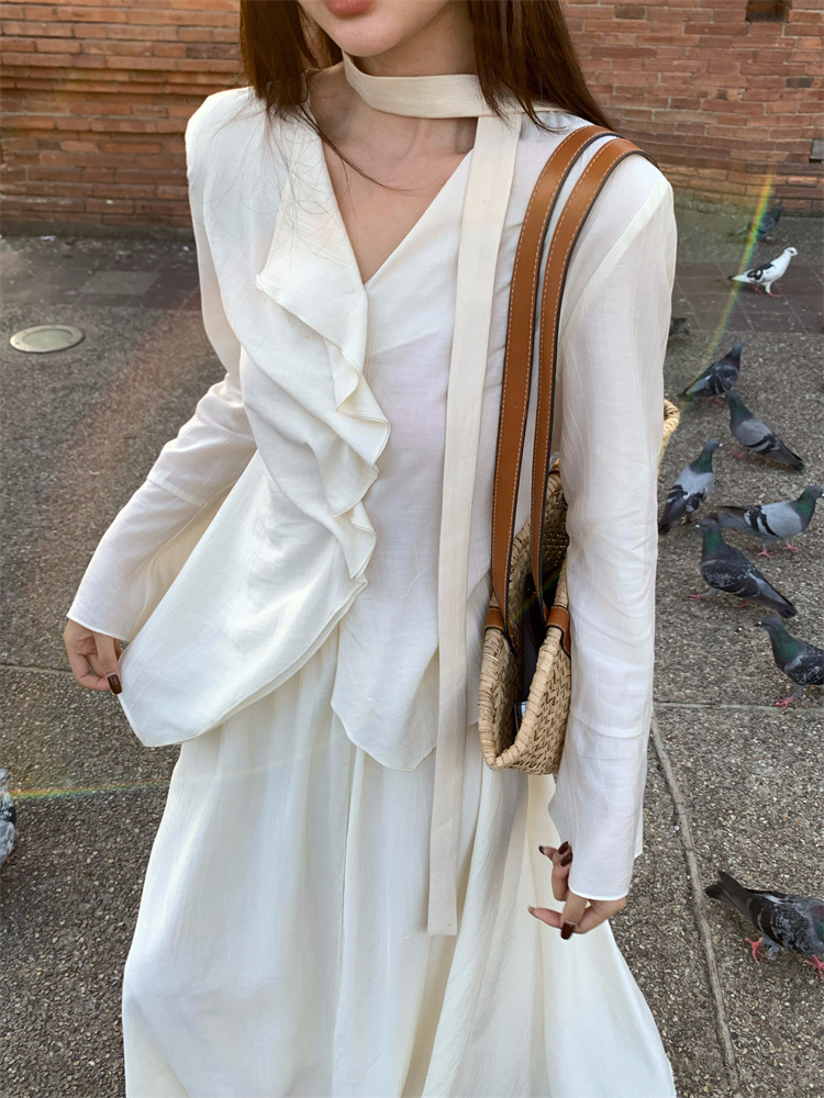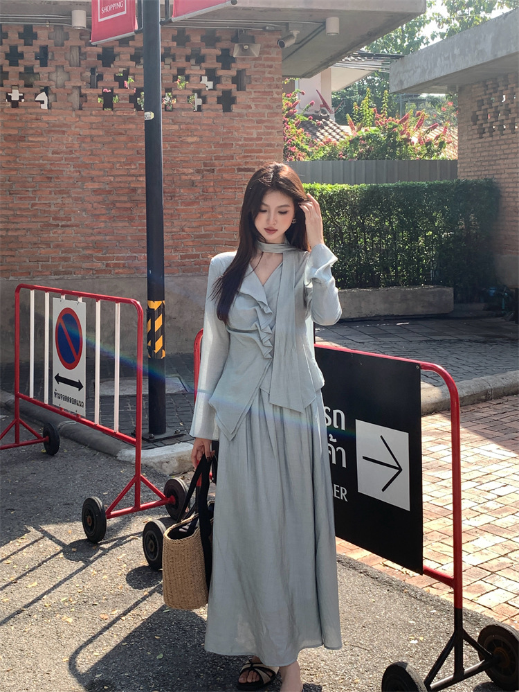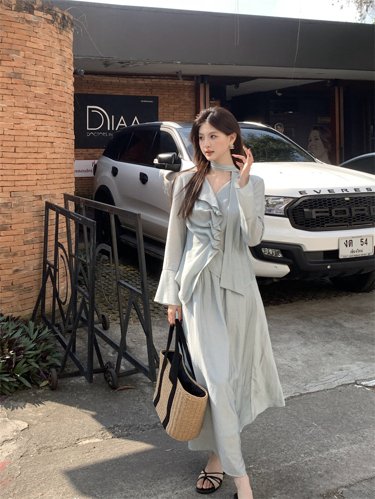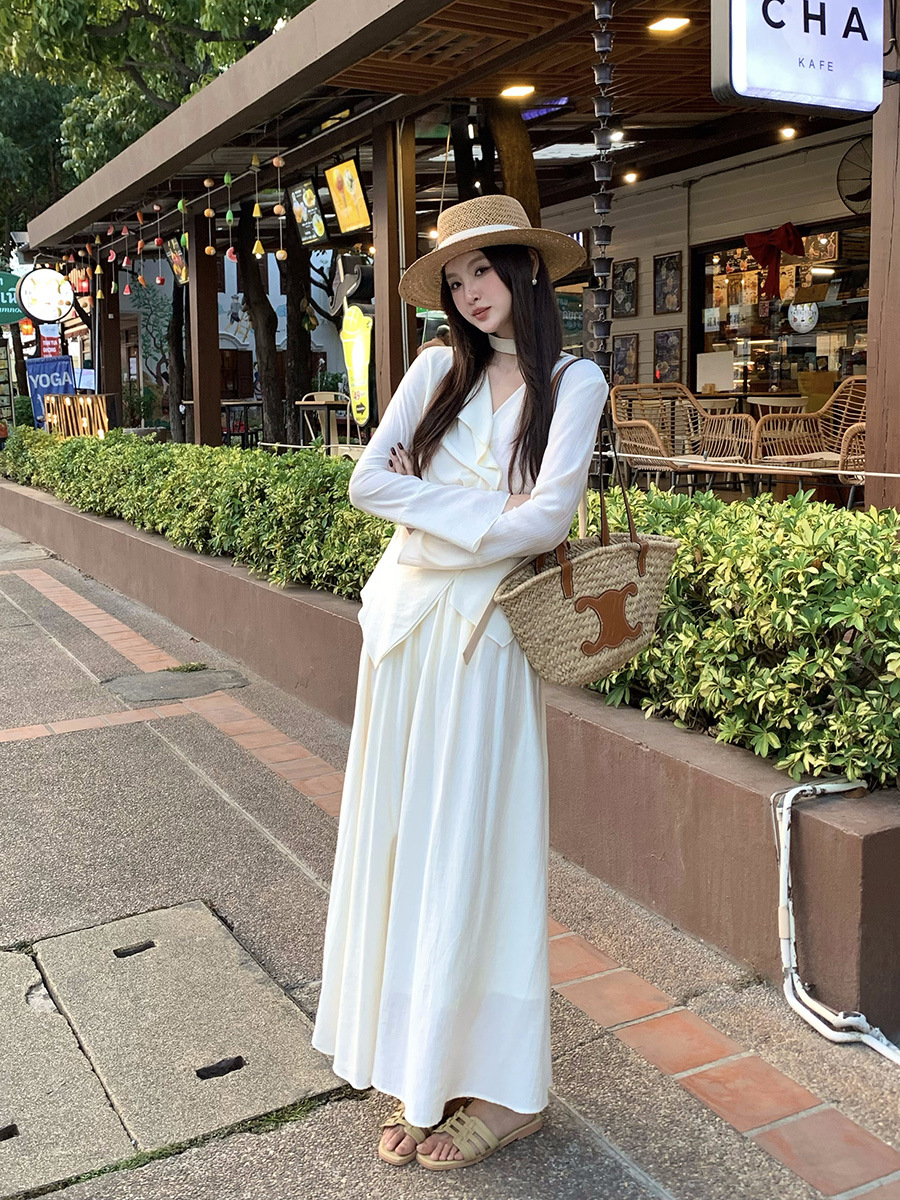 Xiuxixi 2025 새로운 가을 스타일 쉬폰 셔츠 + 여성용 하이 웨이스트 A 라인 하프 길이 스커트 투피스 슈트 89248