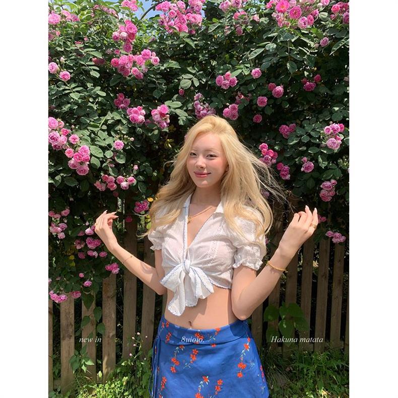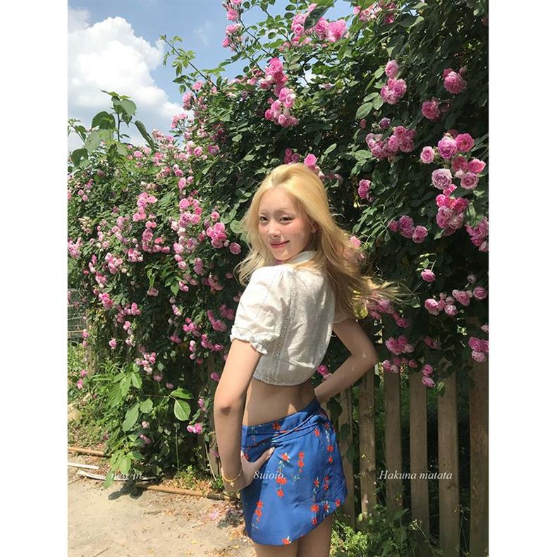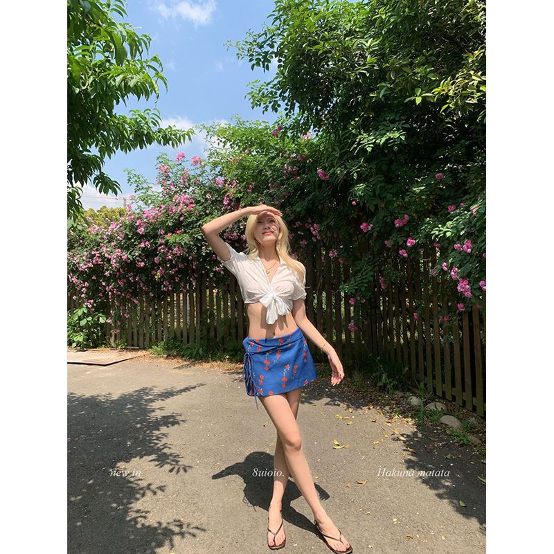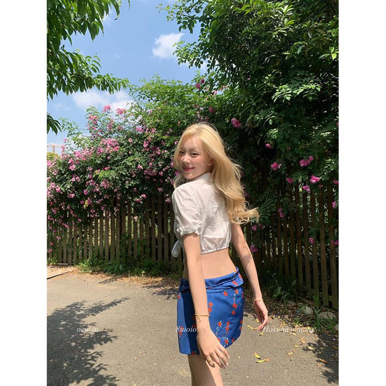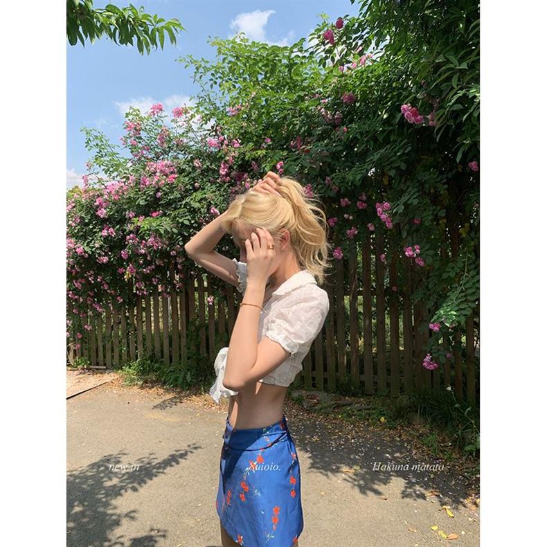 여성을위한 프랑스 스타일 부드러운 스타일 블루 꽃 스커트 여름 새로운 틈새 중공 슬림 슬리밍 탑 슈트스토어 가기