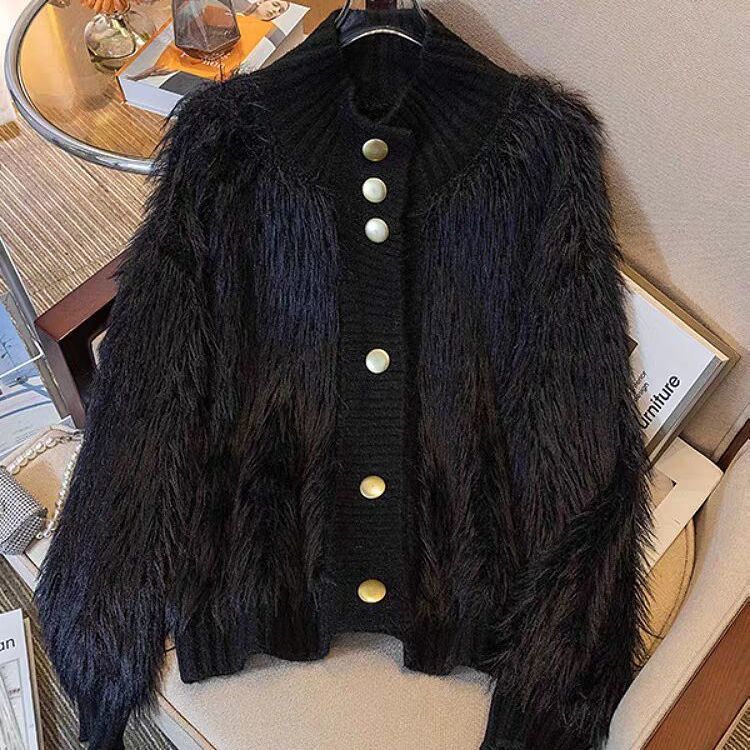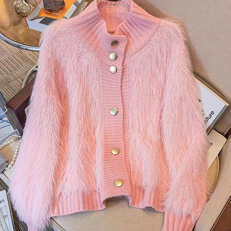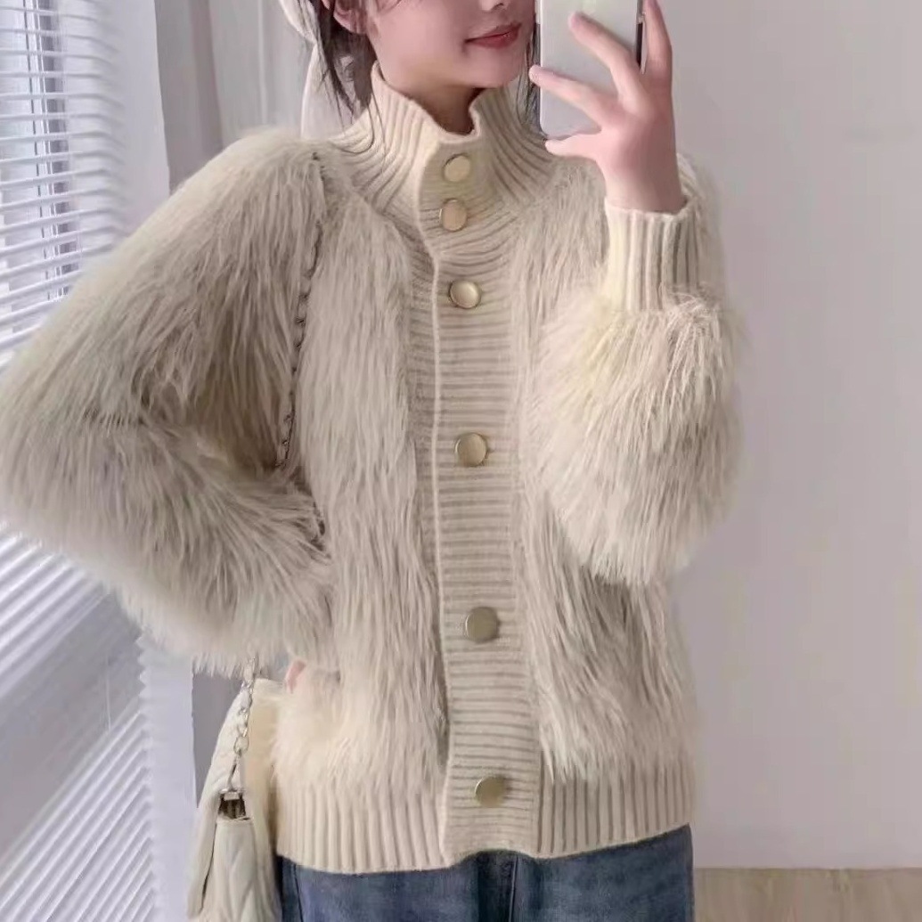가을 겨울 2024 여성을 위한 모조 밍크 벨벳 터틀넥 스웨터 가디건 새로운 스타일의 루즈한 봄 울 니트 재킷