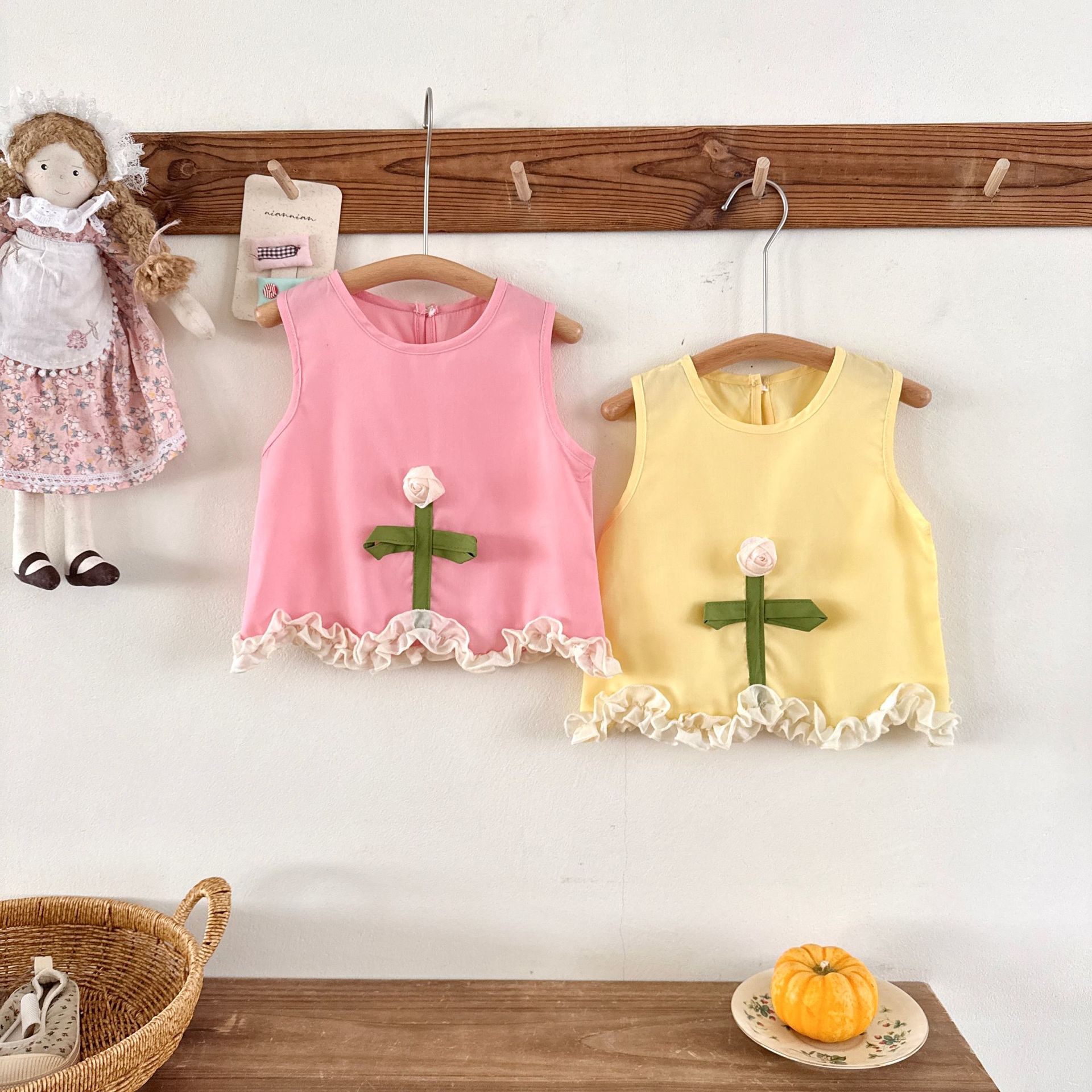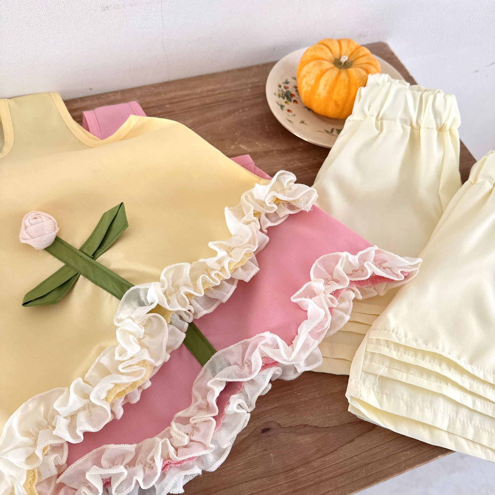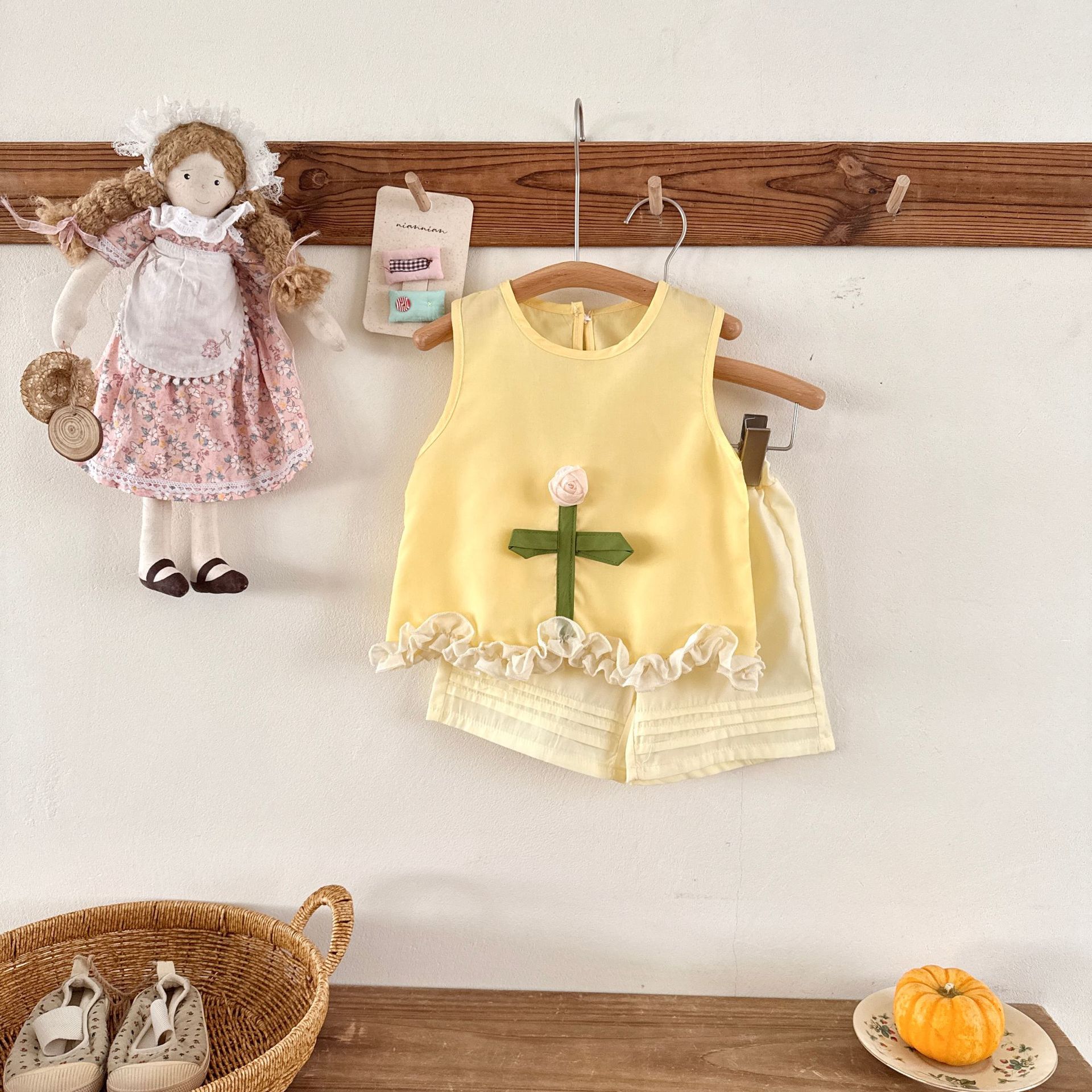 여자 2025 새로운 여름 스타일 아기 소녀 노란색 입체 꽃 민소매 고급 레이스 스커트 반바지 정장 투피스 세트