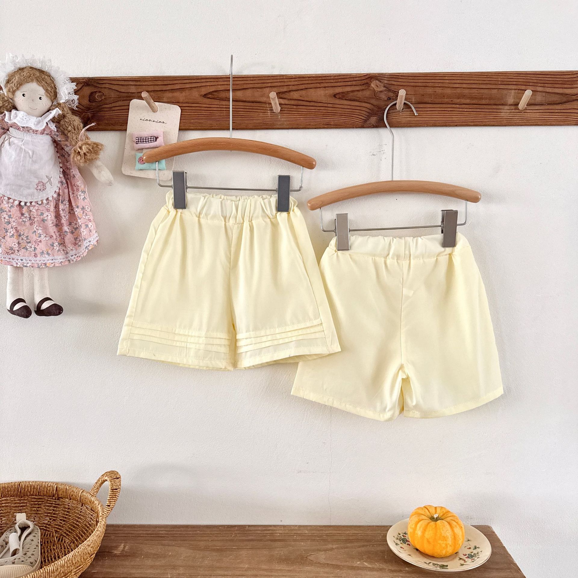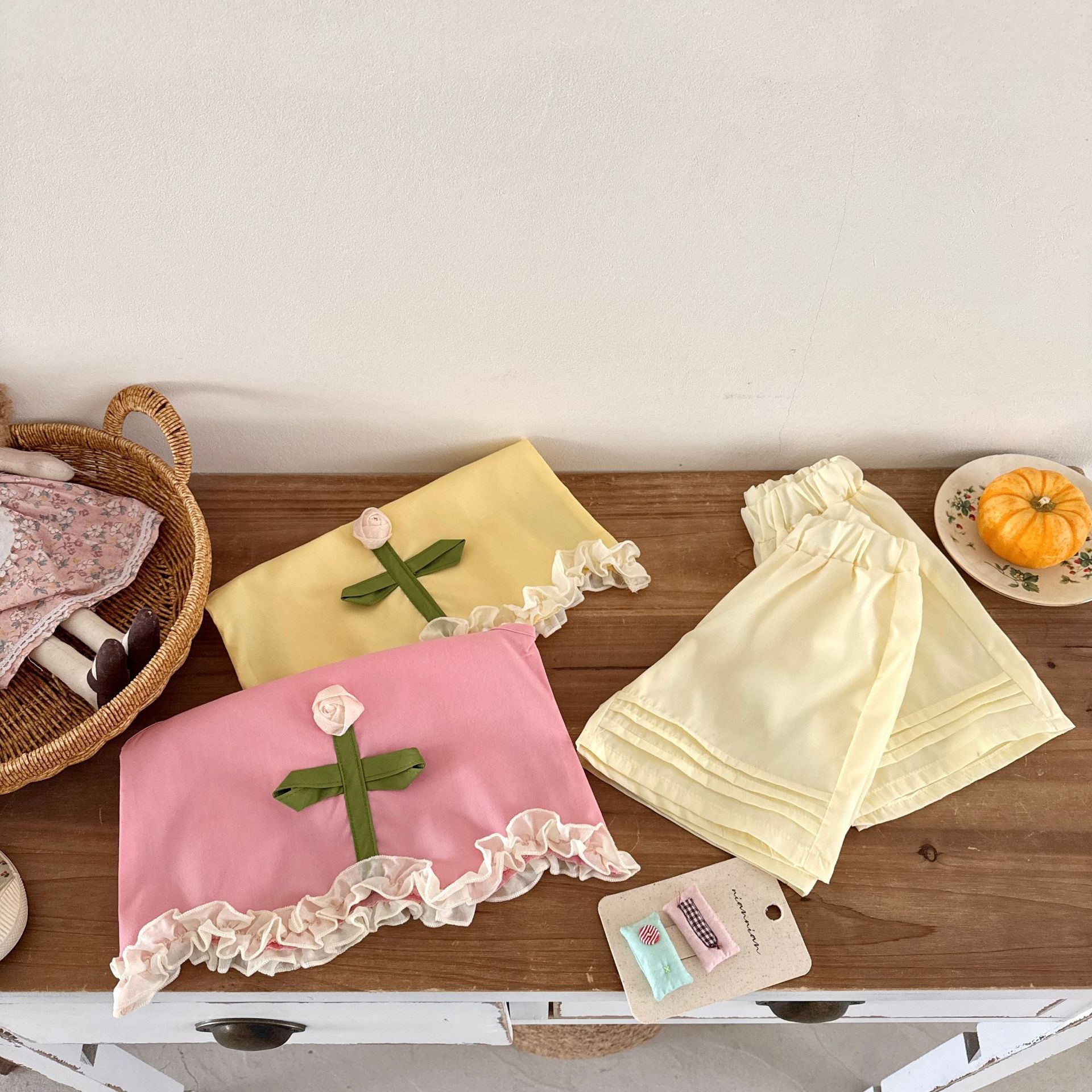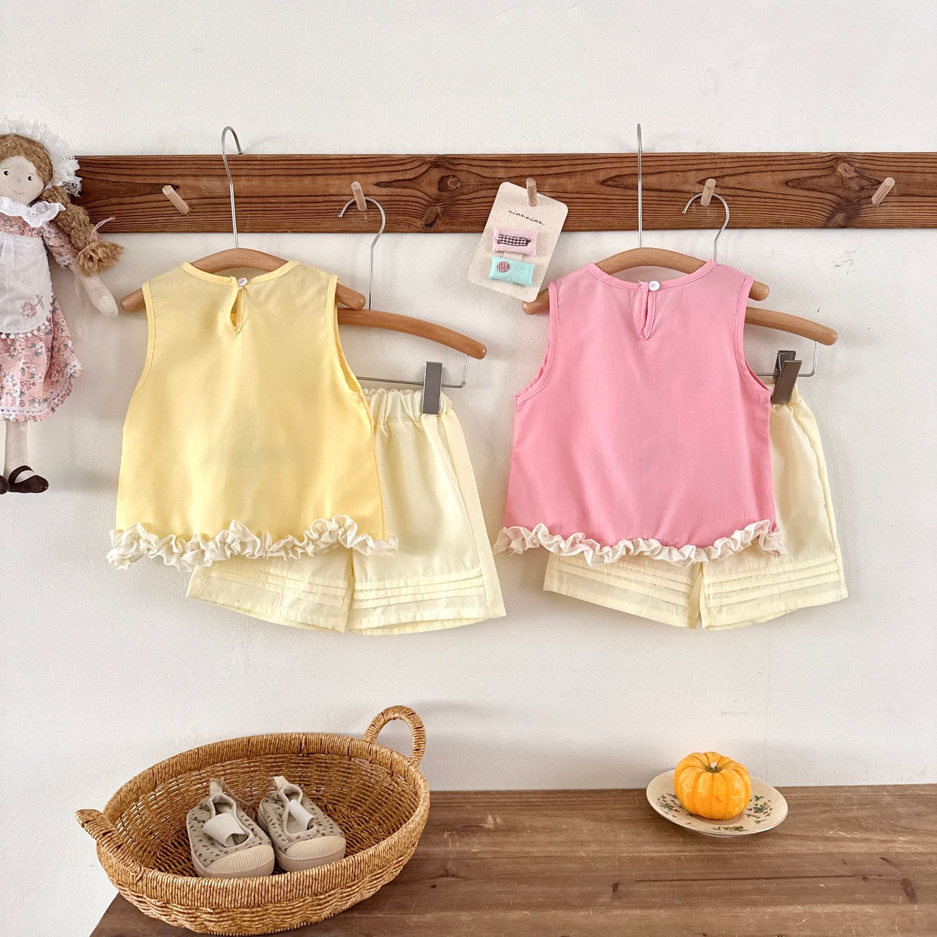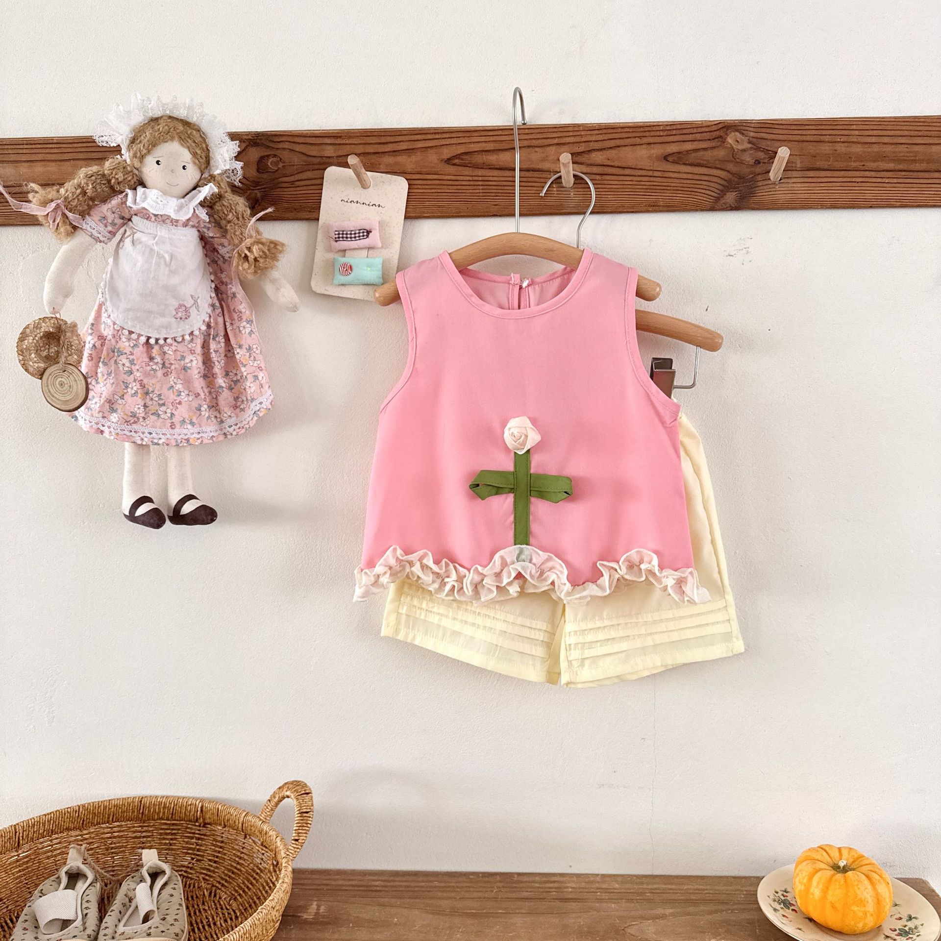 여자 2025 새로운 여름 스타일 아기 소녀 노란색 입체 꽃 민소매 고급 레이스 스커트 반바지 정장 투피스 세트스토어 가기