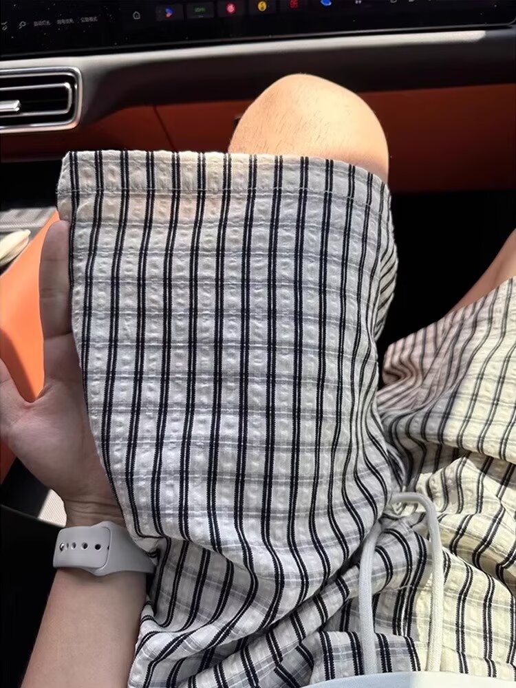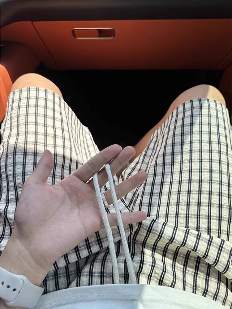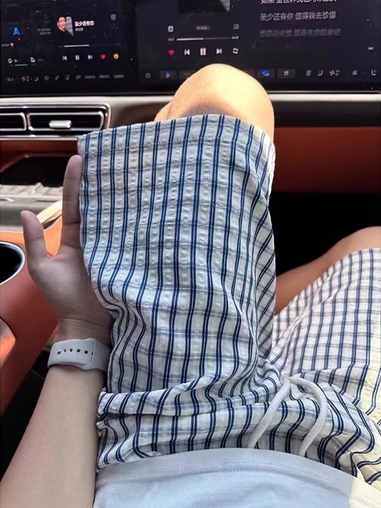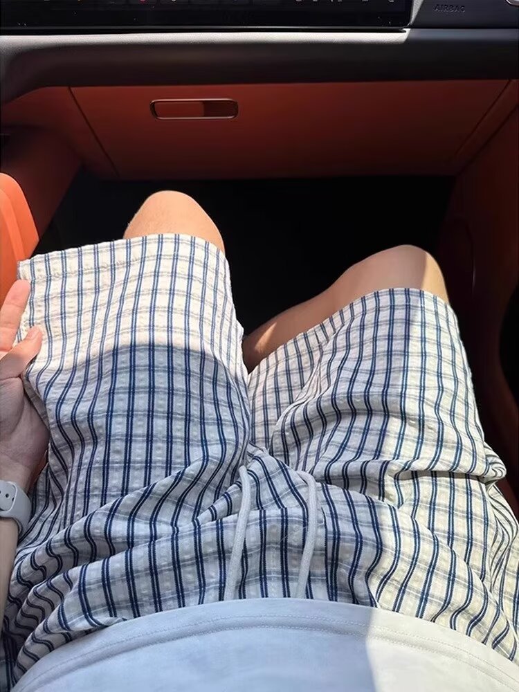블루 시어서커 체크 무늬 반바지 남성 여름 얇은 스플리싱 디자인 스트레이트 팬츠 캐주얼 와이드 레그 5부 팬츠스토어 가기