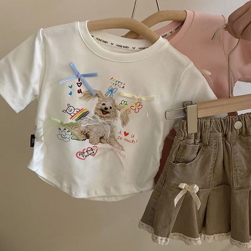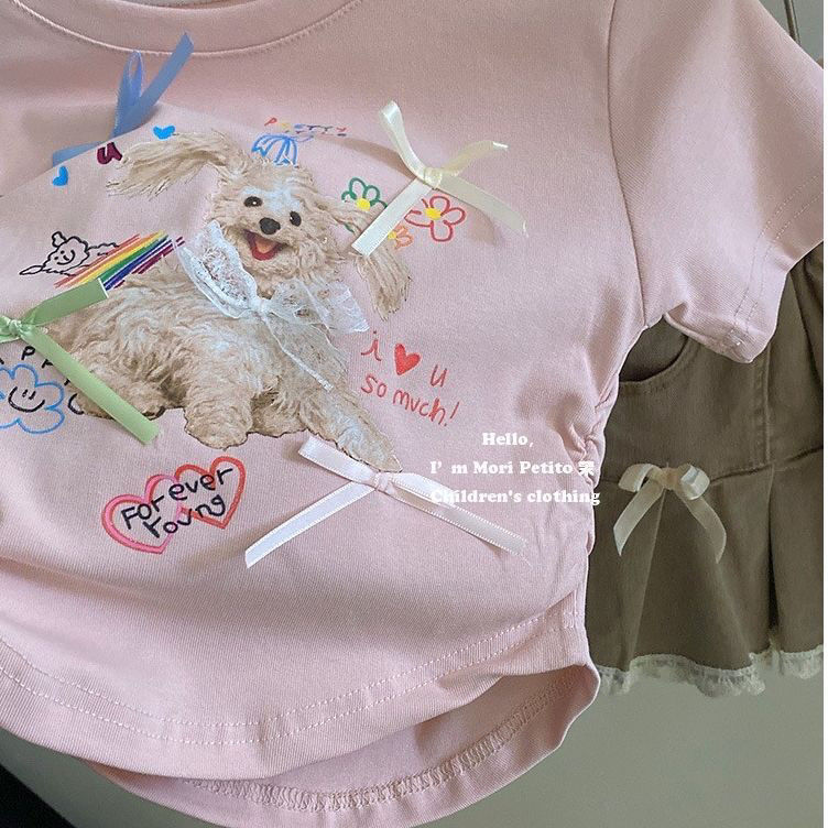 여아 2026 여름 신상 귀여운 강아지 반팔 티셔츠 + 리본 주름 스커트 투피스 세트