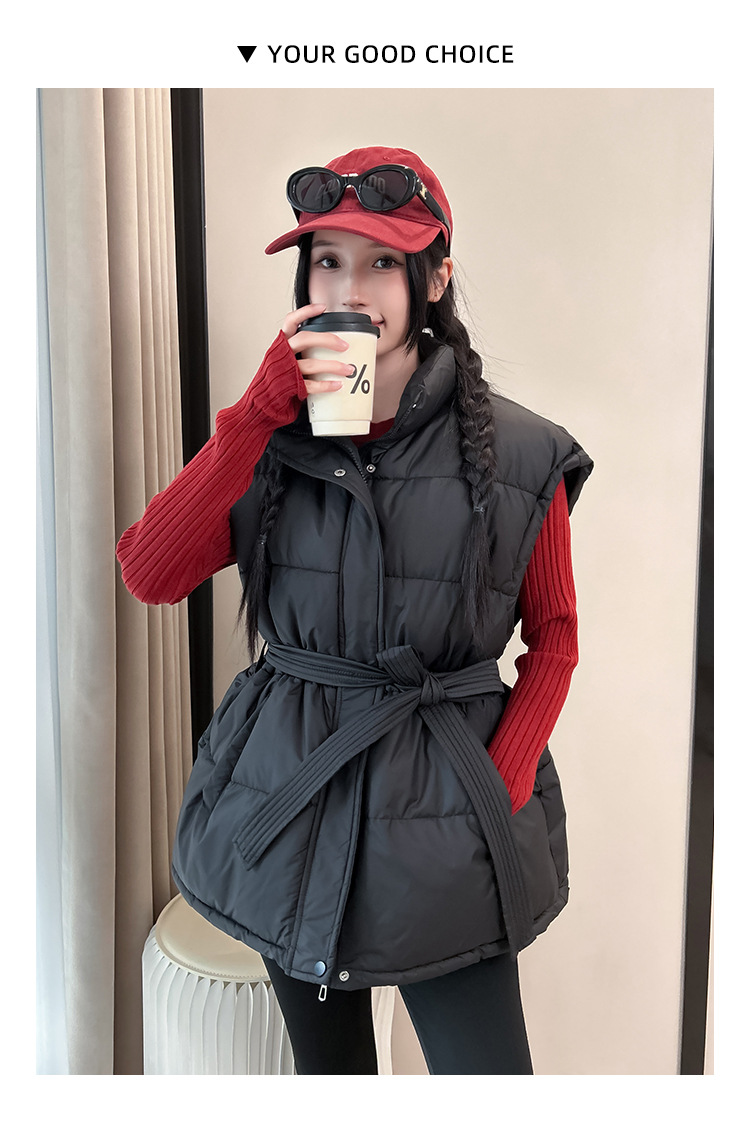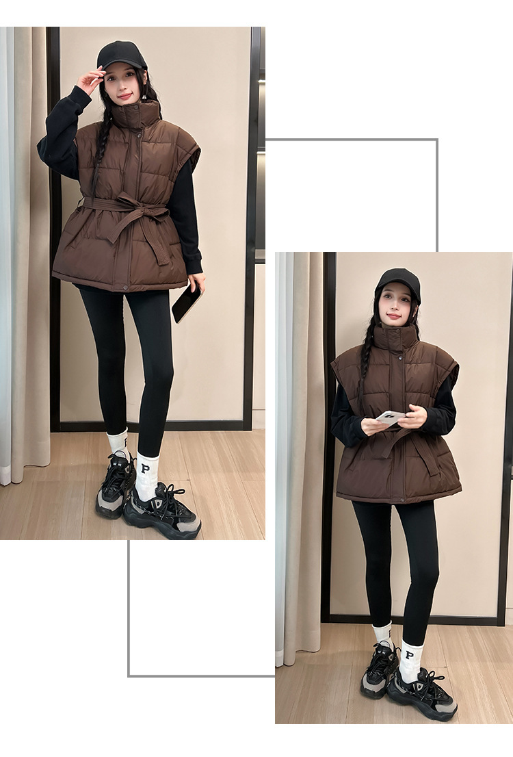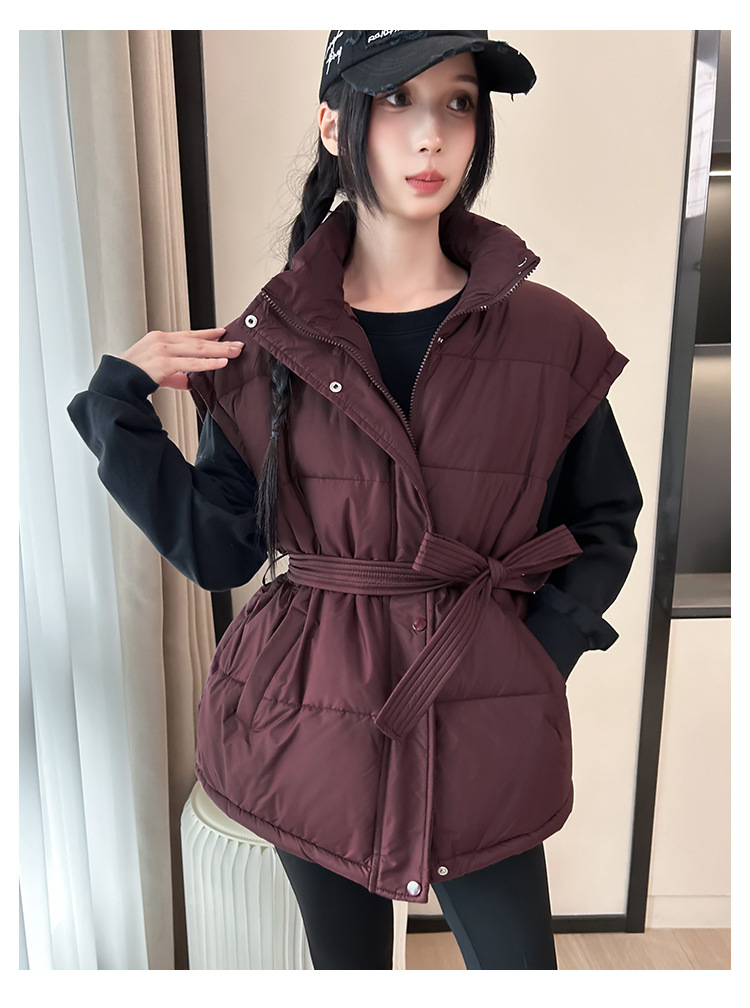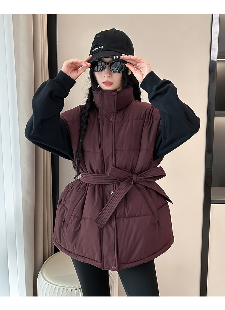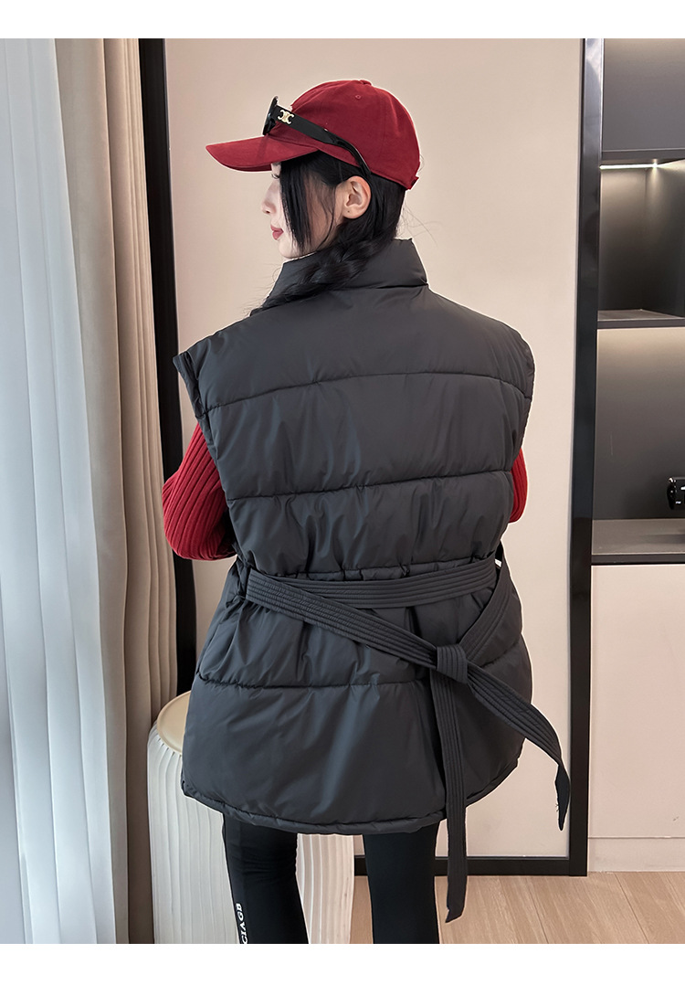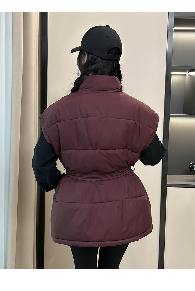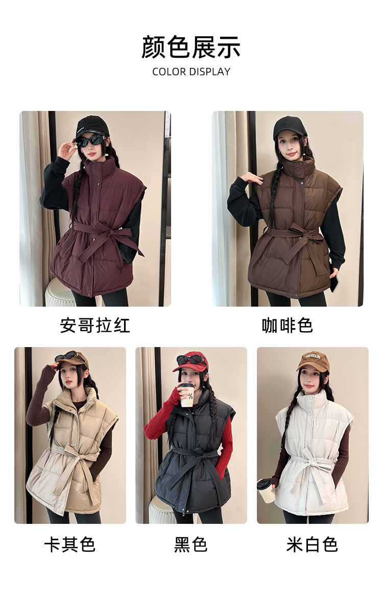 여성을위한 오프 숄더 코튼 조끼 짧은 2025 가을, 겨울 새로운 패션 벨트 스타일 한국어 버전 두꺼운 대외 무역 스탠드 업 칼라 코튼 조끼