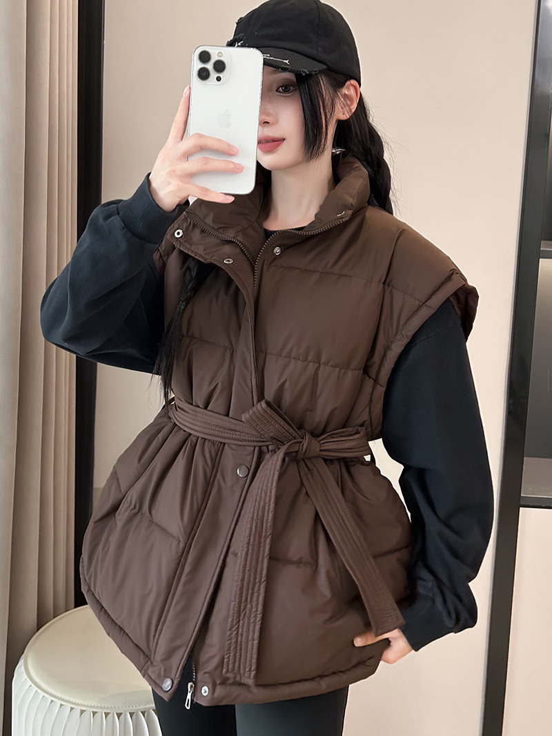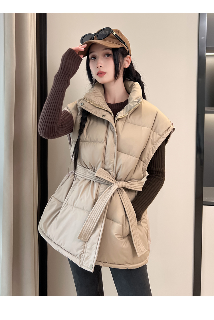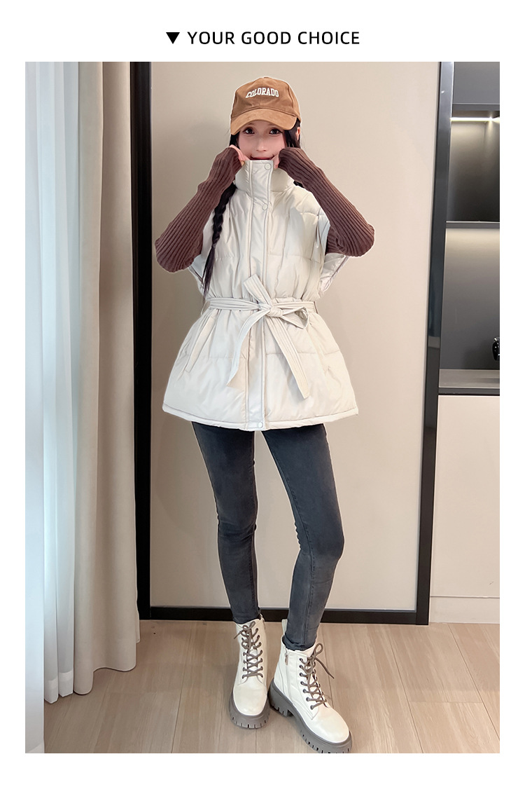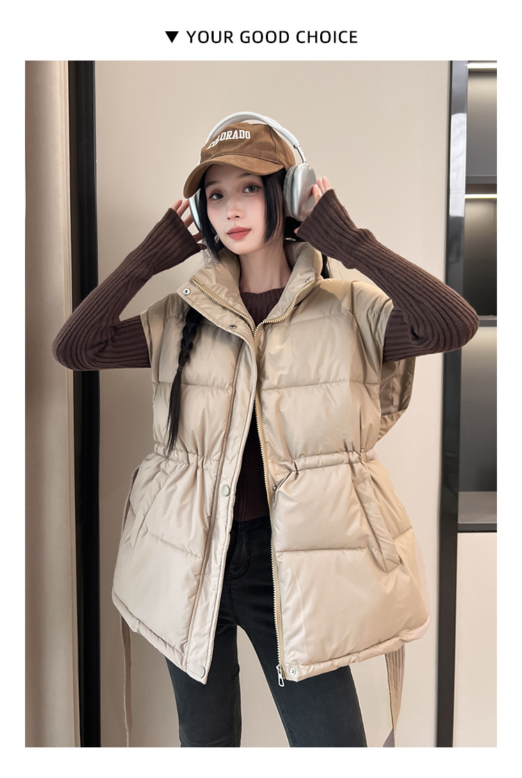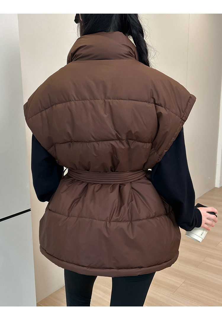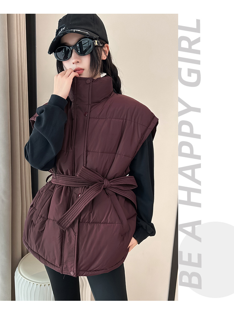 여성을위한 오프 숄더 코튼 조끼 짧은 2025 가을, 겨울 새로운 패션 벨트 스타일 한국어 버전 두꺼운 대외 무역 스탠드 업 칼라 코튼 조끼