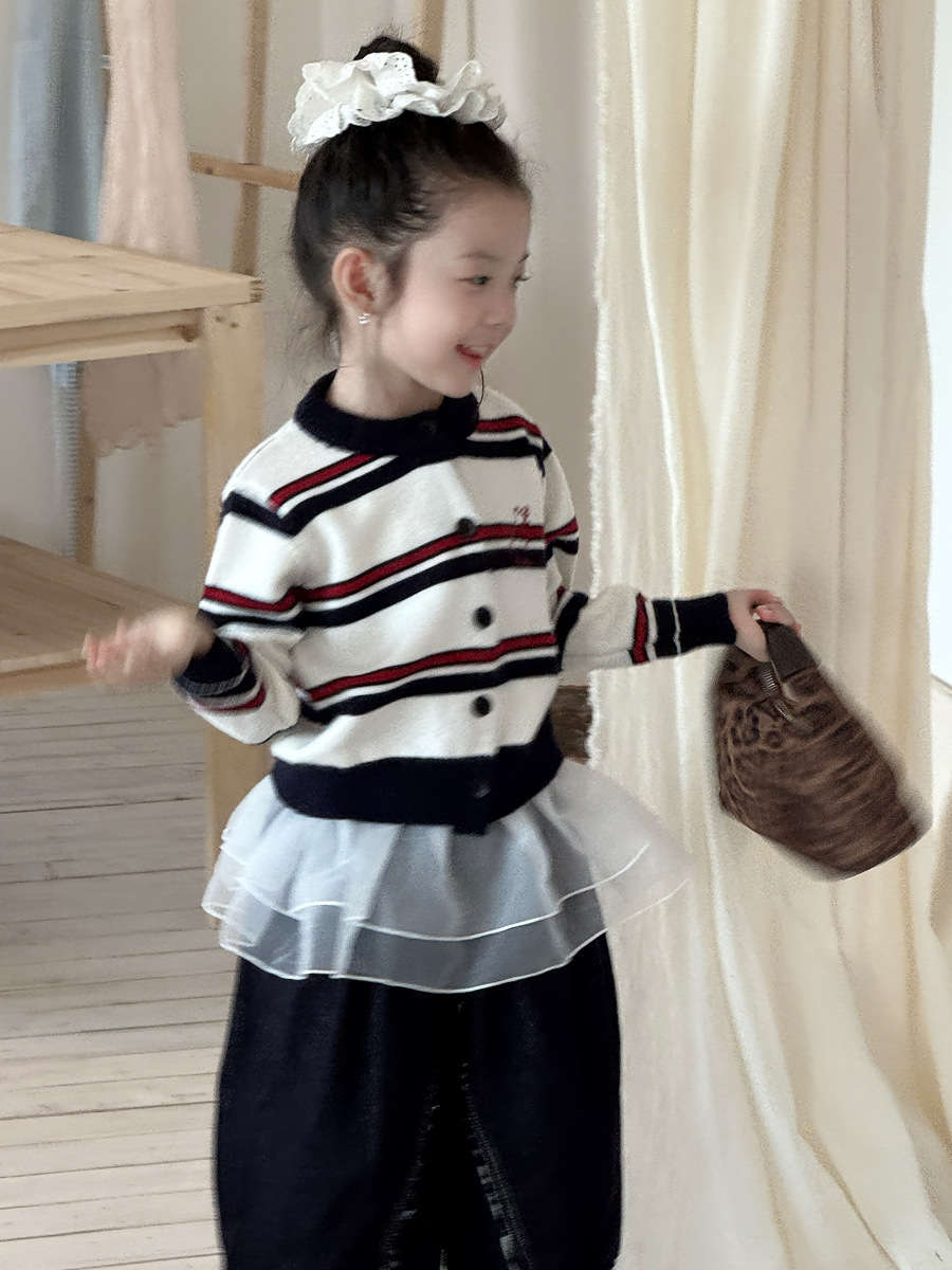 Yuyu 공주 소녀 가을 미국 컬러 블록 스트라이프 자카드 강아지 라운드 넥 니트 카디건 아동 스웨터 재킷