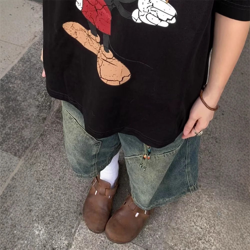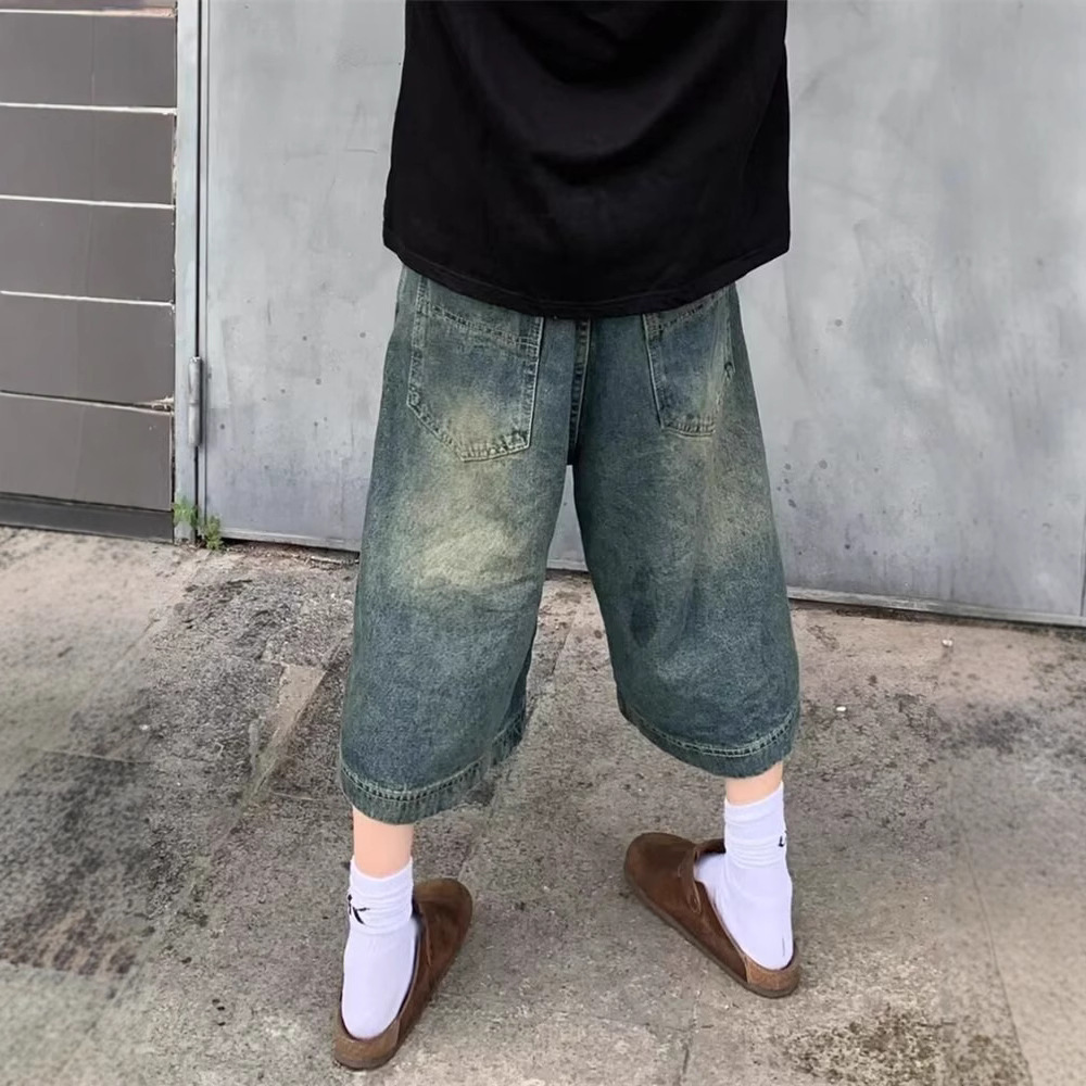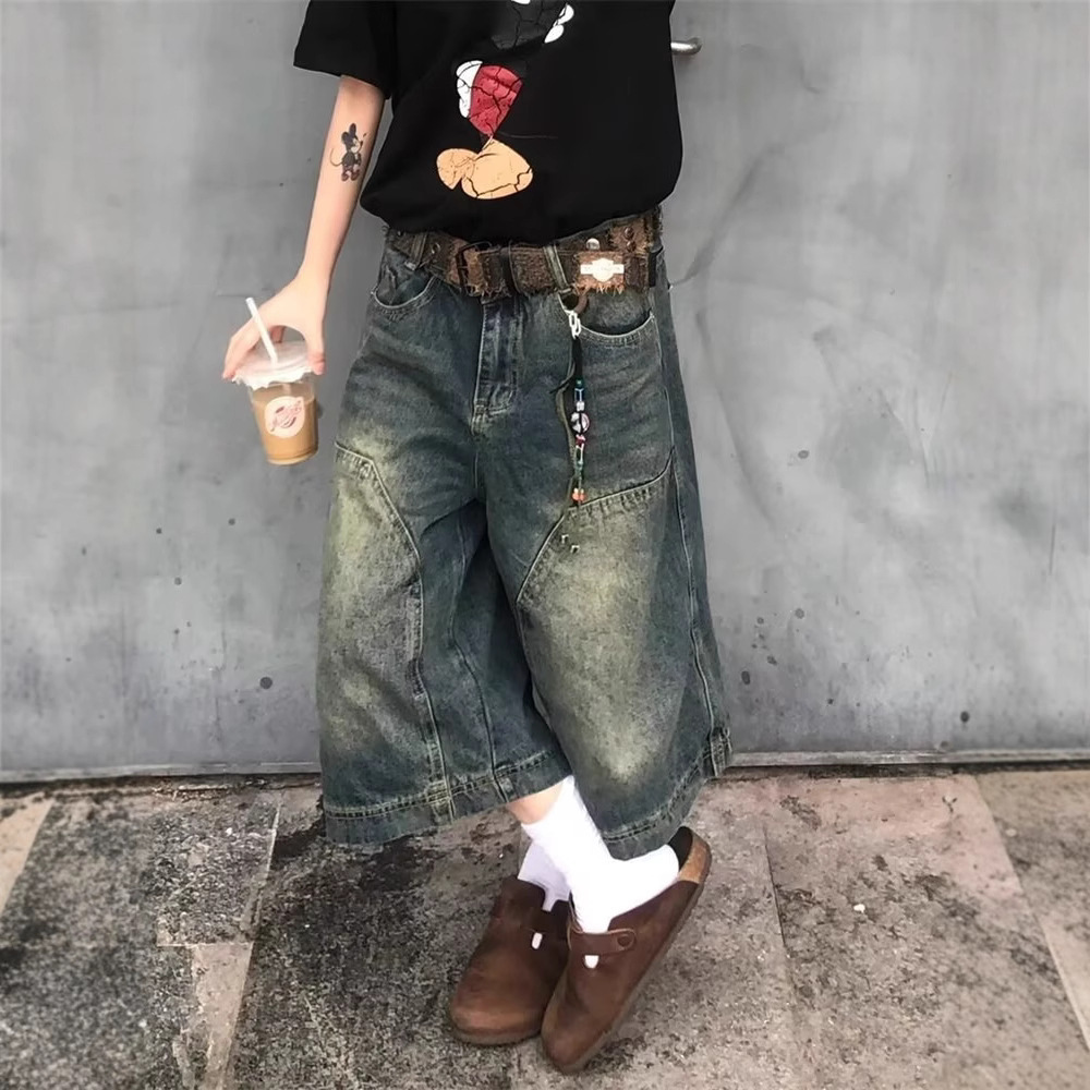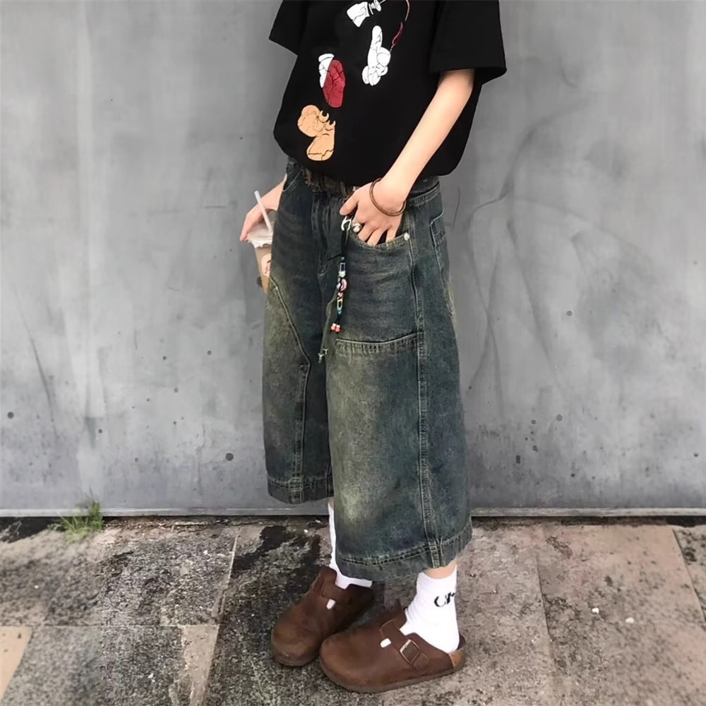 아메리칸 스트리트 워싱 디스트레스드 스플라이스 데님 미드팬츠 여름 다용도 루즈 남녀공용 와이드 레그 크롭 미드팬츠 트렌디스토어 가기