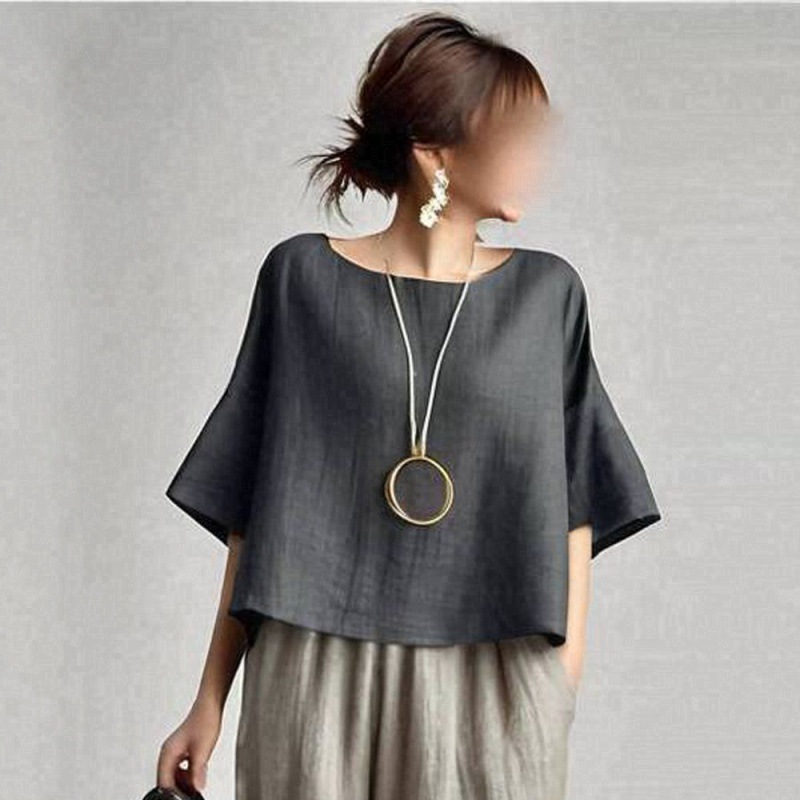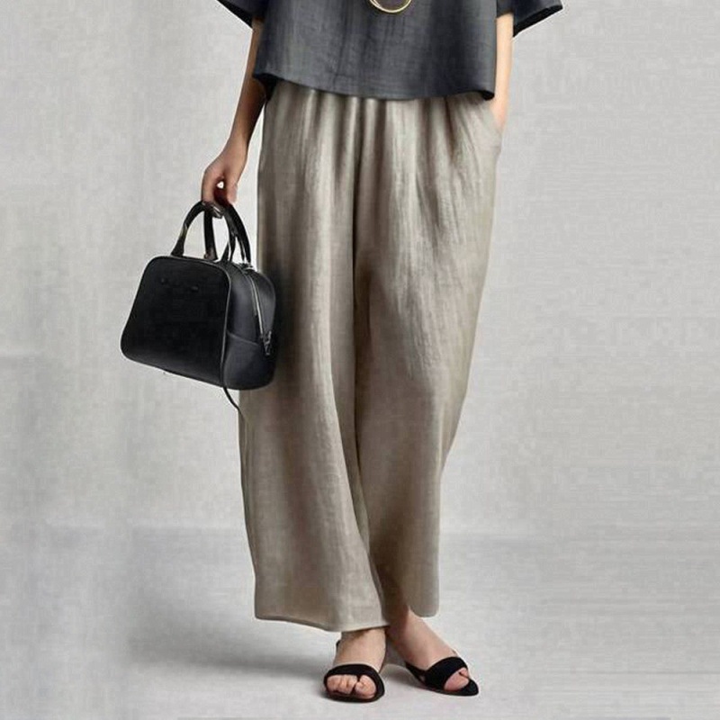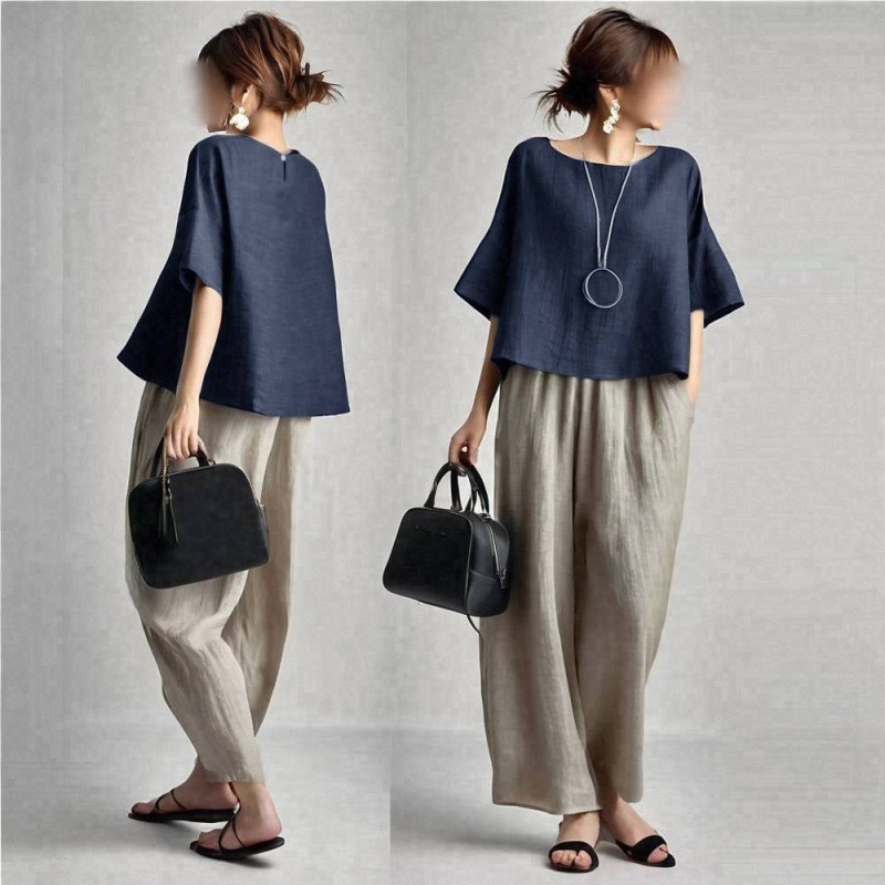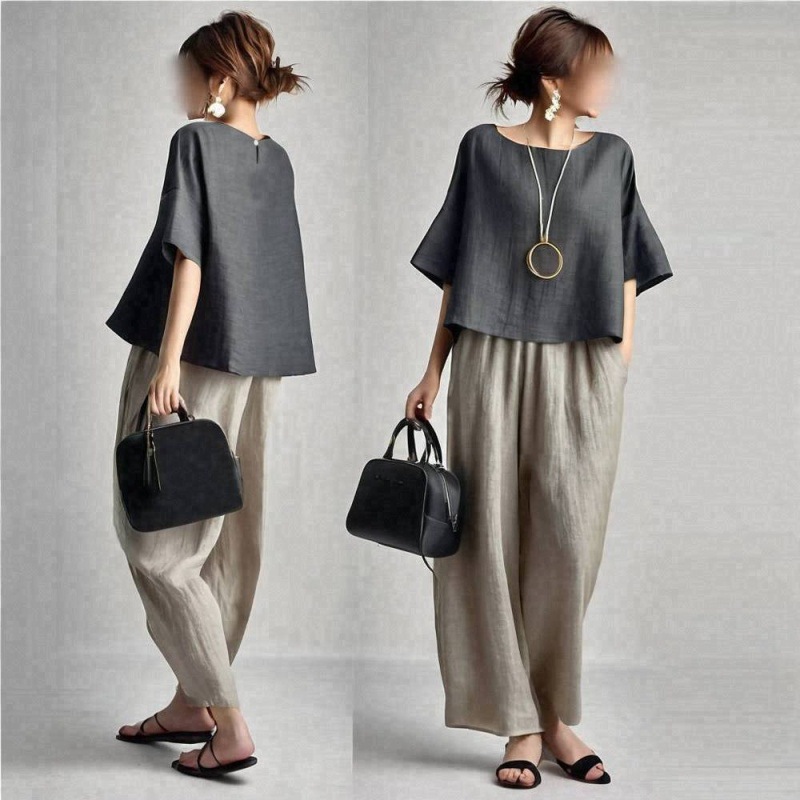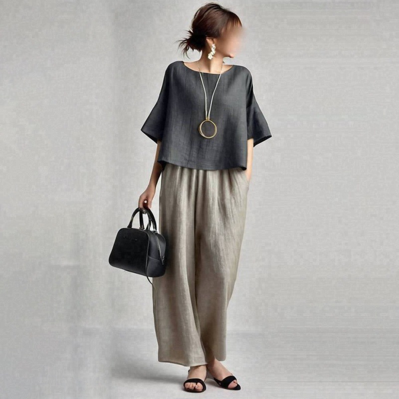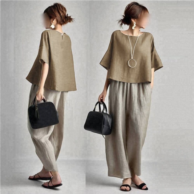 국경을 넘는 여성복 일본&한국 2026 여름 신상품 라운드넥 중간소매 상의+양쪽 포켓 와이드 팬츠 투피스 세트 트렌디스토어 가기