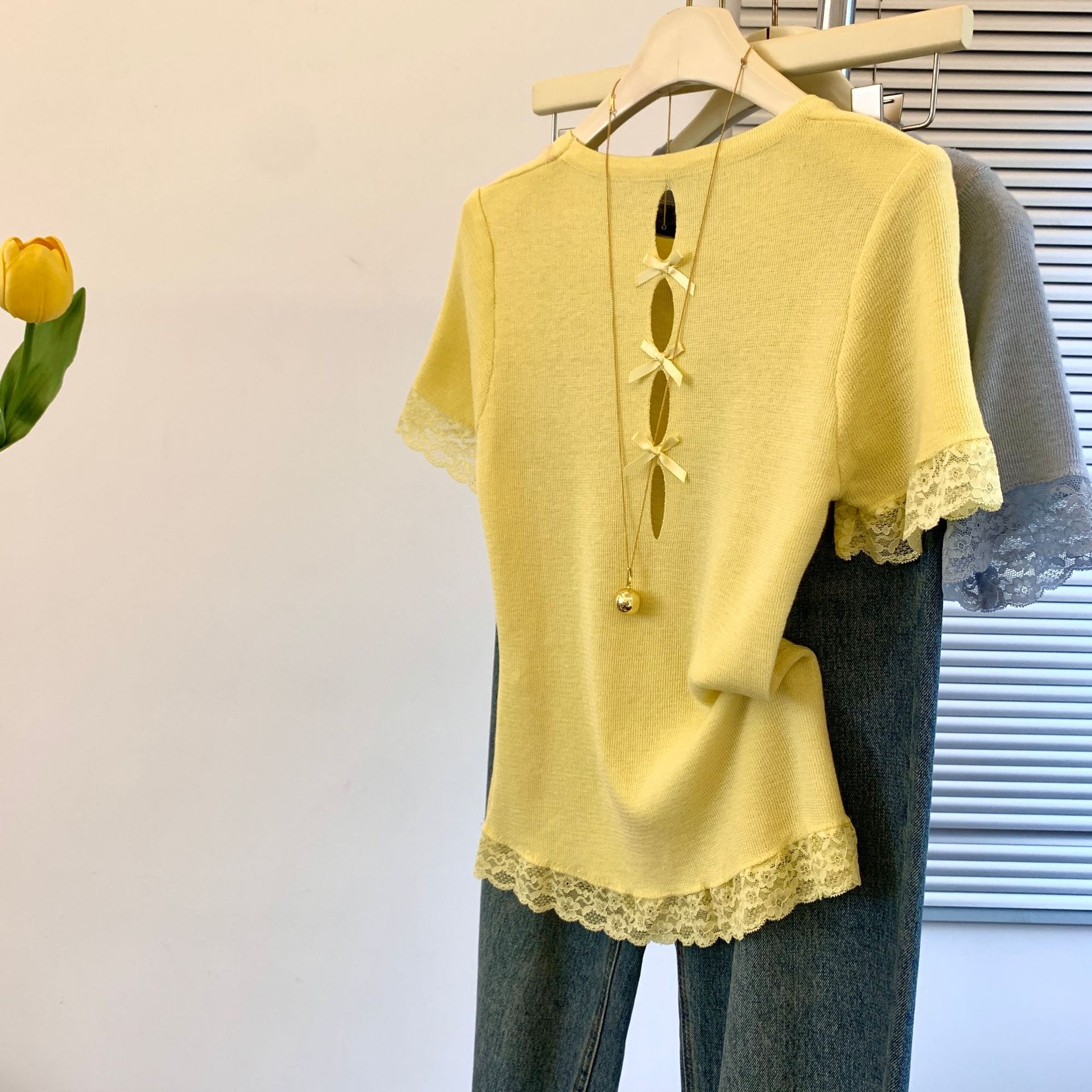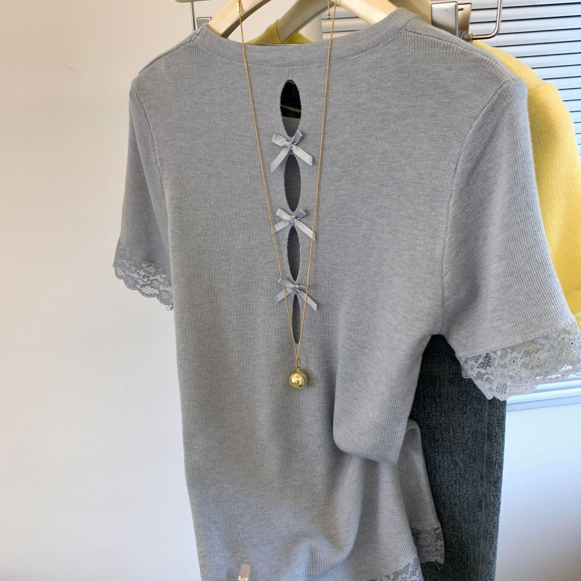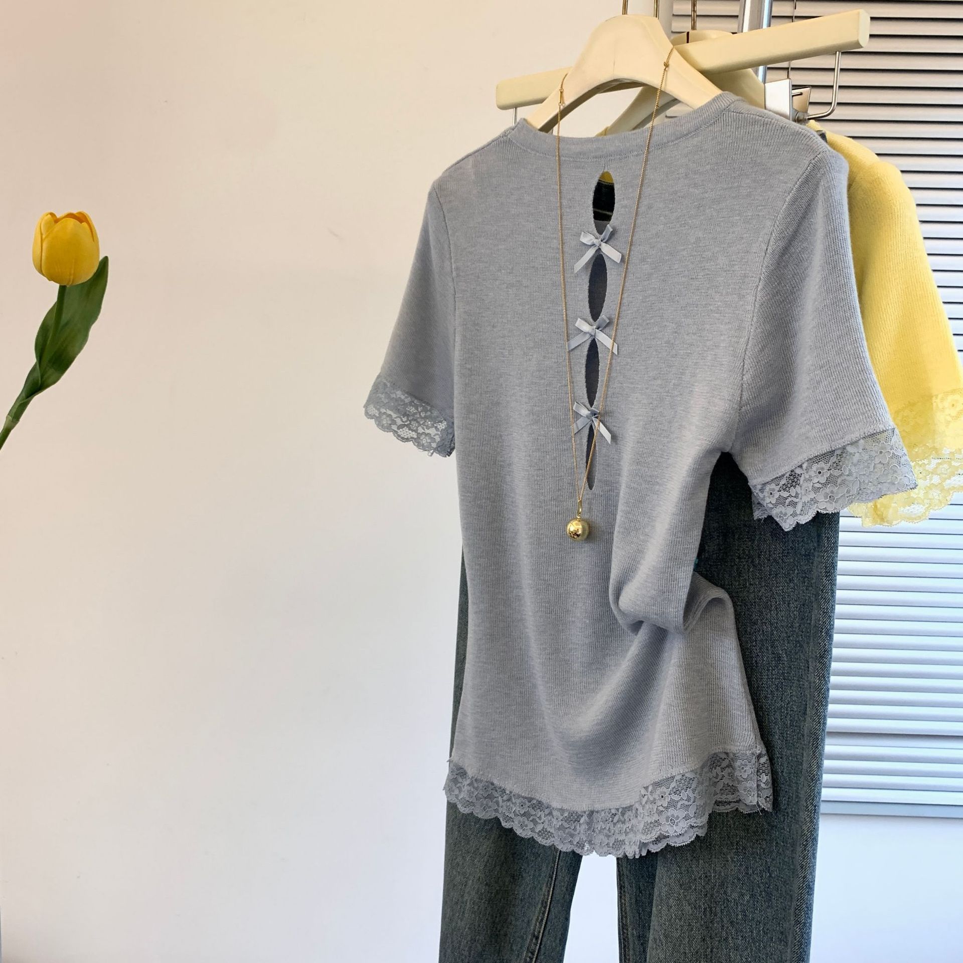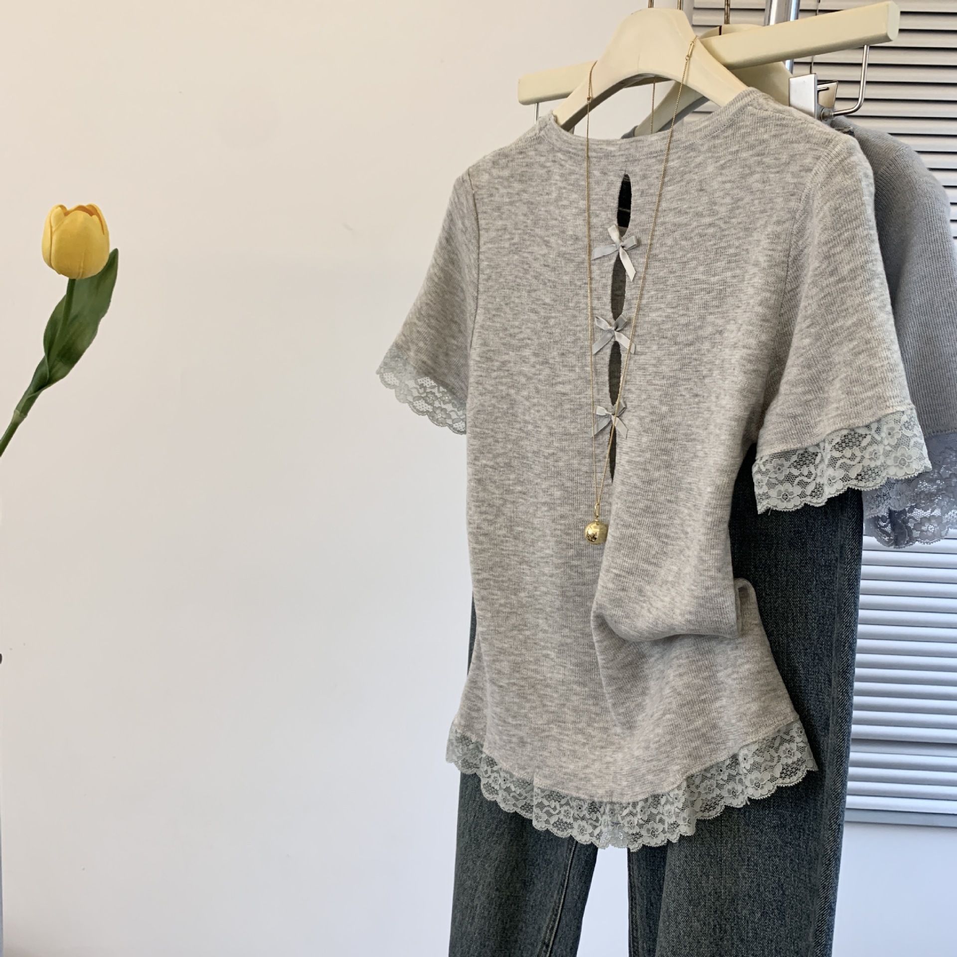 여름 여성을 위한 그레이 섹시한 레이스 스플라이스 반팔 티셔츠, 작은 사이즈, 등이 속이 빈 리본, 오른쪽 어깨 슬리밍 탑스토어 가기