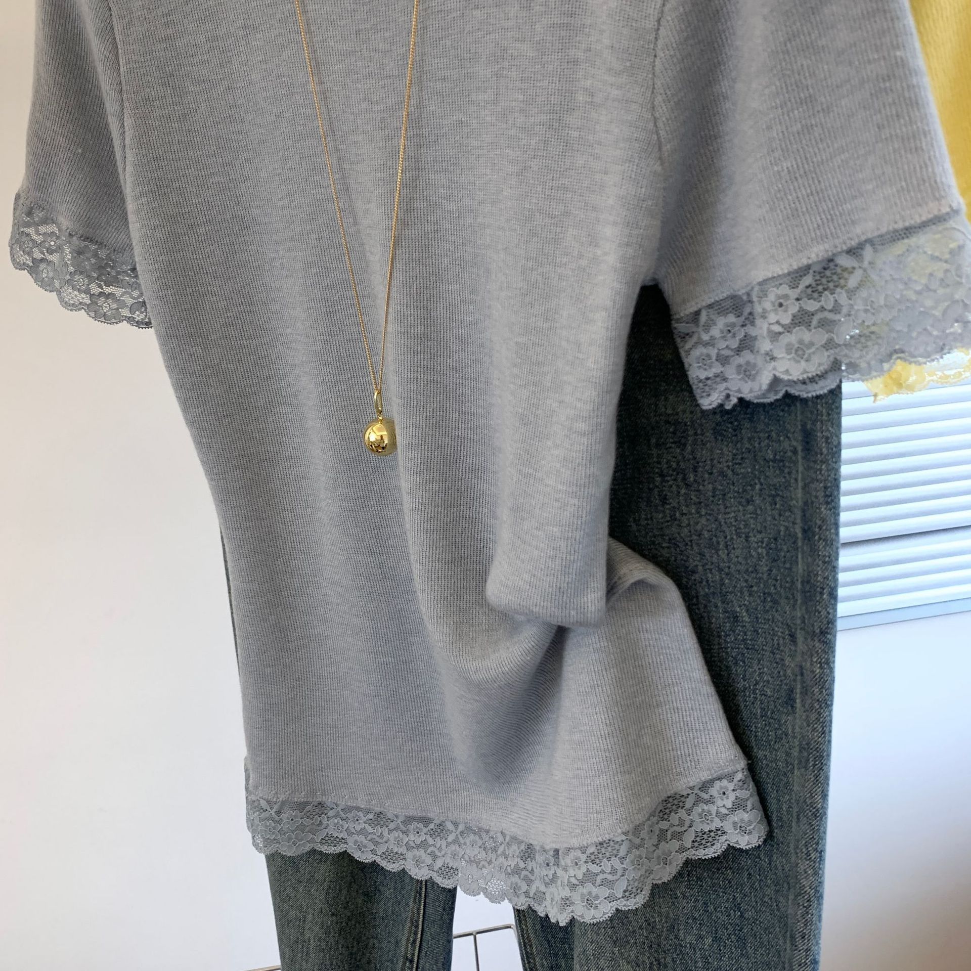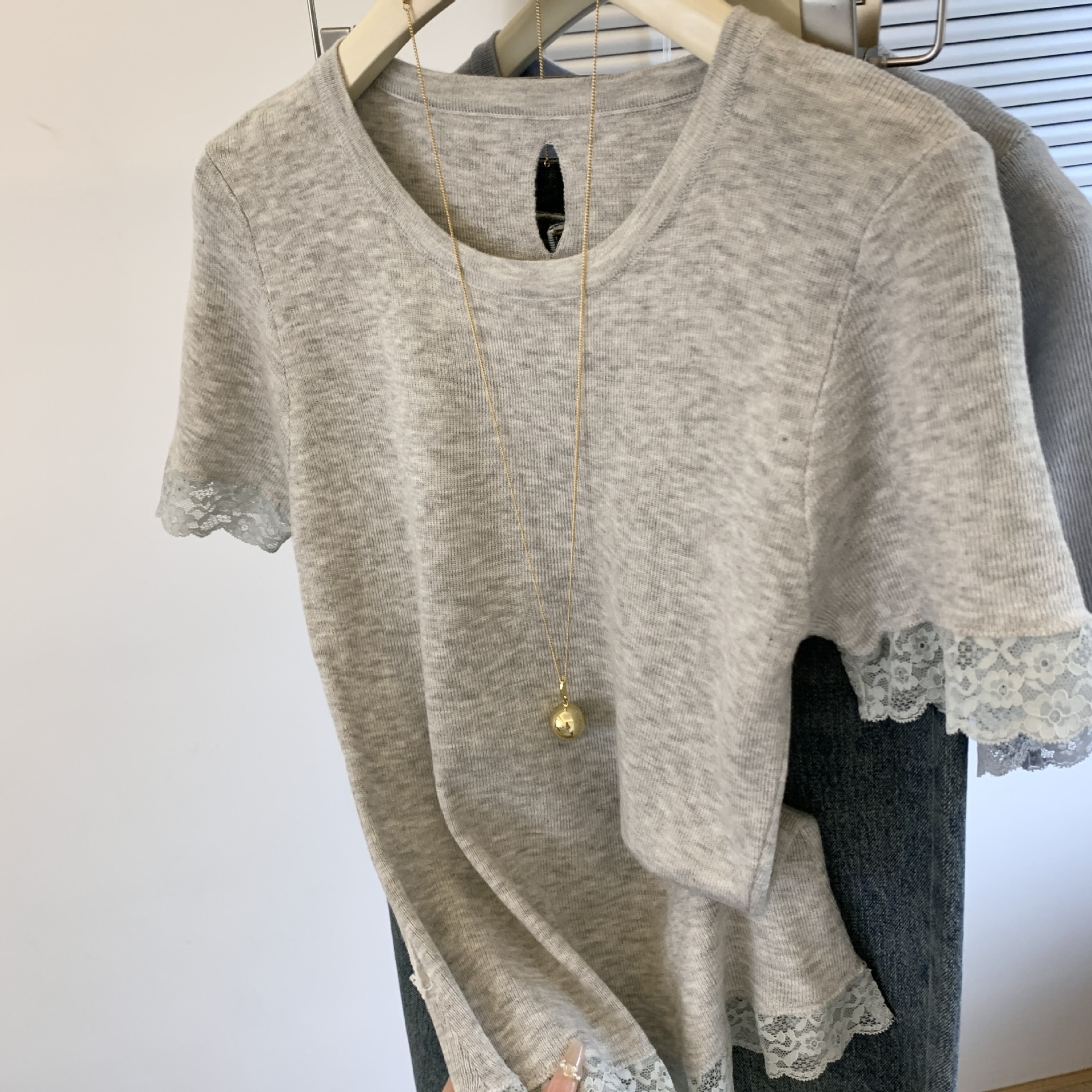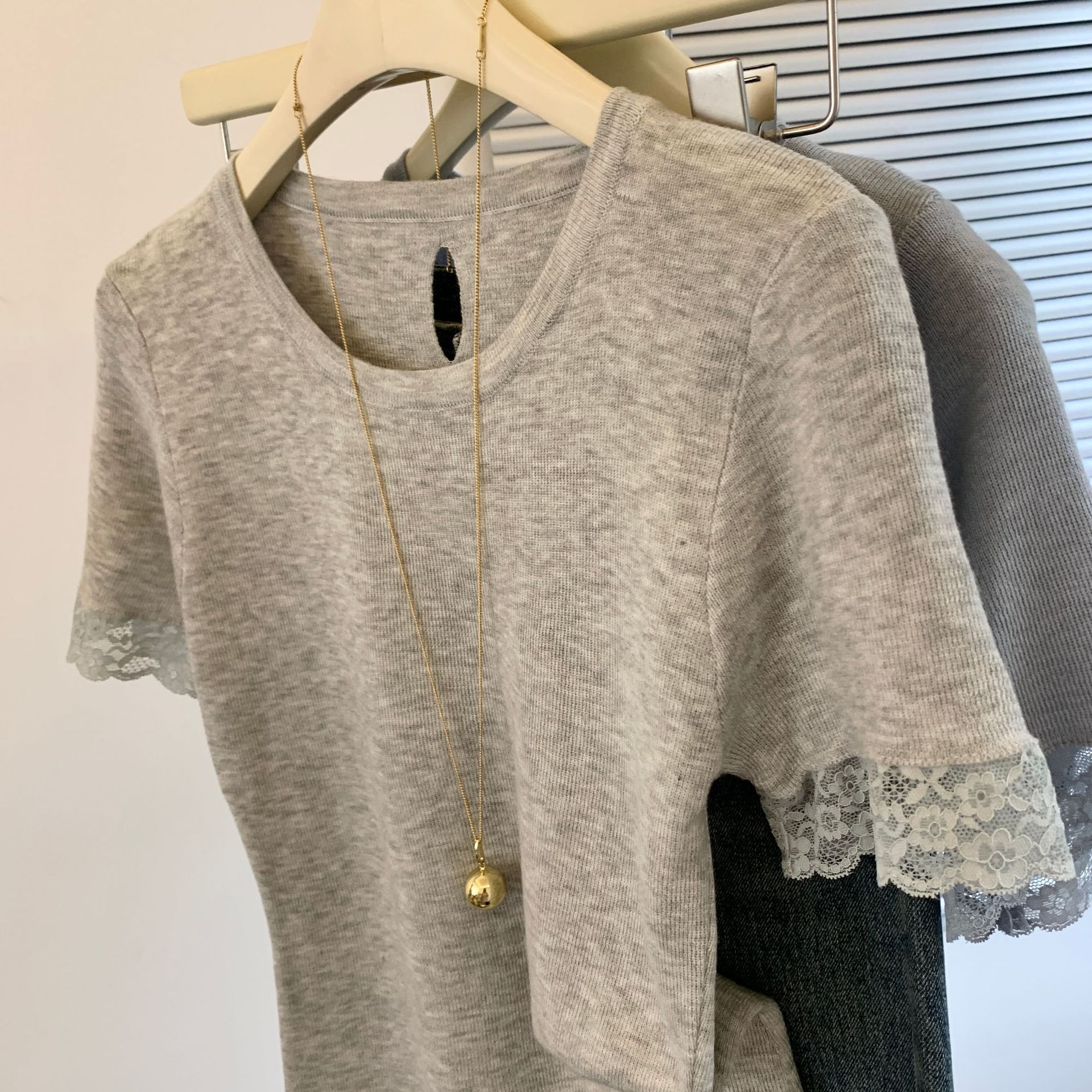 여름 여성을 위한 그레이 섹시한 레이스 스플라이스 반팔 티셔츠, 작은 사이즈, 등이 속이 빈 리본, 오른쪽 어깨 슬리밍 탑스토어 가기