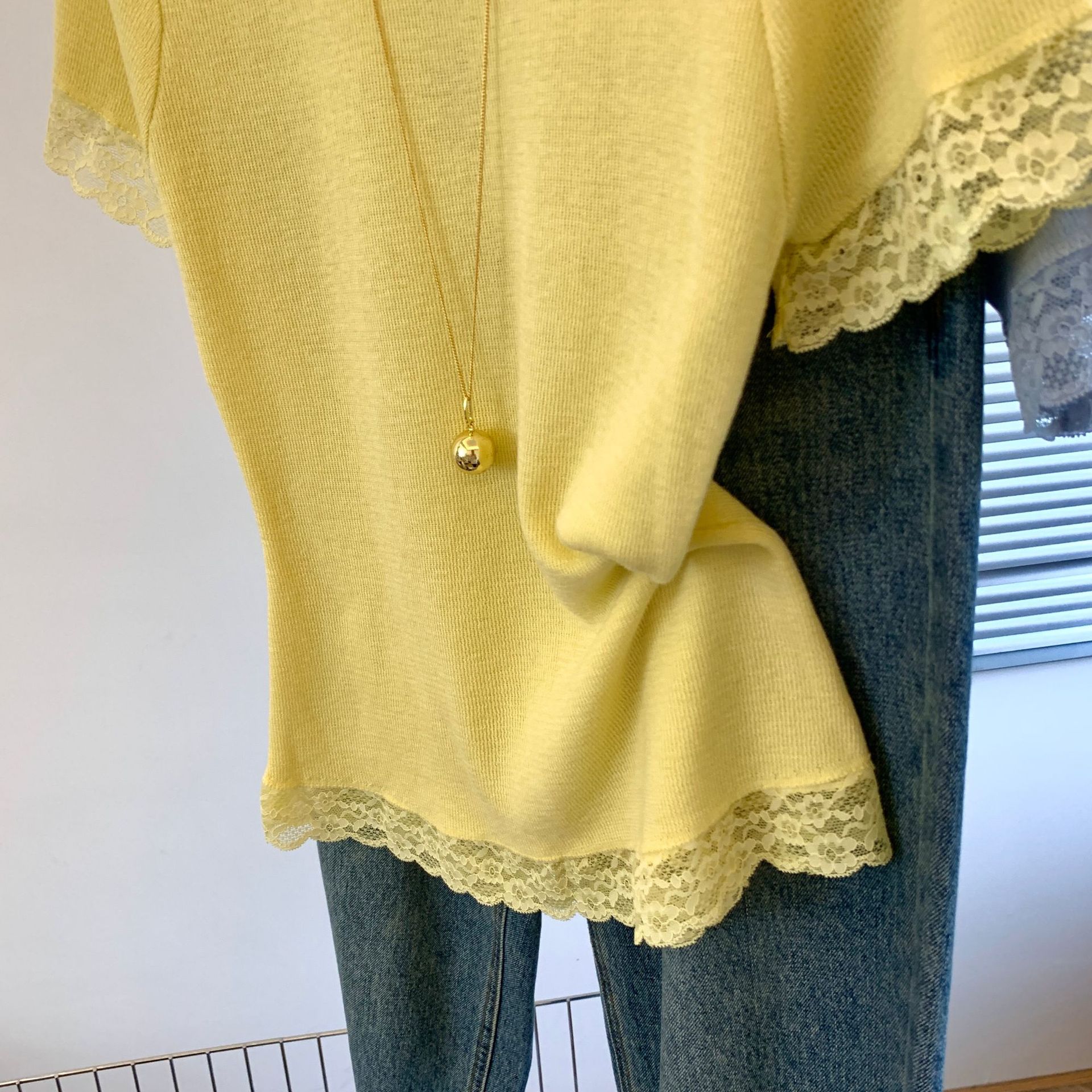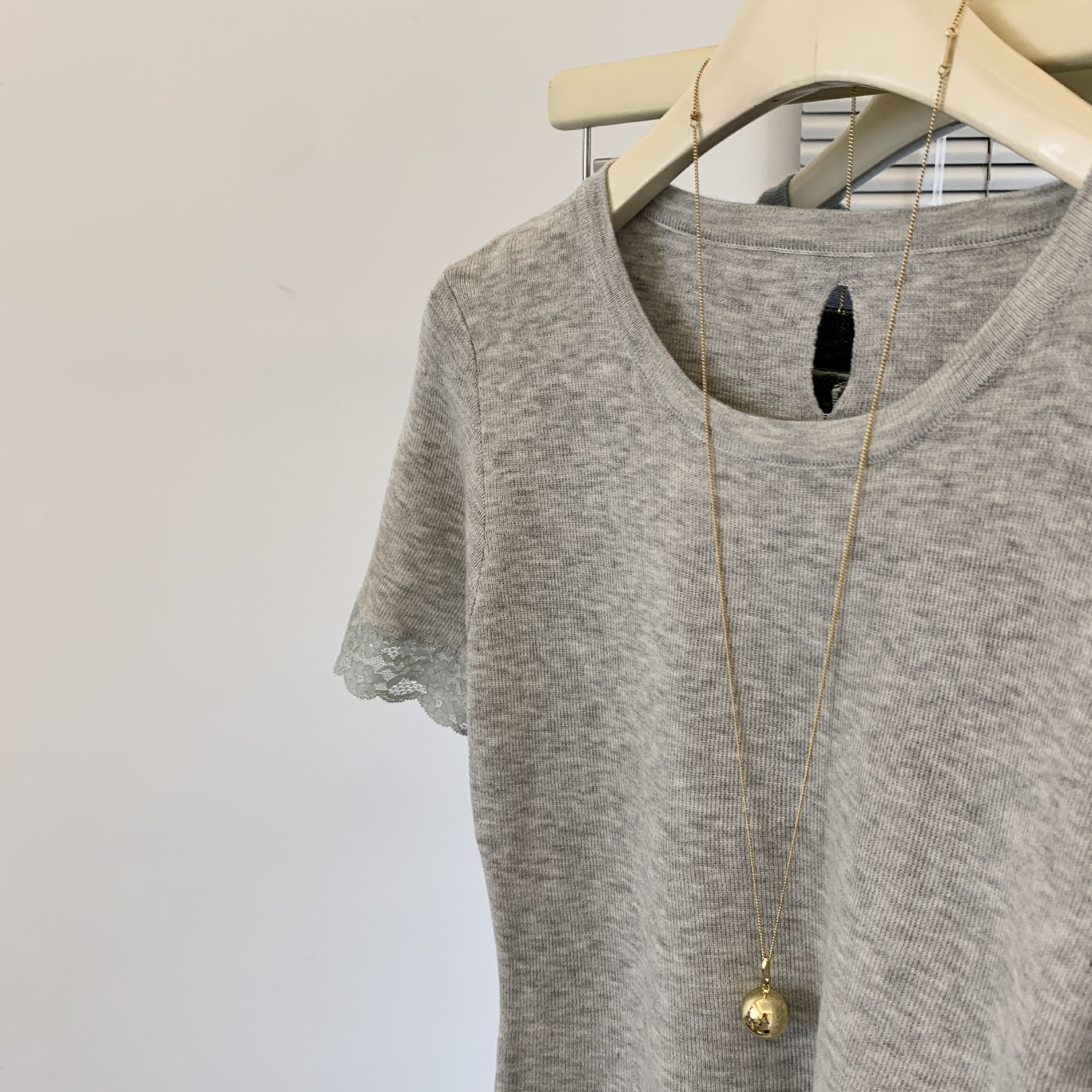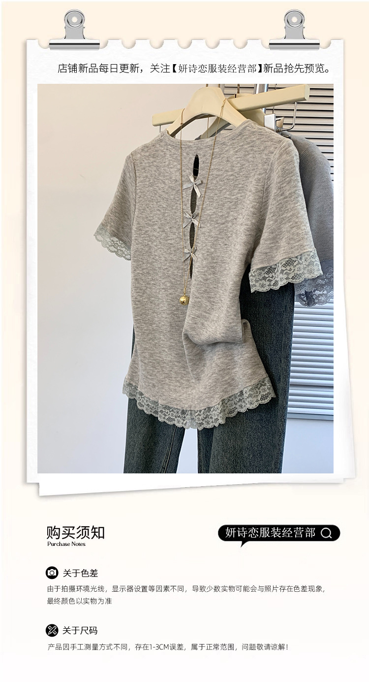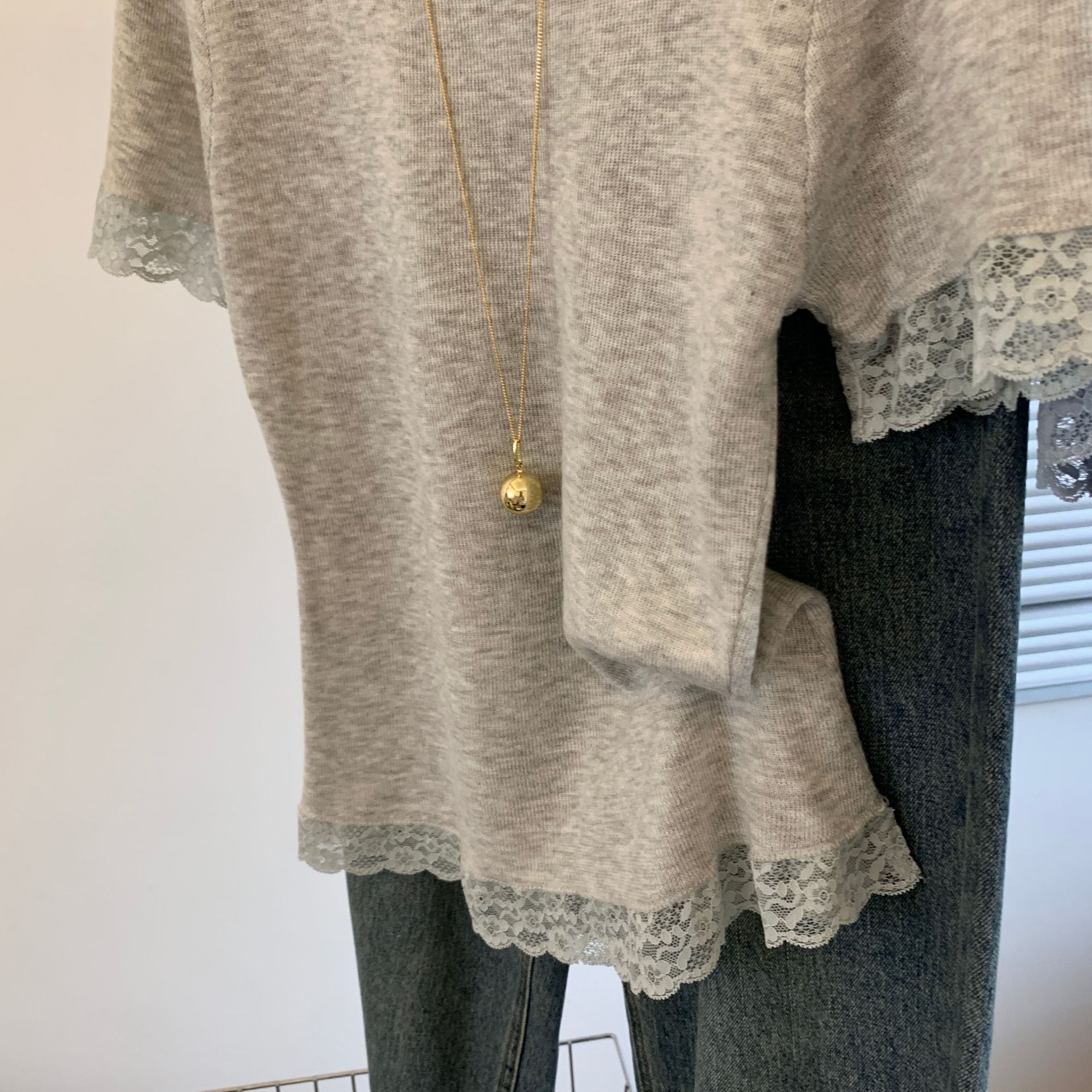 여름 여성을 위한 그레이 섹시한 레이스 스플라이스 반팔 티셔츠, 작은 사이즈, 등이 속이 빈 리본, 오른쪽 어깨 슬리밍 탑스토어 가기