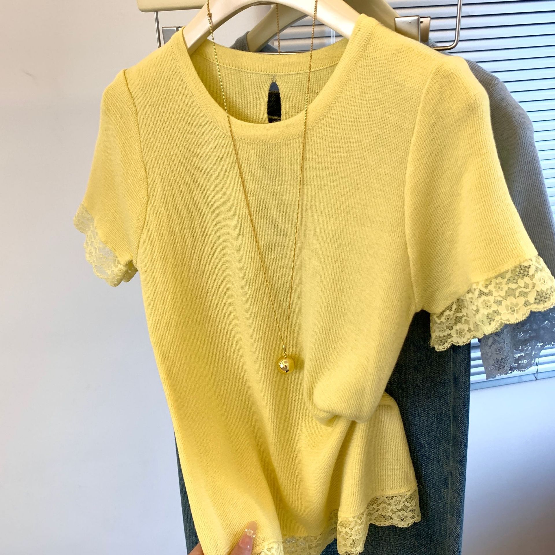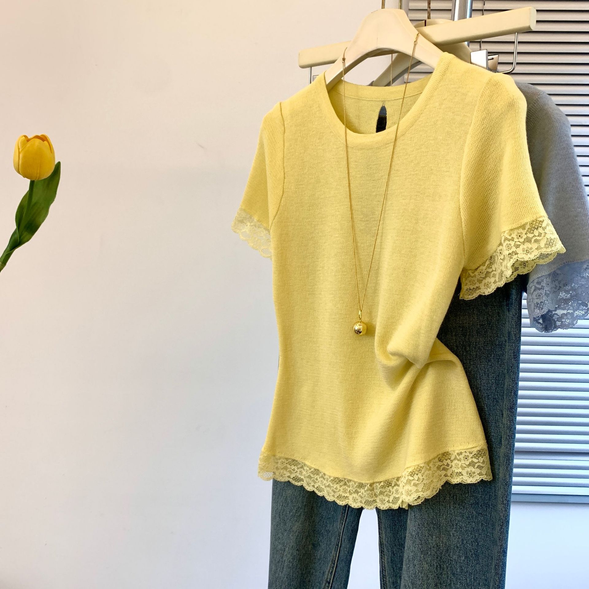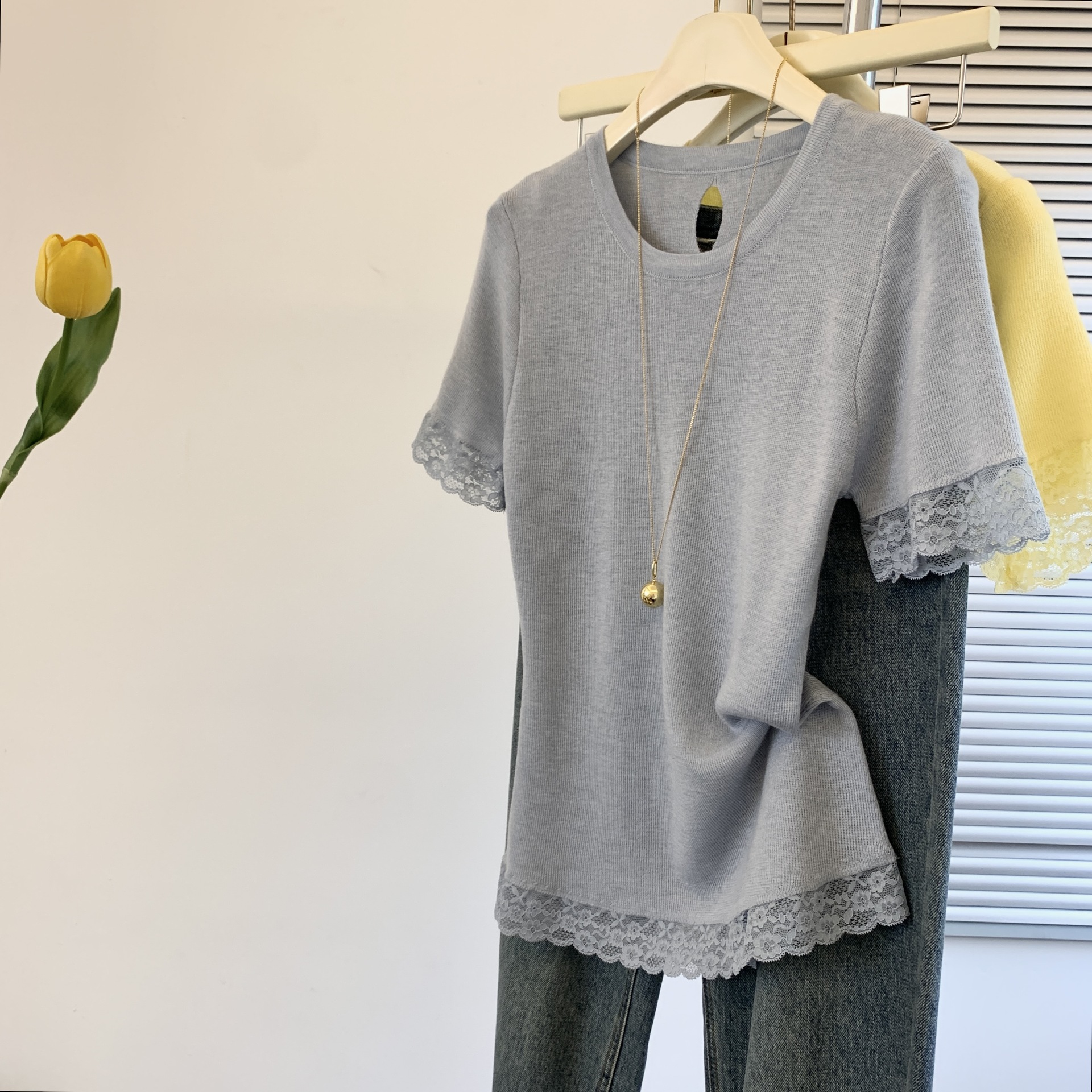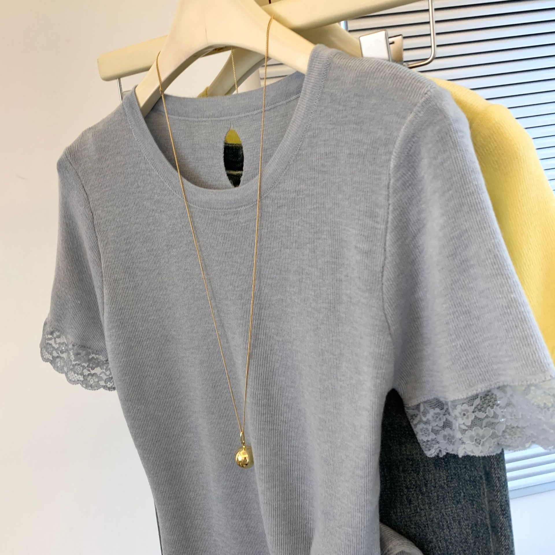 여름 여성을 위한 그레이 섹시한 레이스 스플라이스 반팔 티셔츠, 작은 사이즈, 등이 속이 빈 리본, 오른쪽 어깨 슬리밍 탑