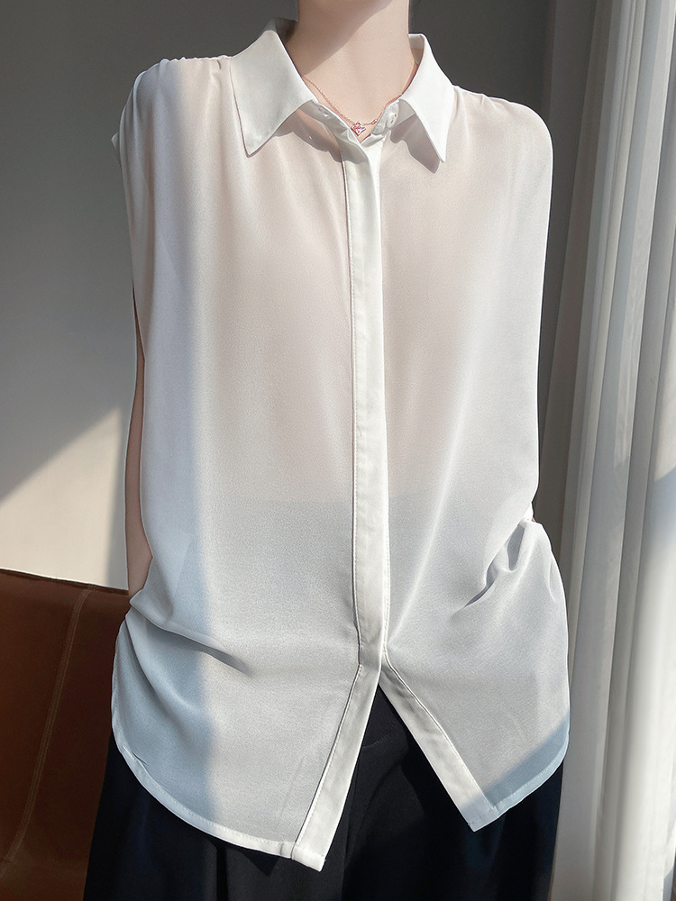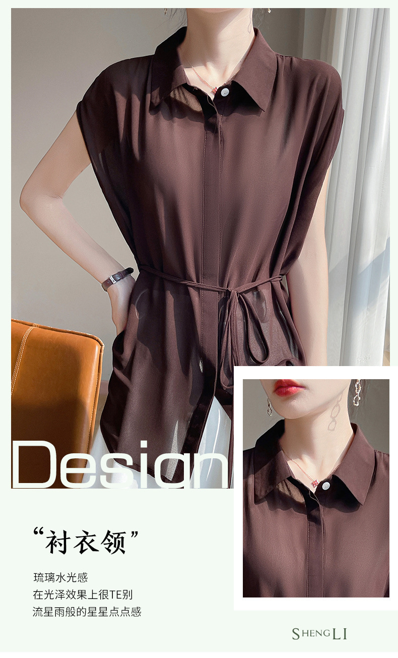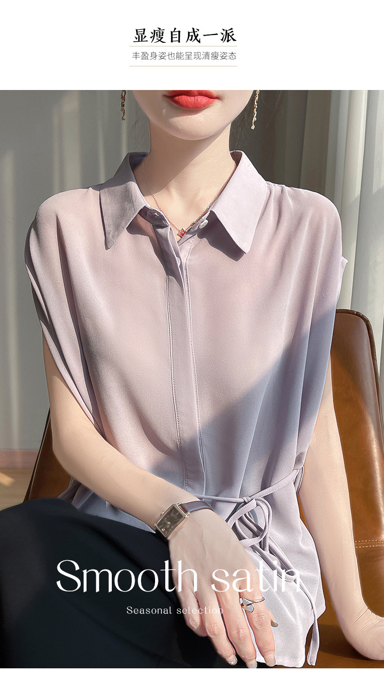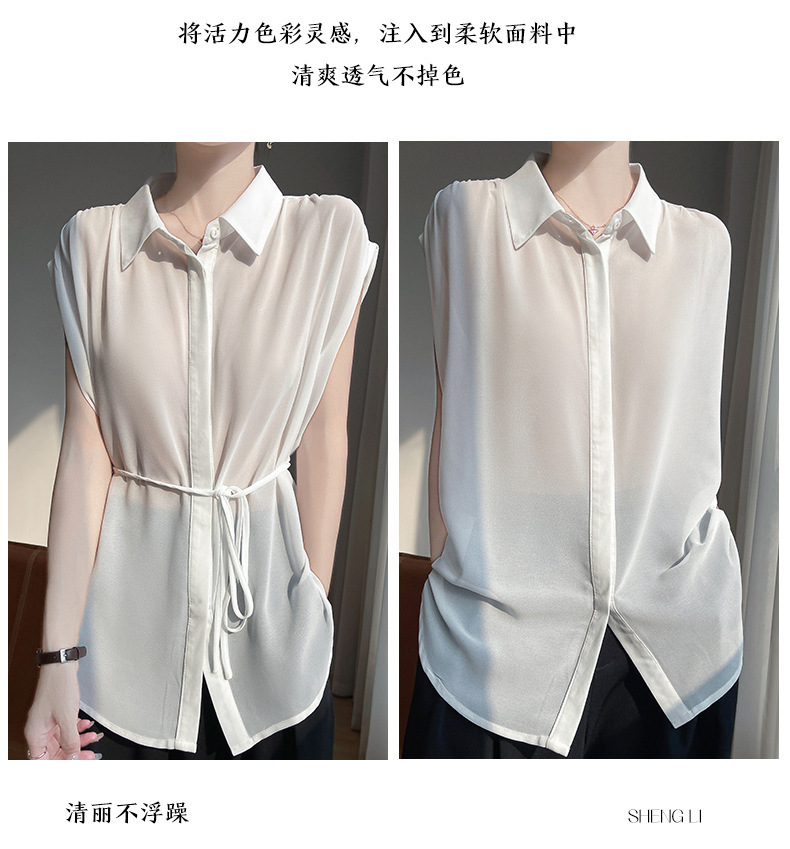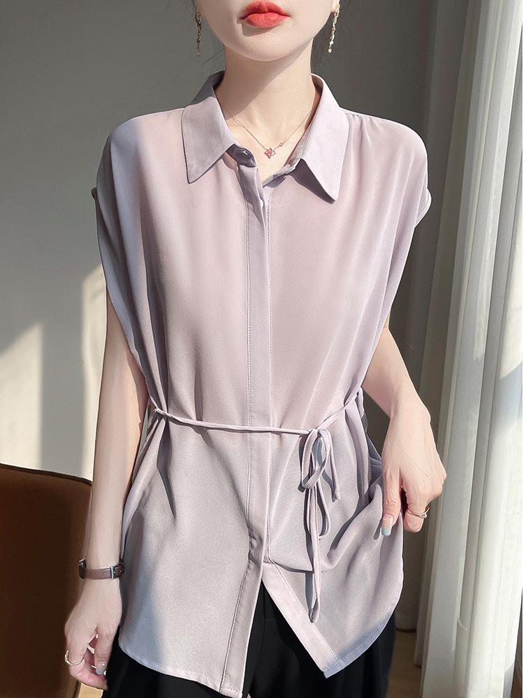 시원한 얇은 조젯 탑 폴로 칼라 여성 레이스 업 디자인 슬림핏 솔리드 컬러 민소매 셔츠 트렌디