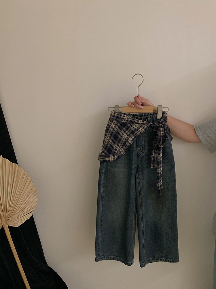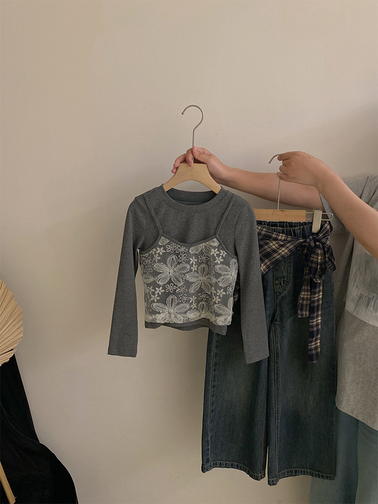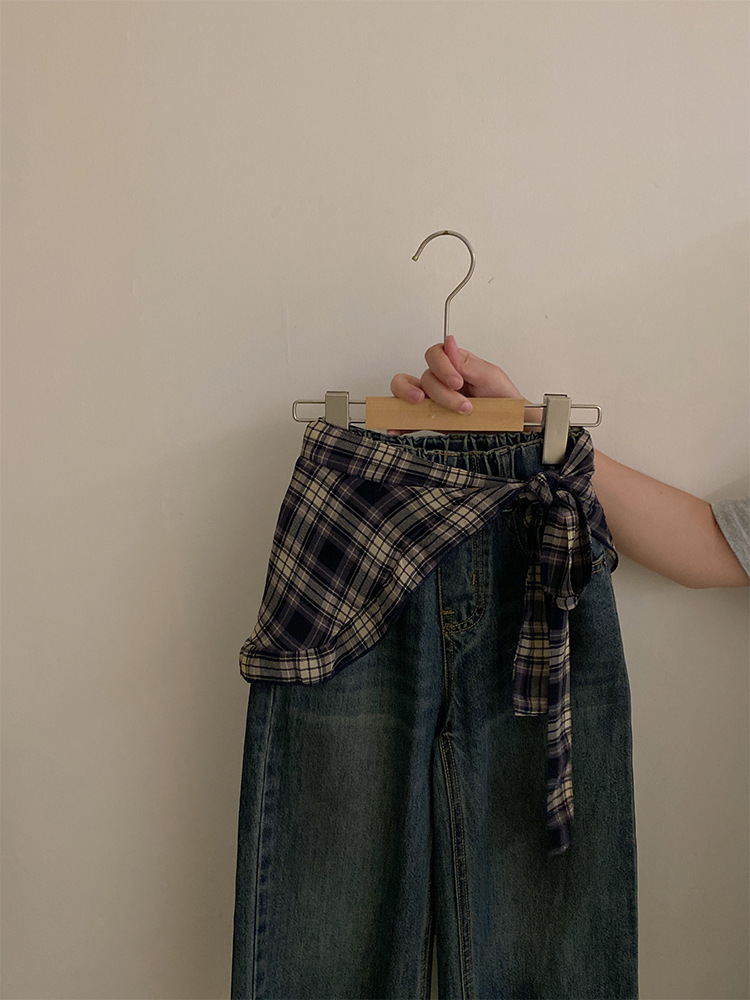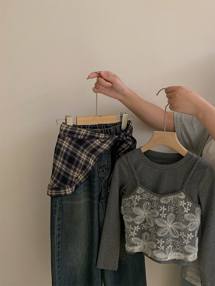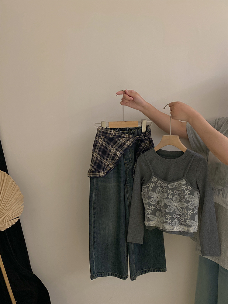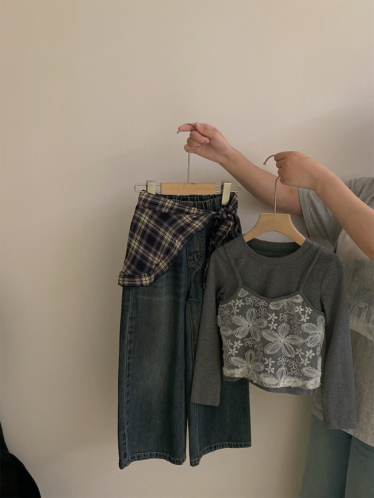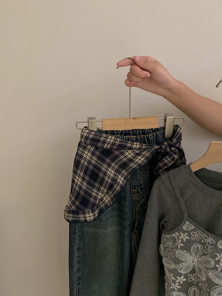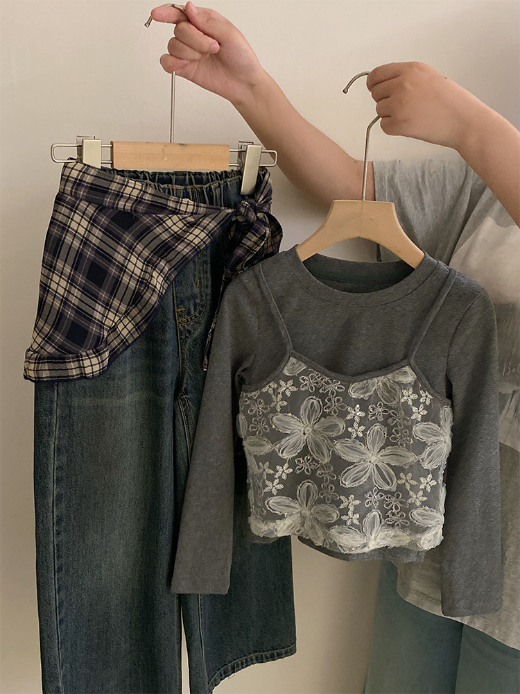 여자 한국 스타일 가을 새로운 레이스 꽃 가짜 투피스 탑 2025 격자 무늬 엉덩이 커튼 캐주얼 청바지 투피스 세트스토어 가기