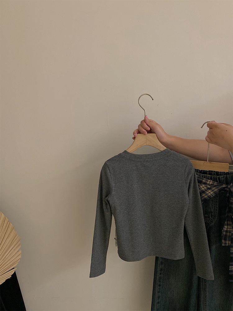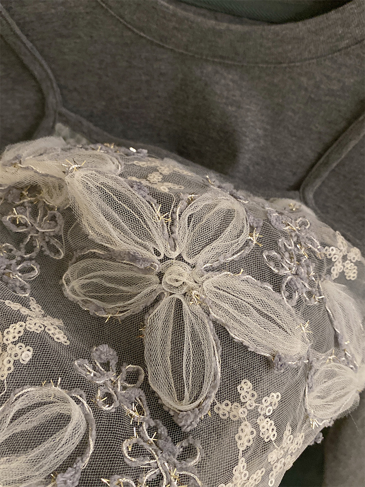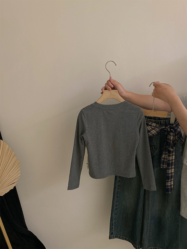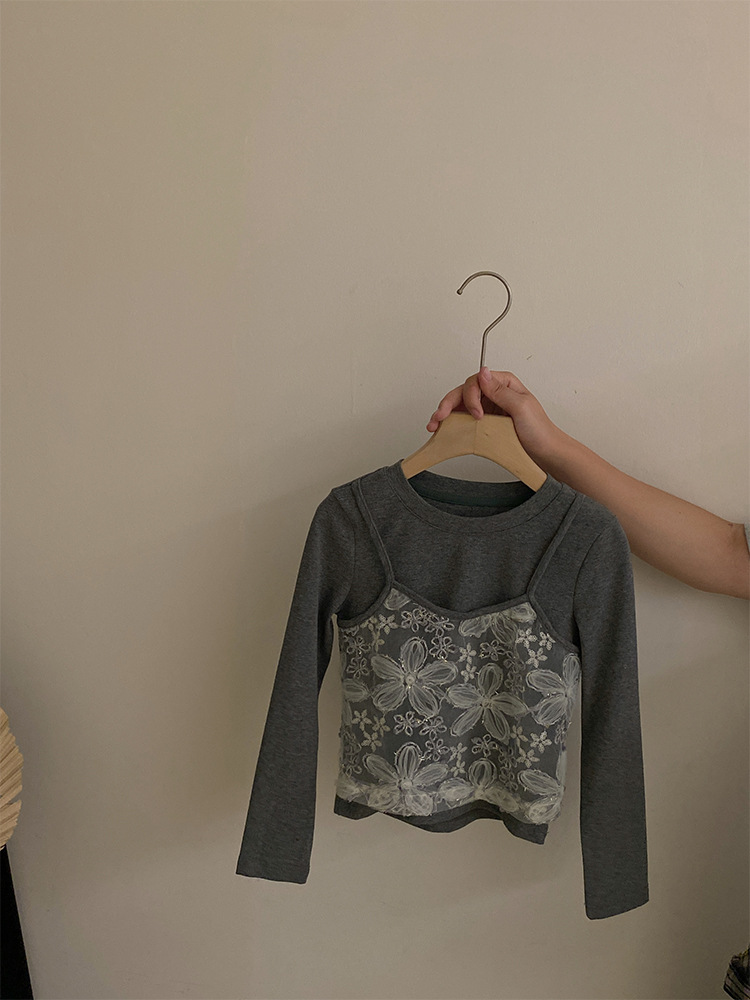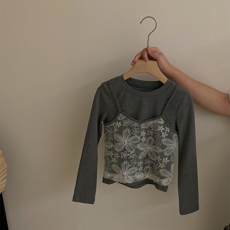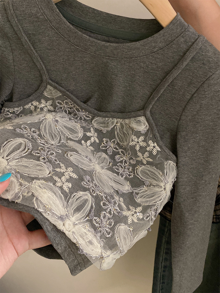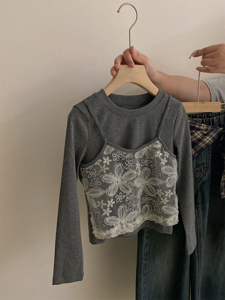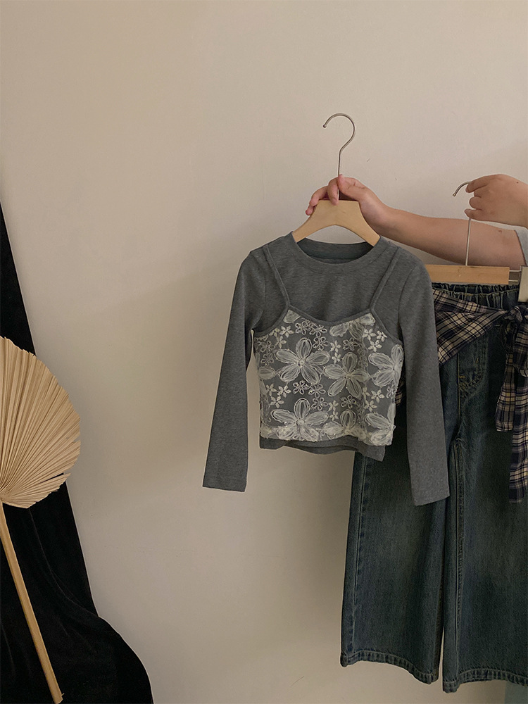 여자 한국 스타일 가을 새로운 레이스 꽃 가짜 투피스 탑 2025 격자 무늬 엉덩이 커튼 캐주얼 청바지 투피스 세트스토어 가기
