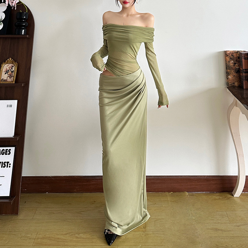2025秋季亚马逊爆款单肩斜领长袖连衣裙欧美跨境女装开叉镂空长裙
