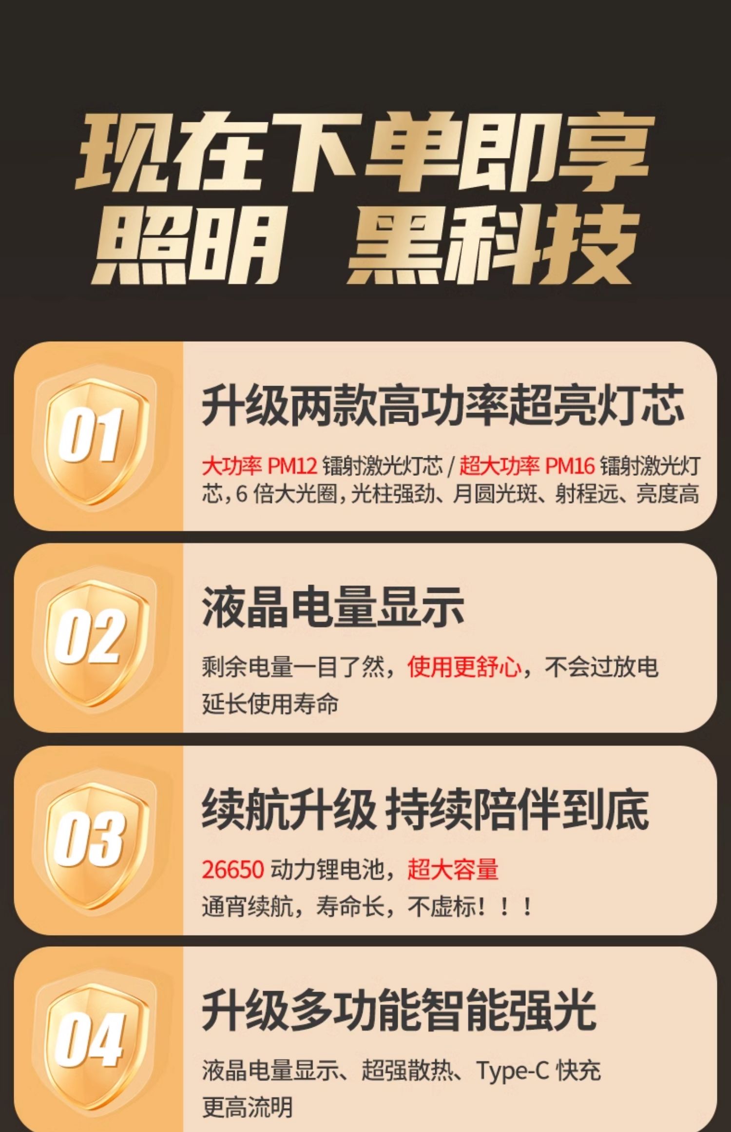 • 플래그십 밝은 레이저, 1전원(4단 전자 디스플레이), 기계식 줌 type-c 고속 충전, 수입 심지