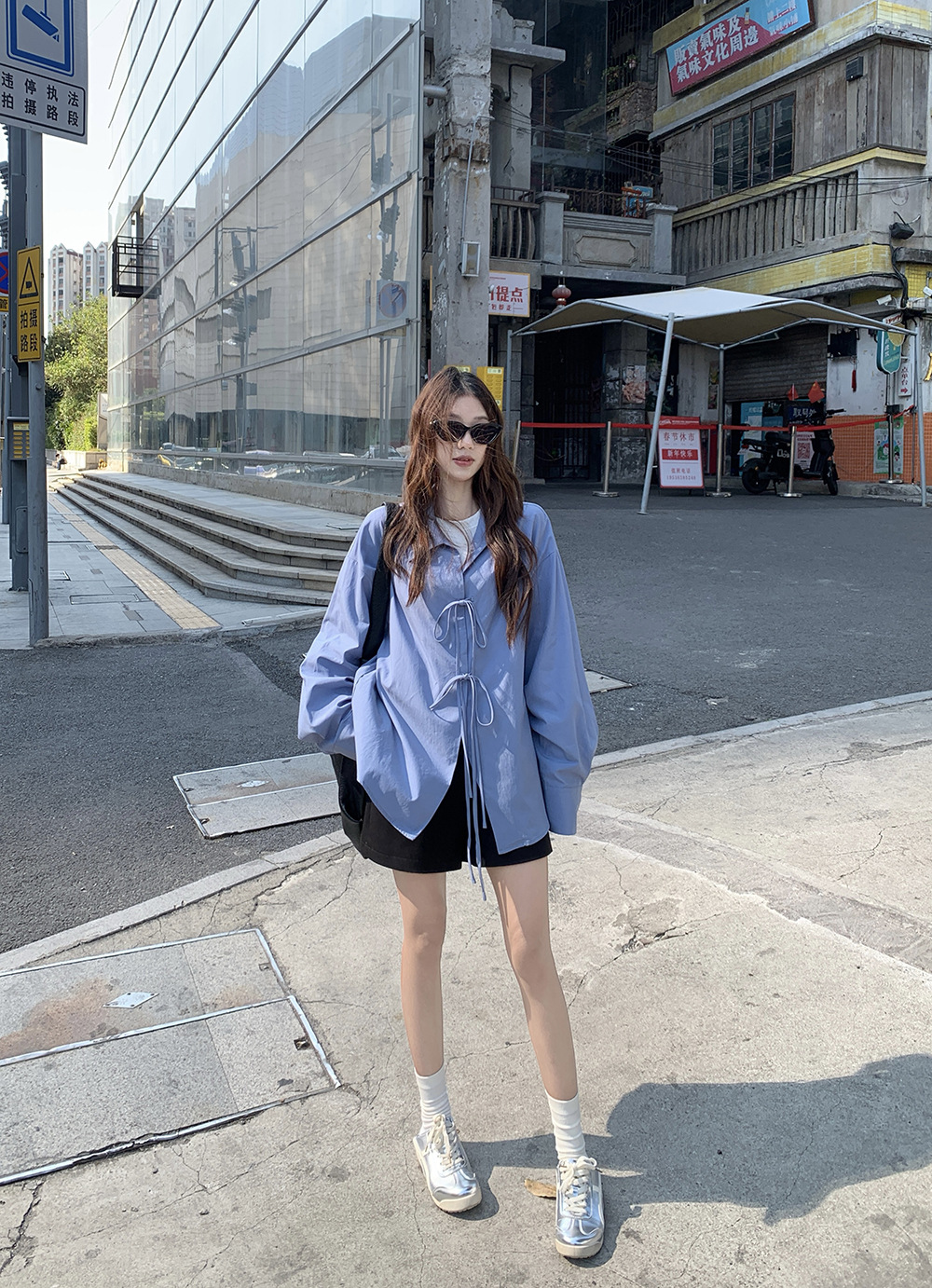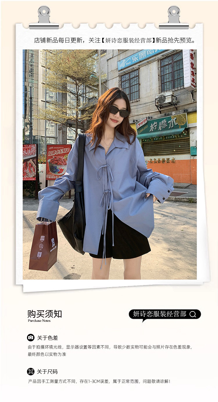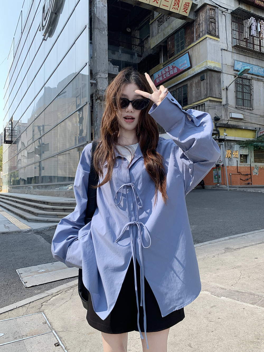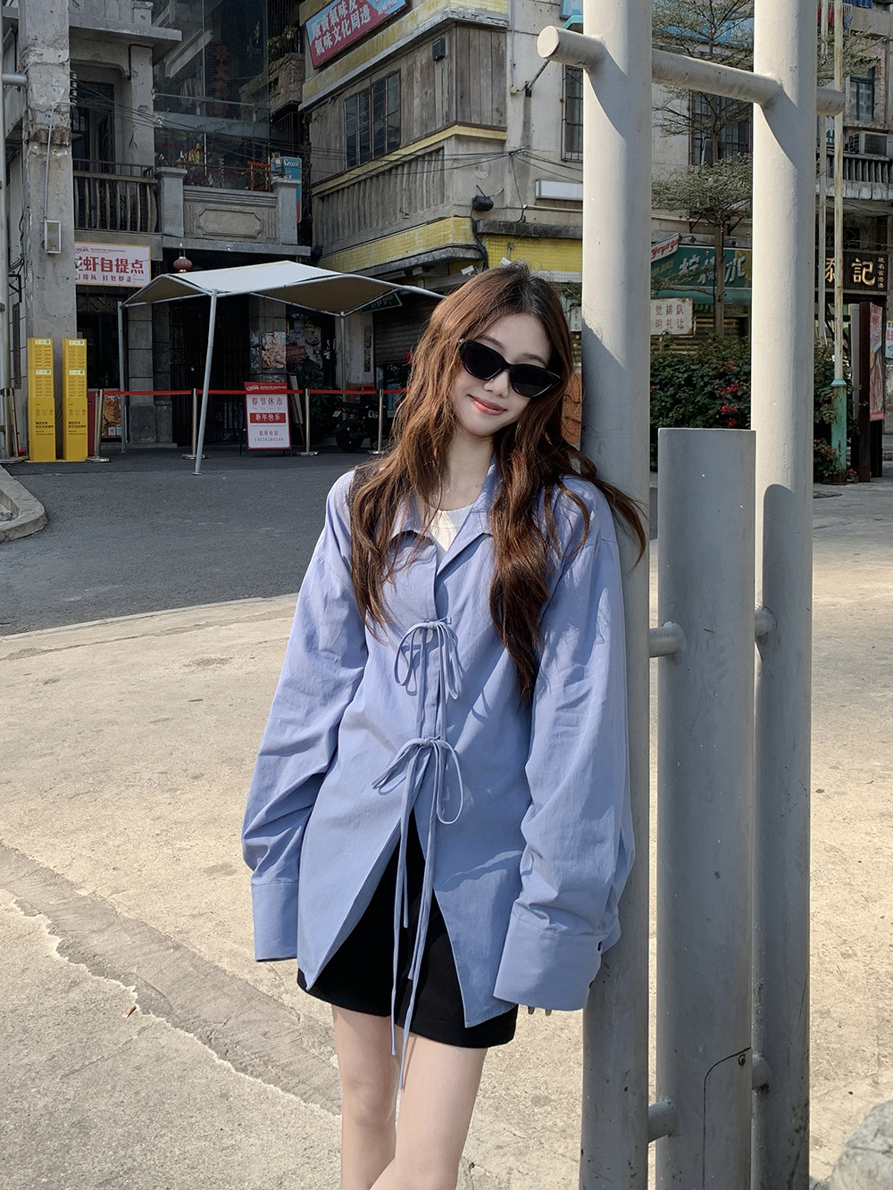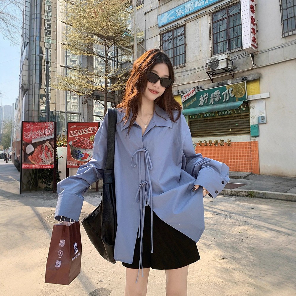 블루 보우 타이 긴 소매 셔츠 여성 여름 캐주얼 루즈 셔츠 얇은 자외선 차단 카디건 자켓 탑스토어 가기