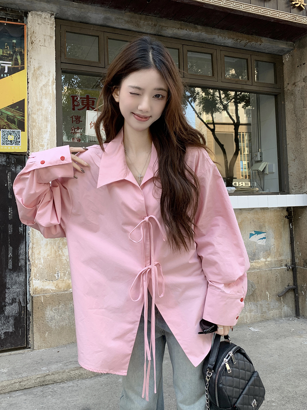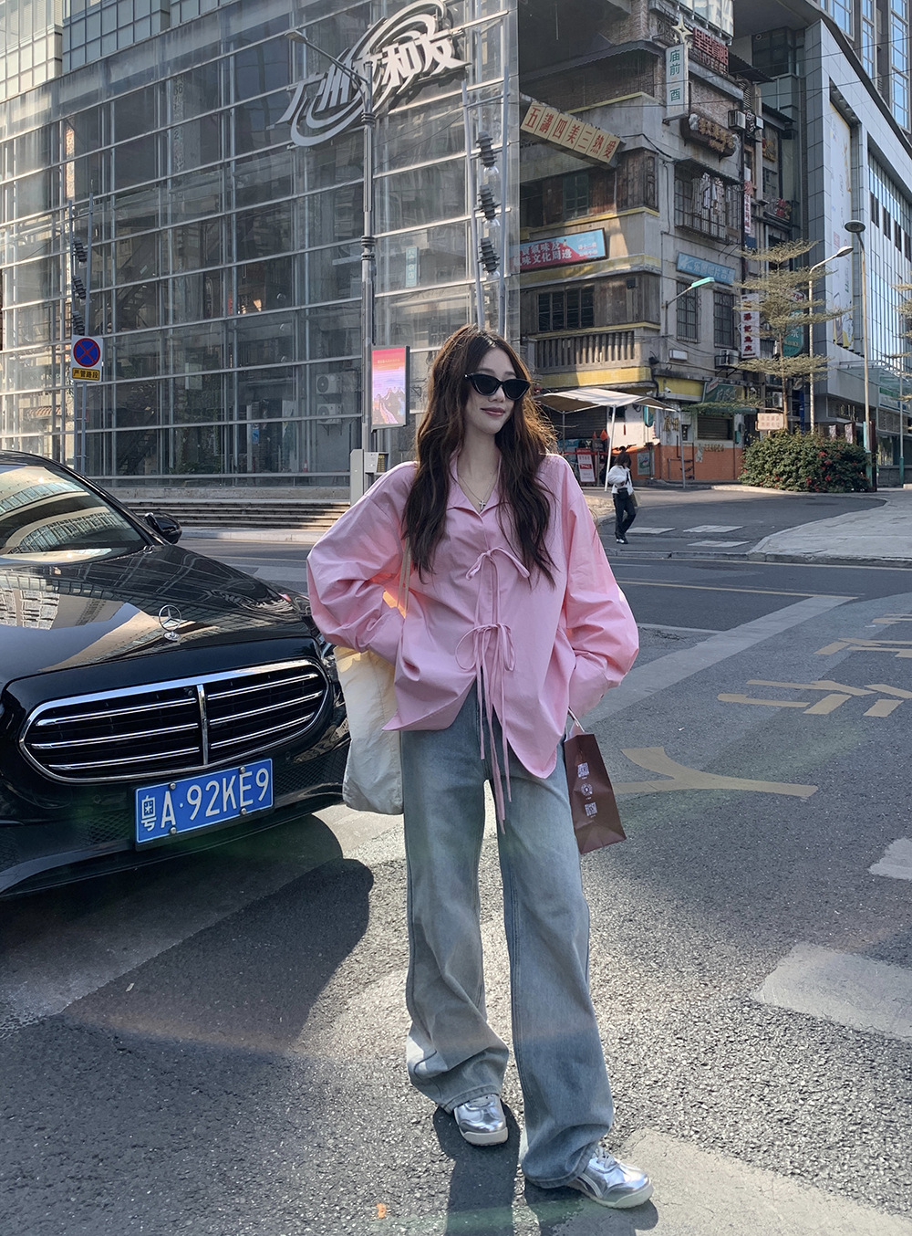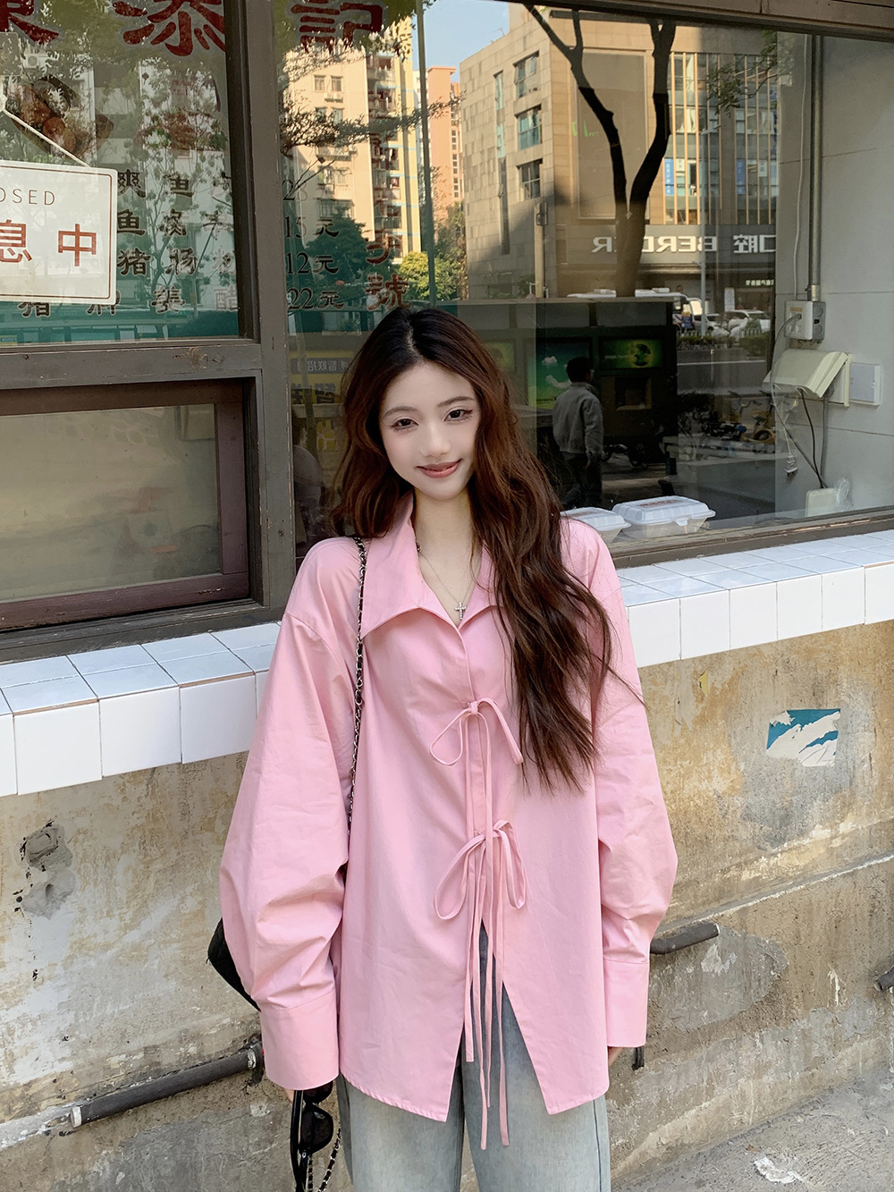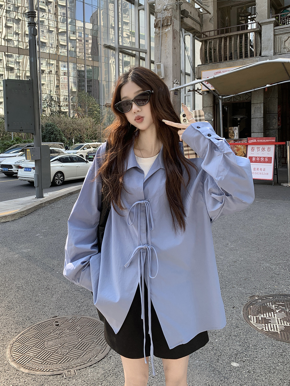 블루 보우 타이 긴 소매 셔츠 여성 여름 캐주얼 루즈 셔츠 얇은 자외선 차단 카디건 자켓 탑