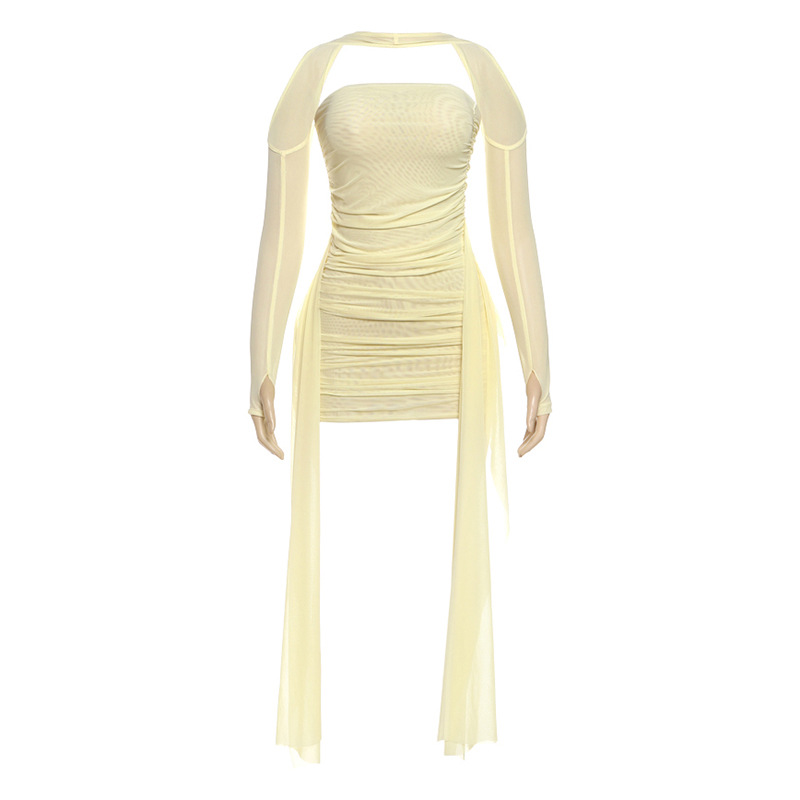 欧美跨境2025时尚新款女装挂脖套指袖褶皱抹胸飘带包臀短裙套装스토어 가기