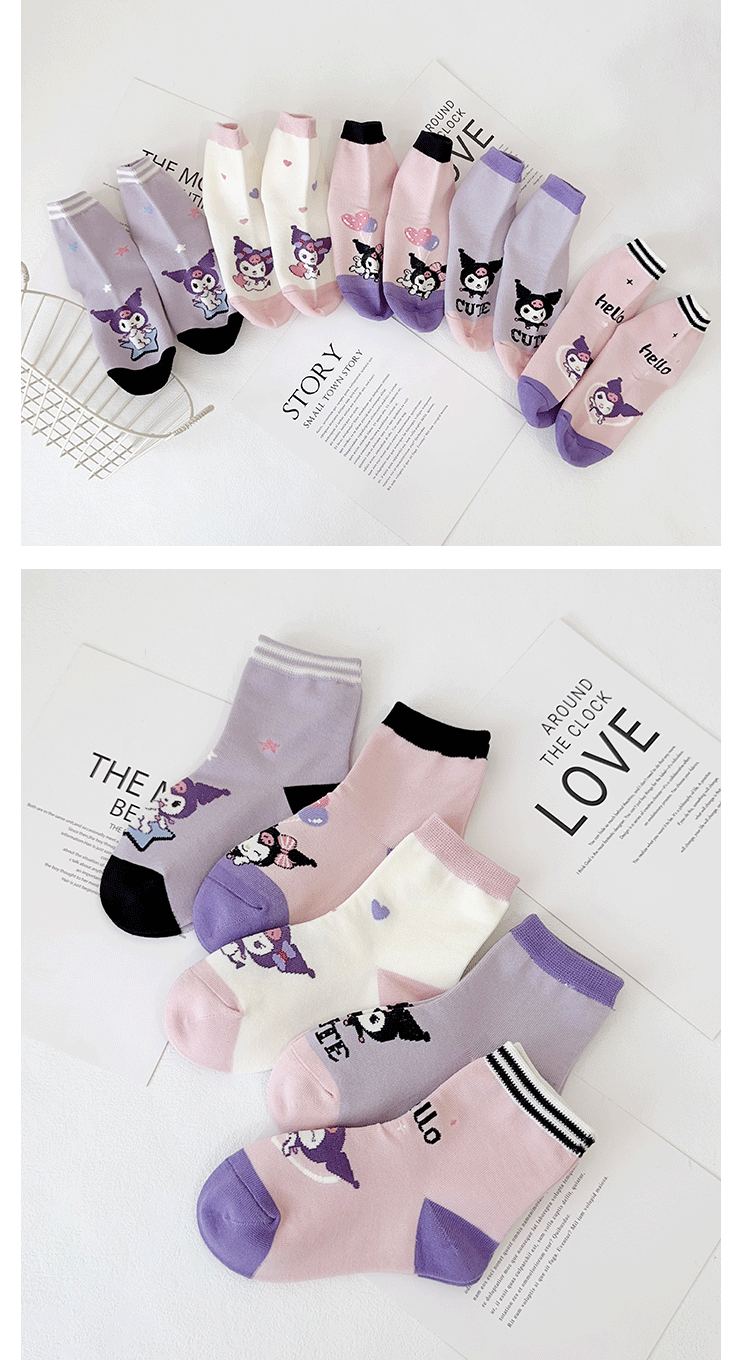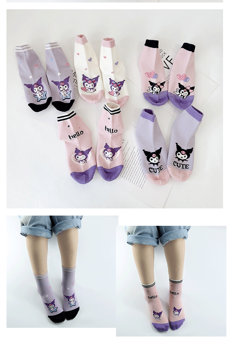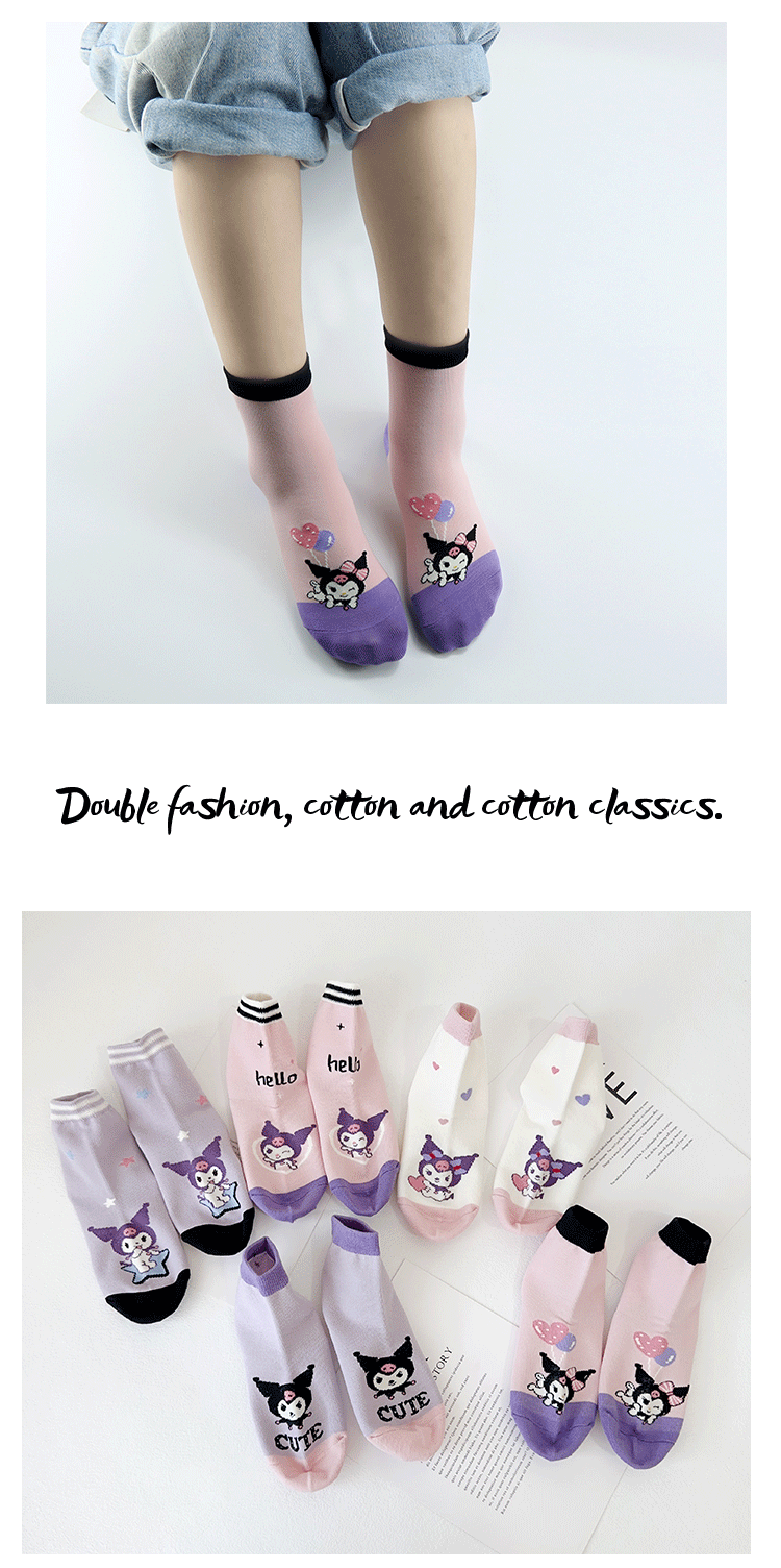 Yishuangshuang 어린이 양말 가을, 겨울 새로운 만화 Kuromi 중간 튜브 양말 빗질면 한국 스타일 소녀 유행 양말 뼈없는