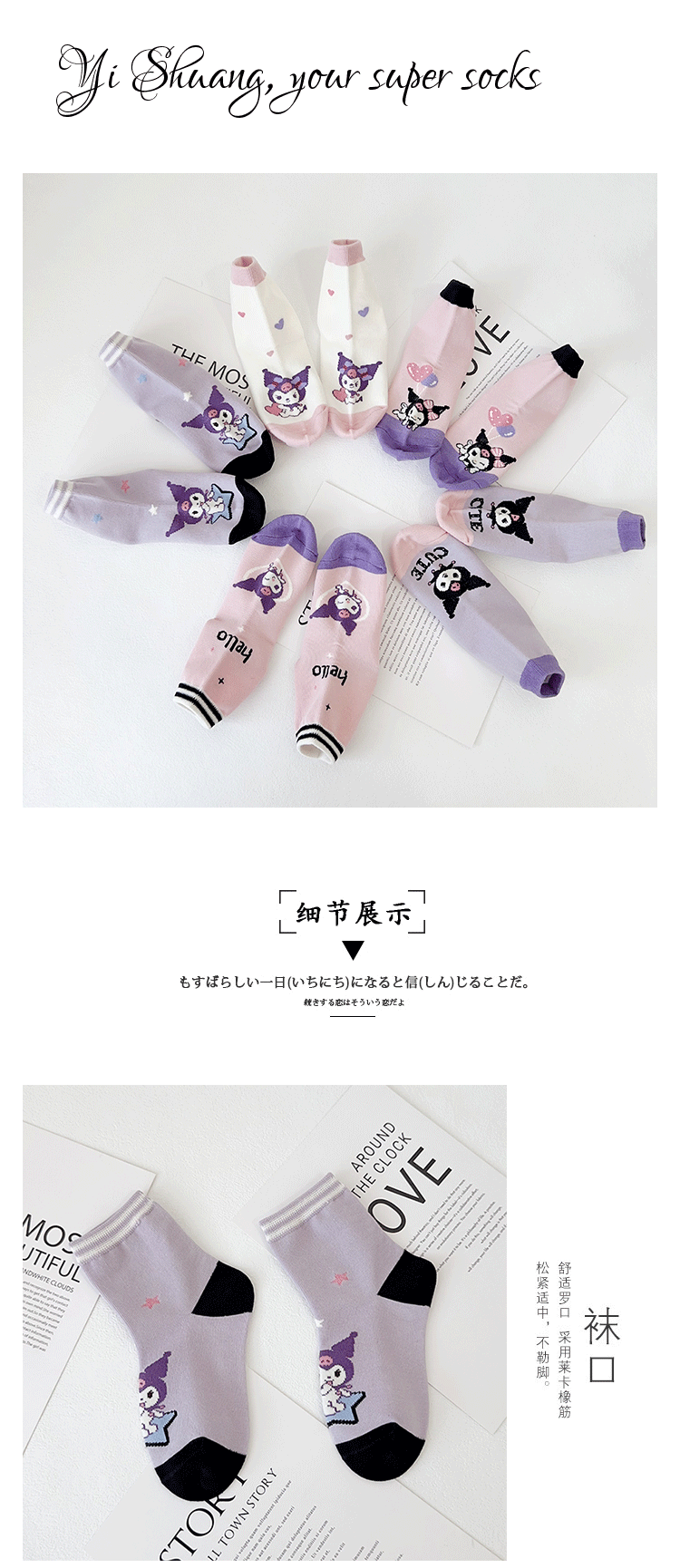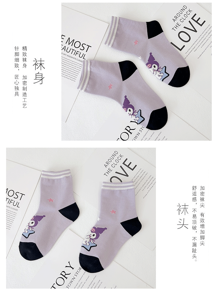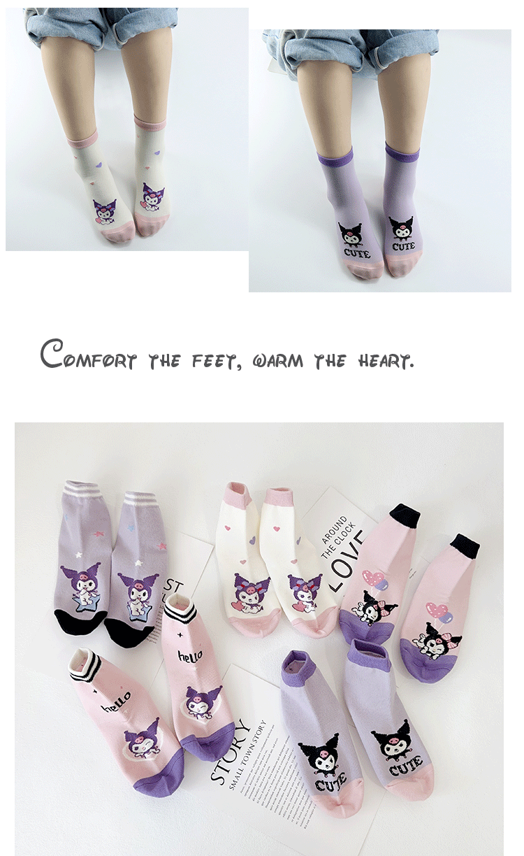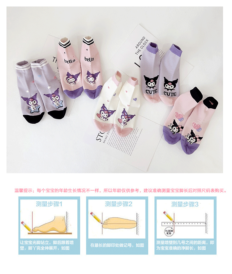 Yishuangshuang 어린이 양말 가을, 겨울 새로운 만화 Kuromi 중간 튜브 양말 빗질면 한국 스타일 소녀 유행 양말 뼈없는