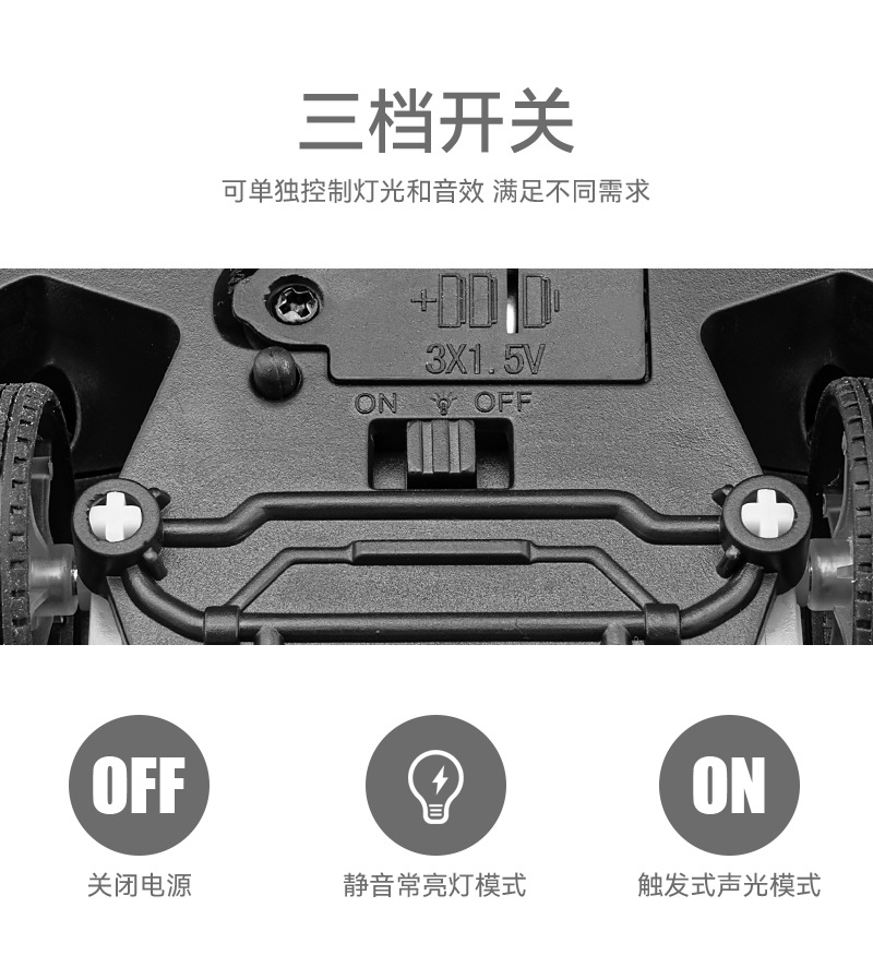 【使用方法】取下车底部绝缘片,轻按压车头,即有声光,按住车身往回拉,再松手,车子即向前跑