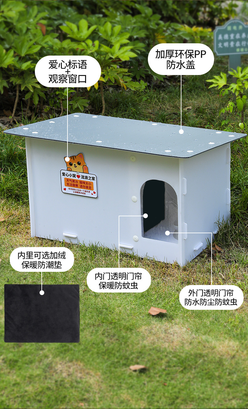 3.有爱心标语和观察窗口,既是流浪猫临时家,传递守护善意,也方便查看内部情况,助力爱心救助 。