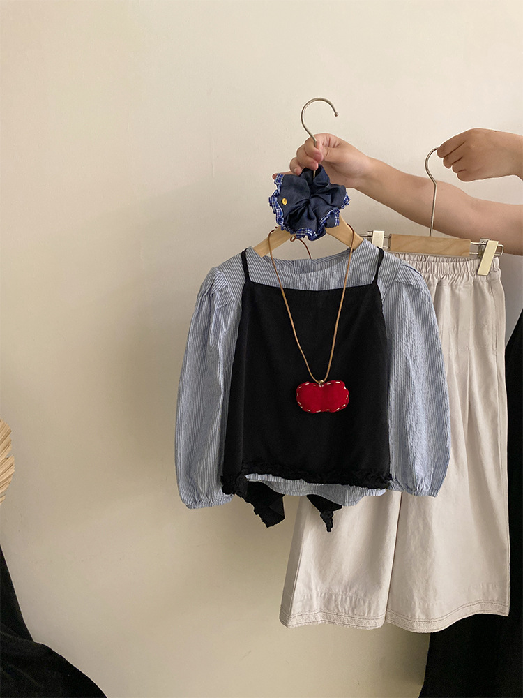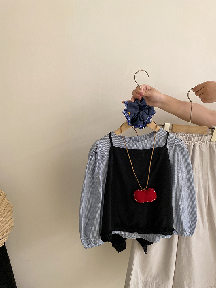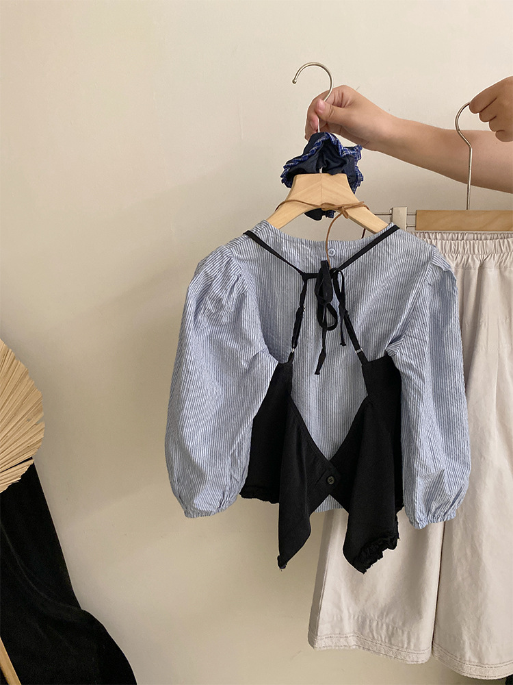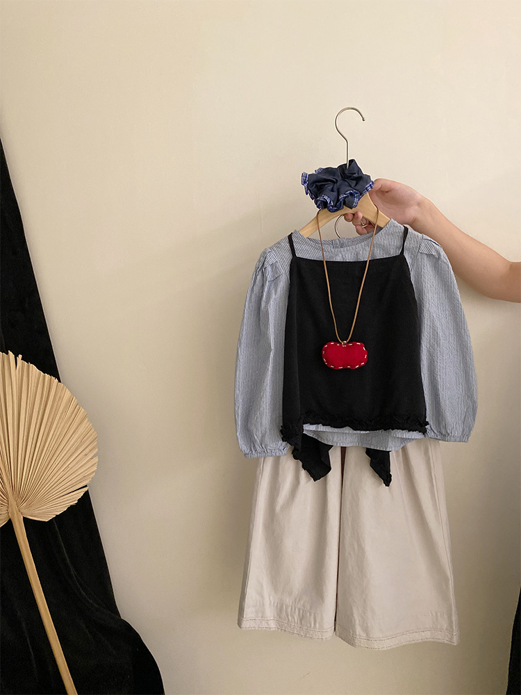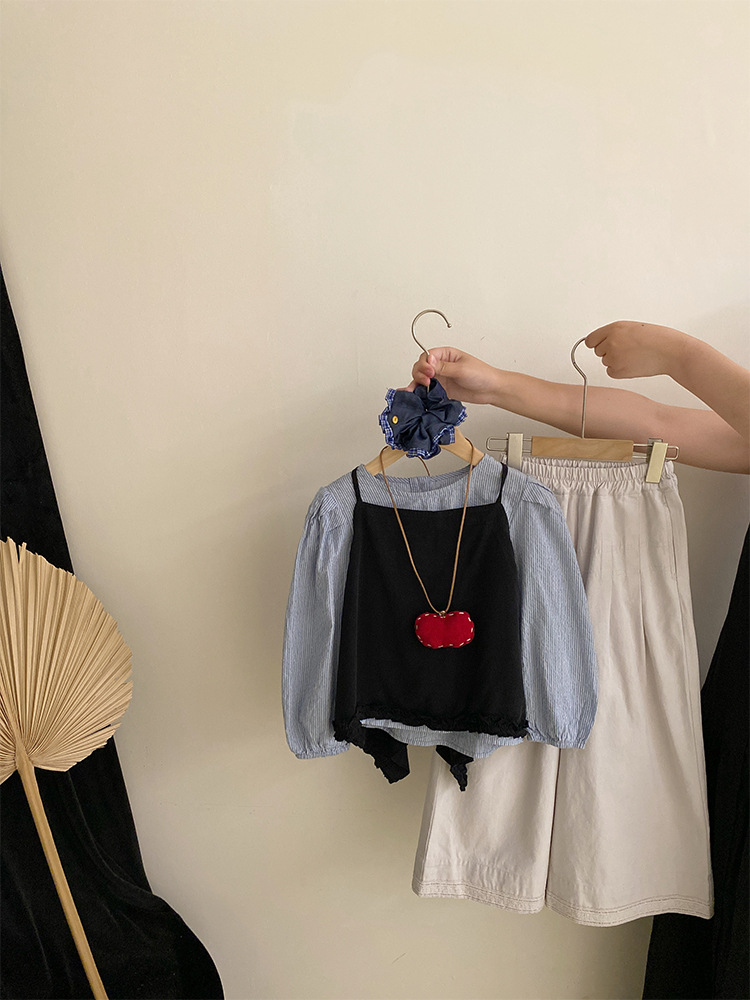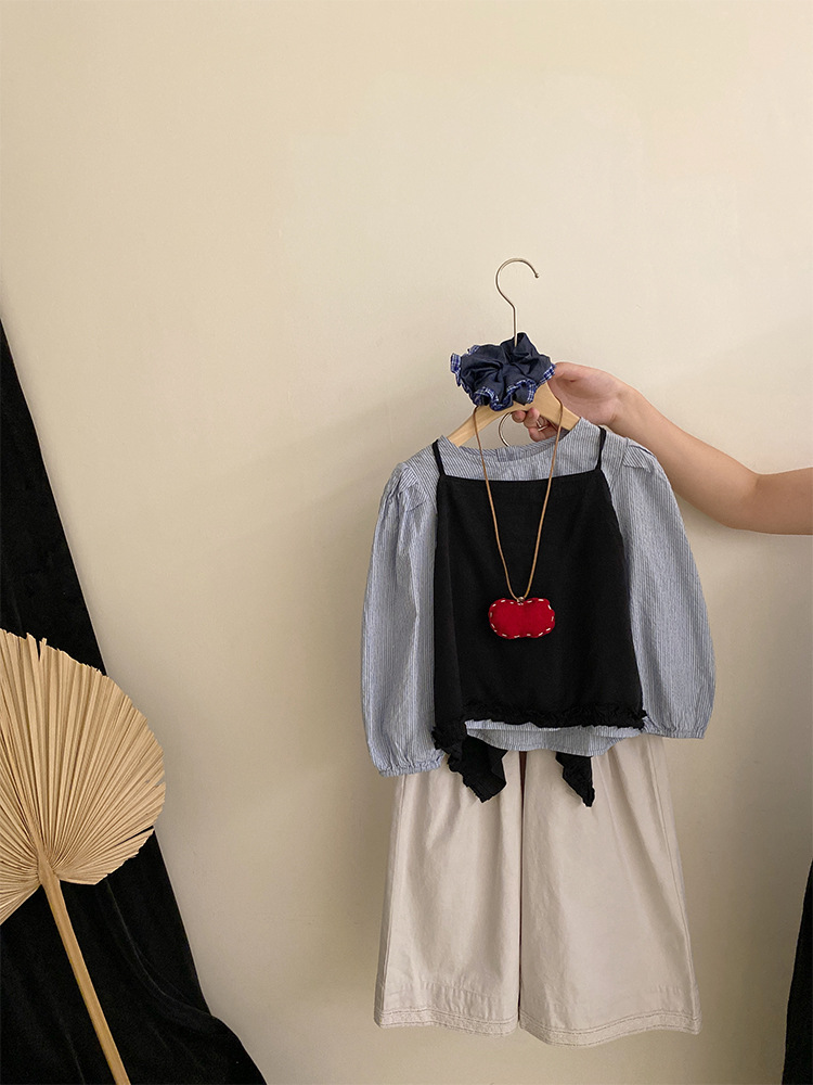 한국 스타일 여자 가을 신작 스트라이프 셔츠 솔리드 컬러 서스펜더 2025 다목적 루즈 캐주얼 와이드 레그 팬츠 3 피스 세트