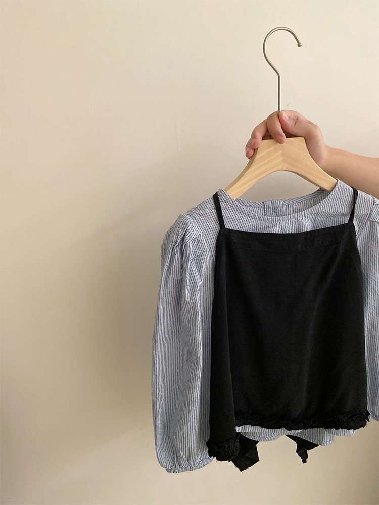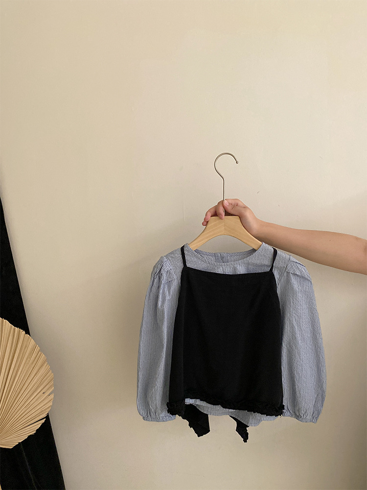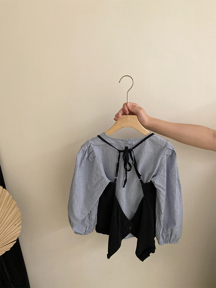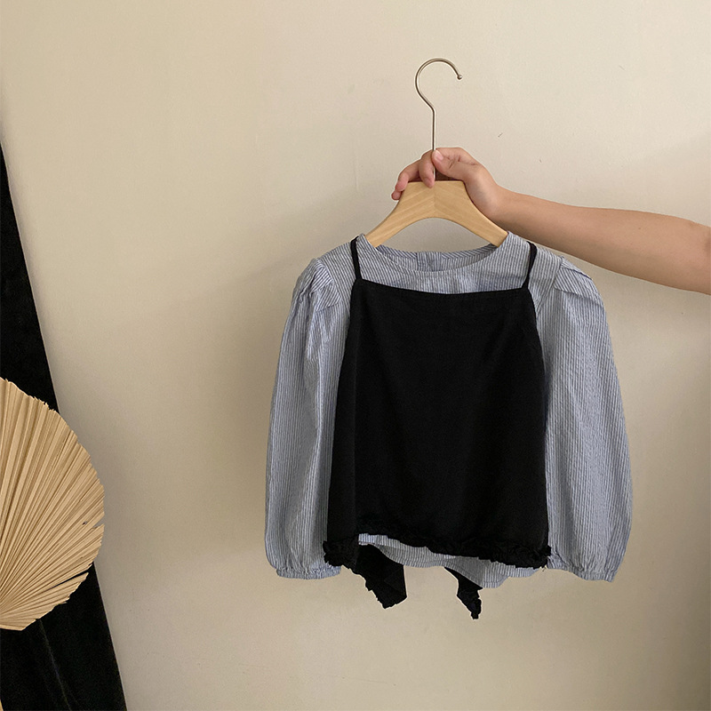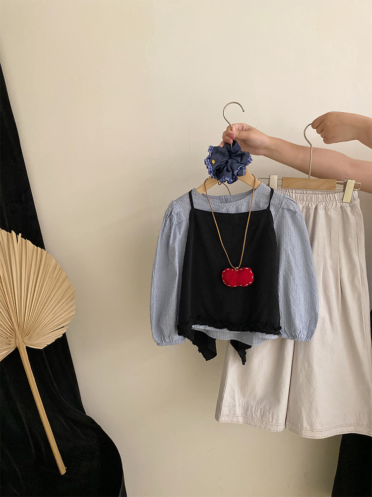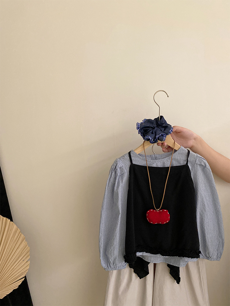 한국 스타일 여자 가을 신작 스트라이프 셔츠 솔리드 컬러 서스펜더 2025 다목적 루즈 캐주얼 와이드 레그 팬츠 3 피스 세트