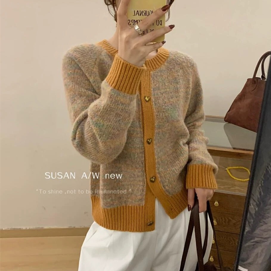 여성을위한 보라색 라운드 넥 스웨터 재킷 2025 봄, 가을 새로운 대비 색상 디자인 부드럽고 밀랍 두꺼운 니트 카디건 탑스토어 가기