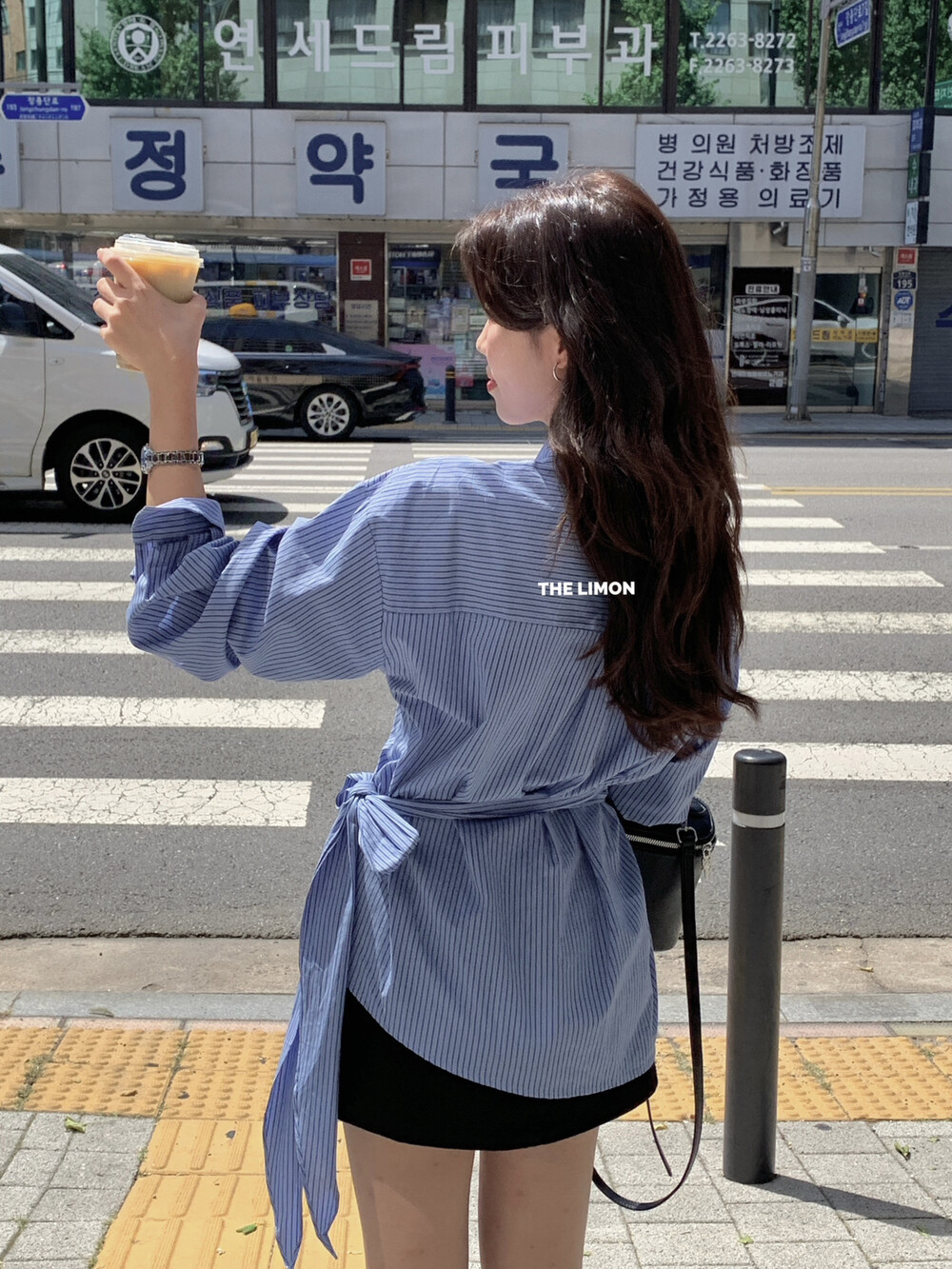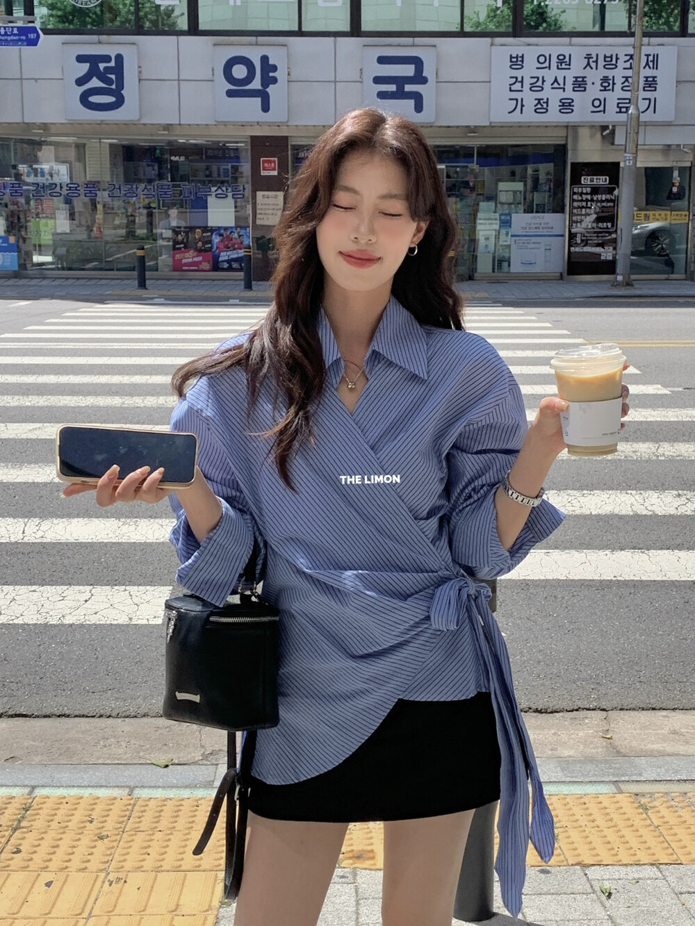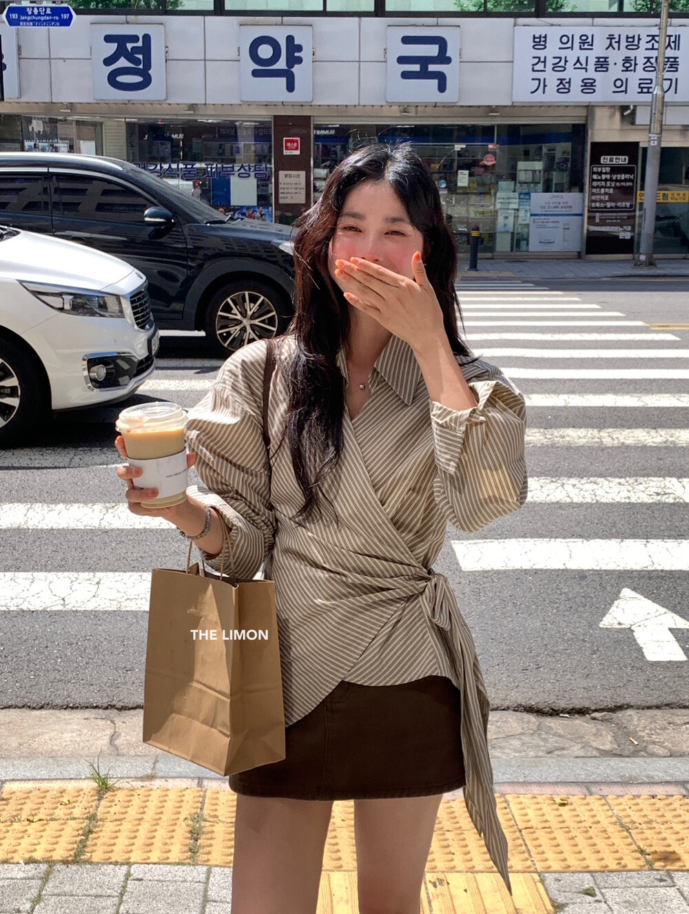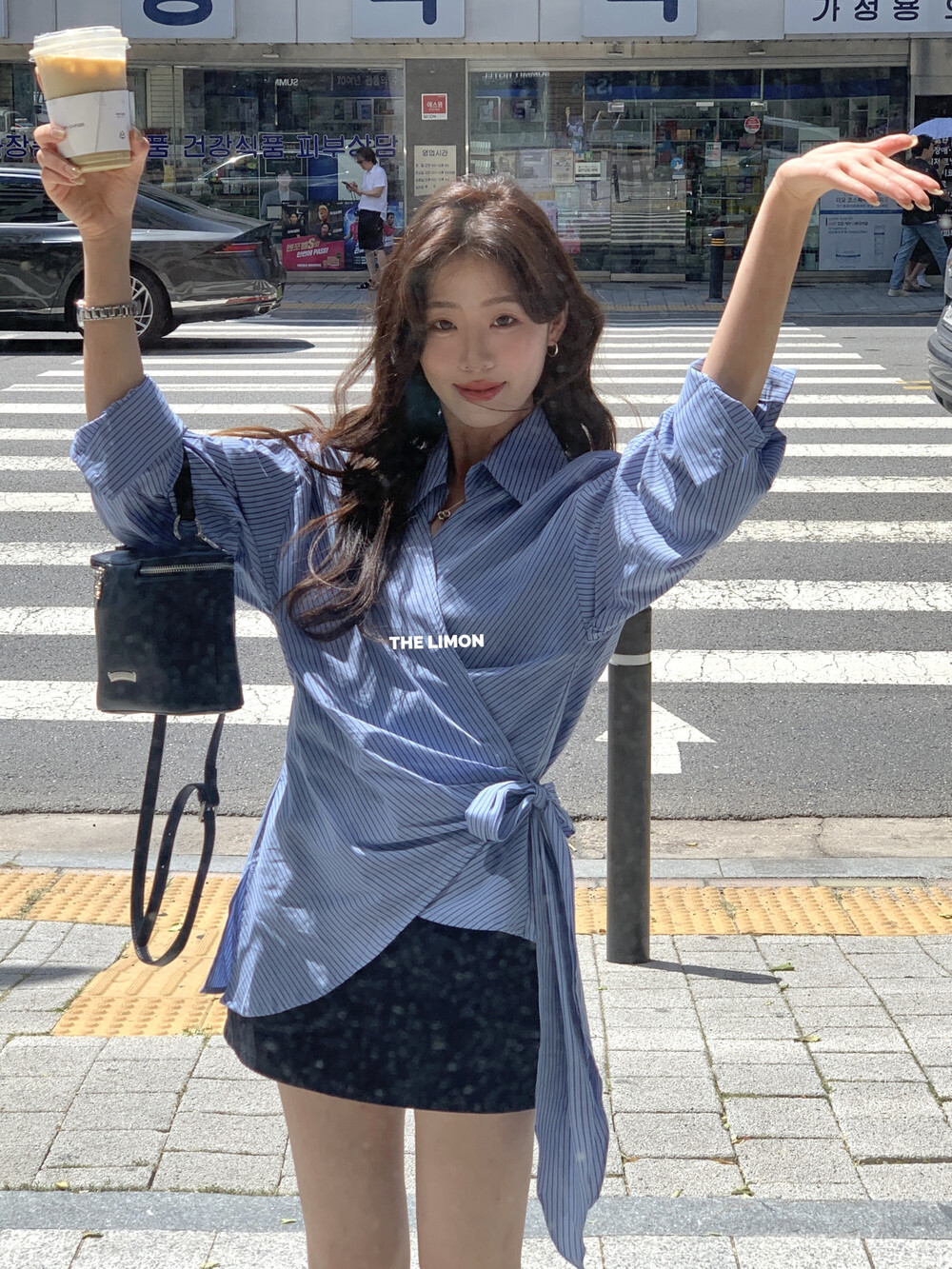 재고정리 무반품 레몬그린티 초가을 여성 한국 스타일 디자인 다용도 사이드 스트랩 스트라이프 폴로 긴팔 셔츠스토어 가기