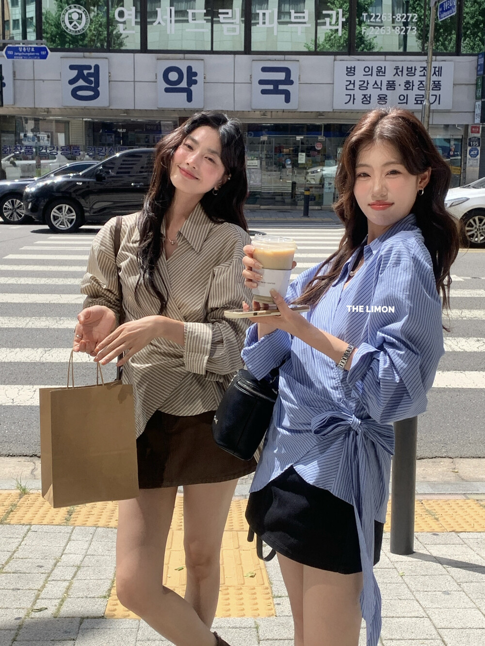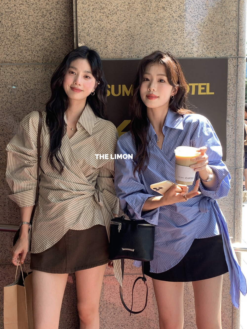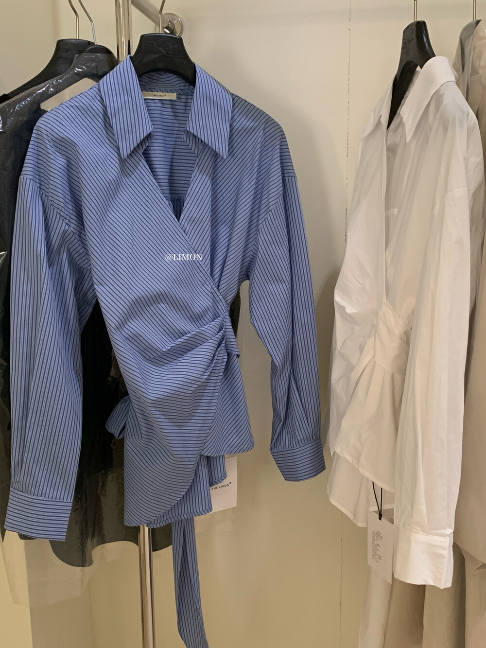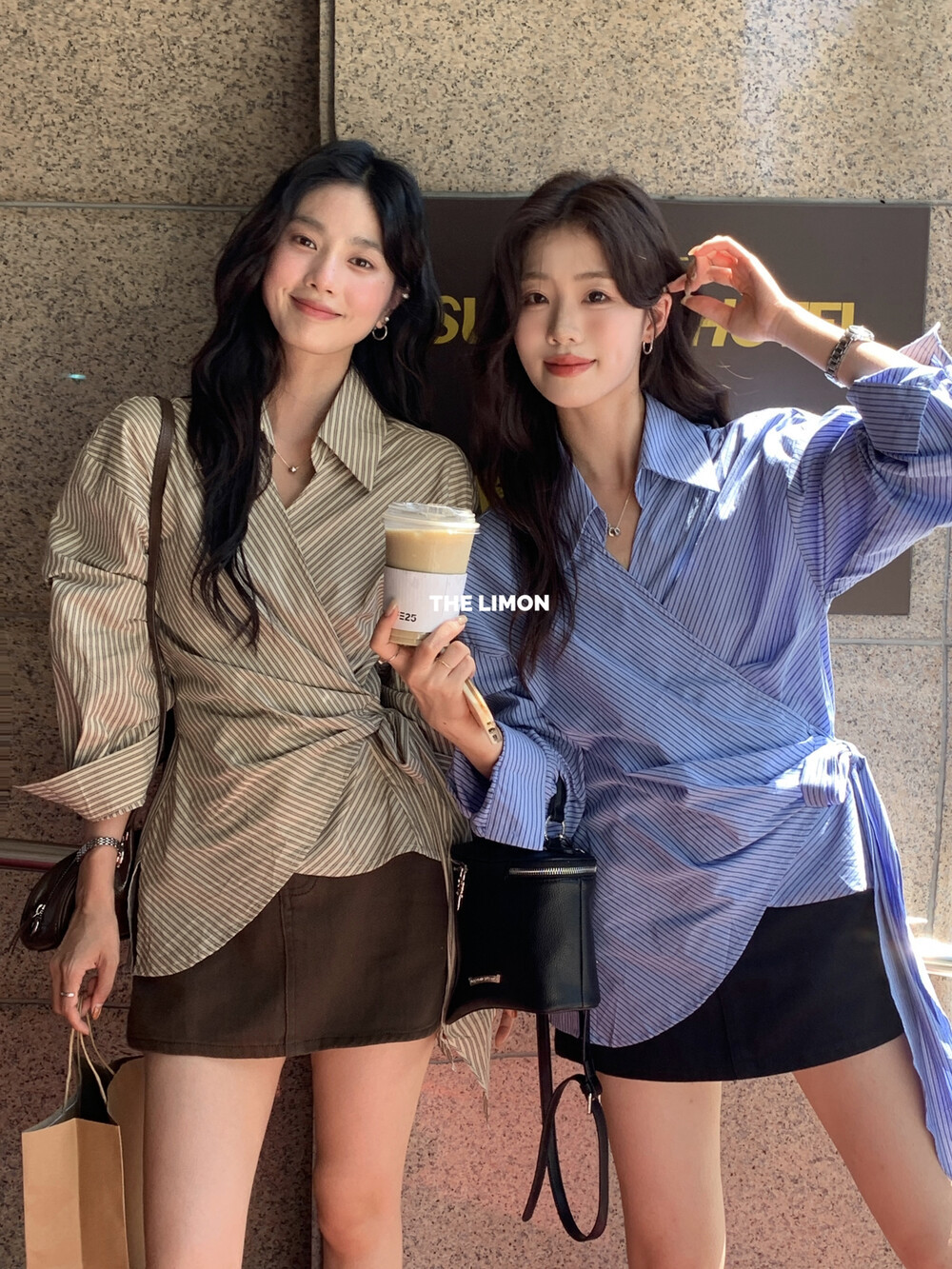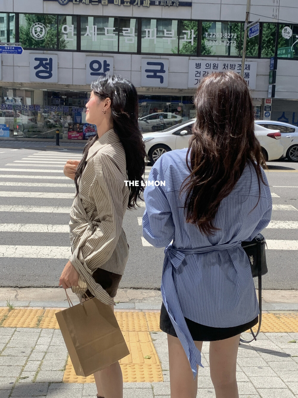 재고정리 무반품 레몬그린티 초가을 여성 한국 스타일 디자인 다용도 사이드 스트랩 스트라이프 폴로 긴팔 셔츠스토어 가기