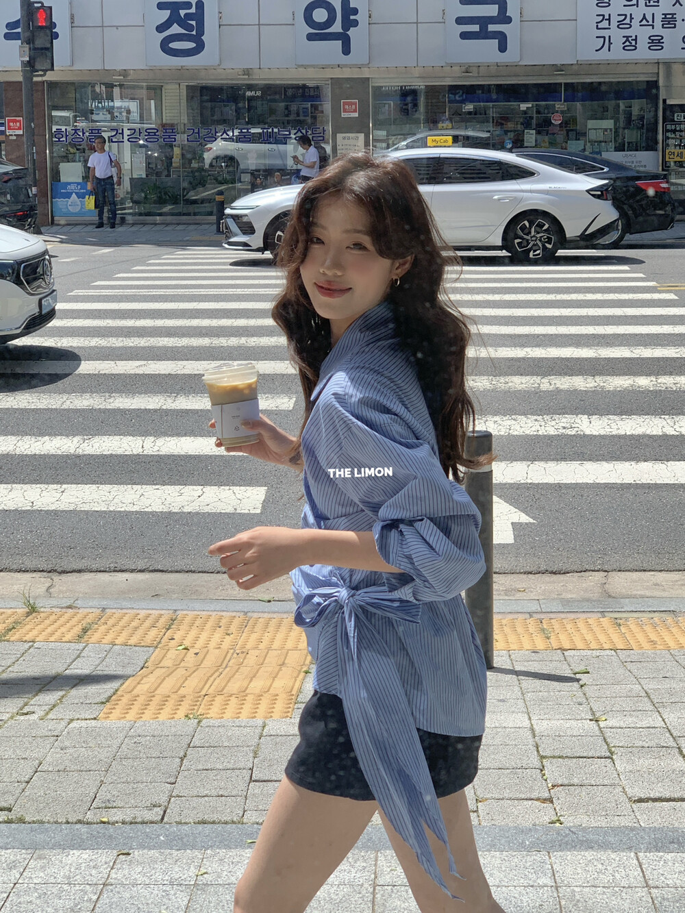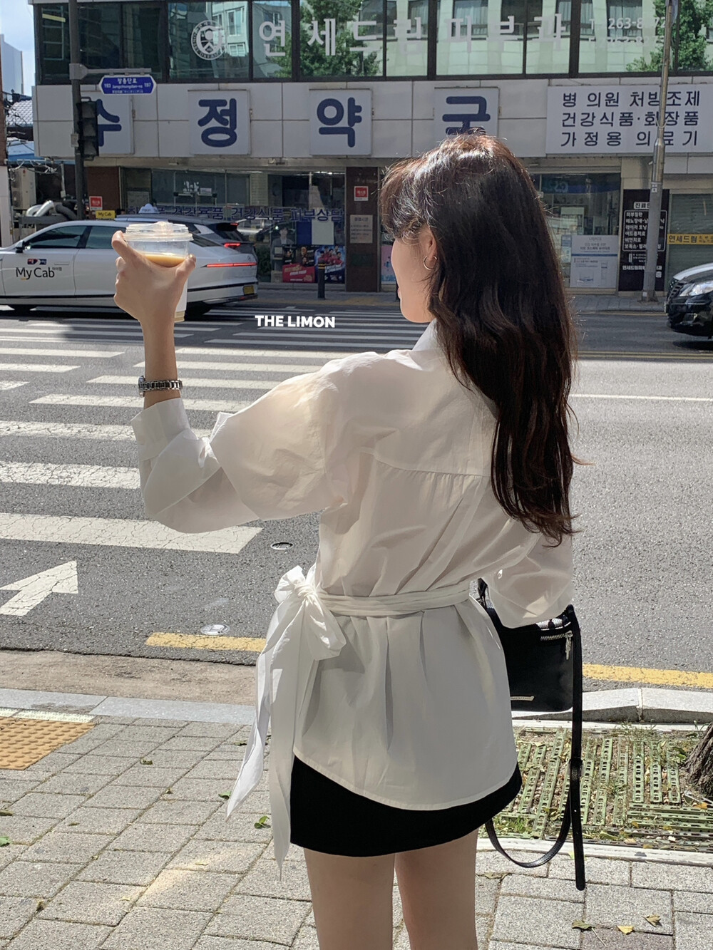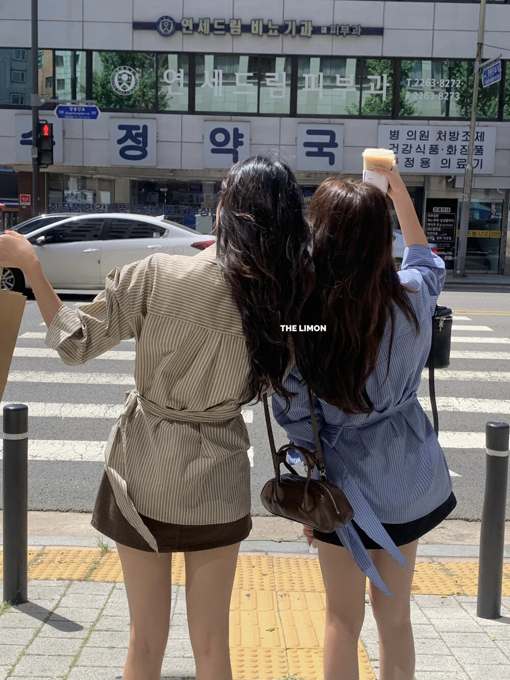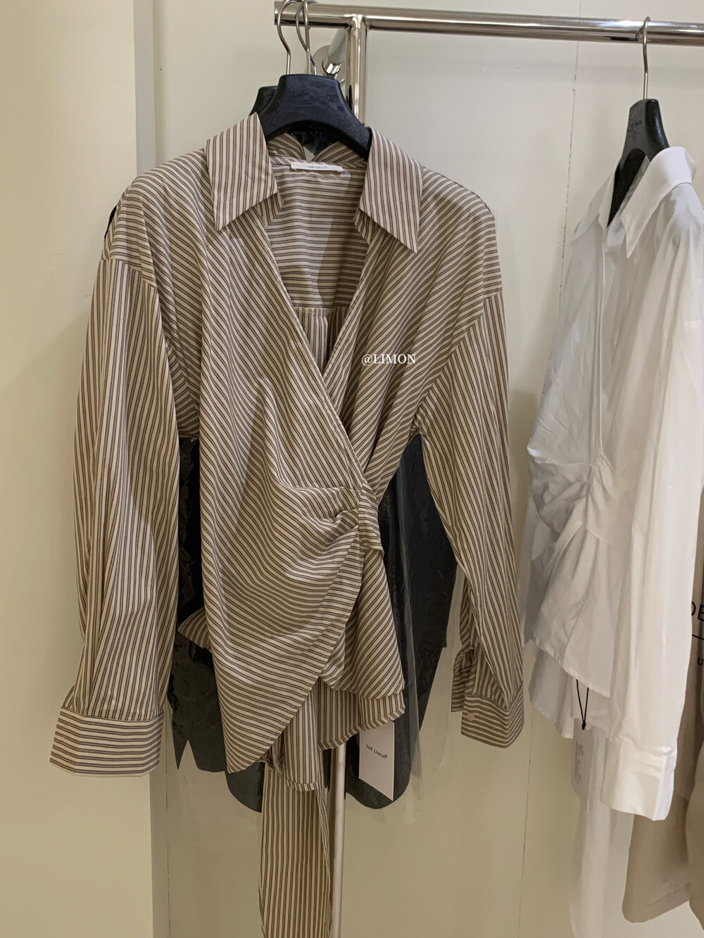재고정리 무반품 레몬그린티 초가을 여성 한국 스타일 디자인 다용도 사이드 스트랩 스트라이프 폴로 긴팔 셔츠스토어 가기