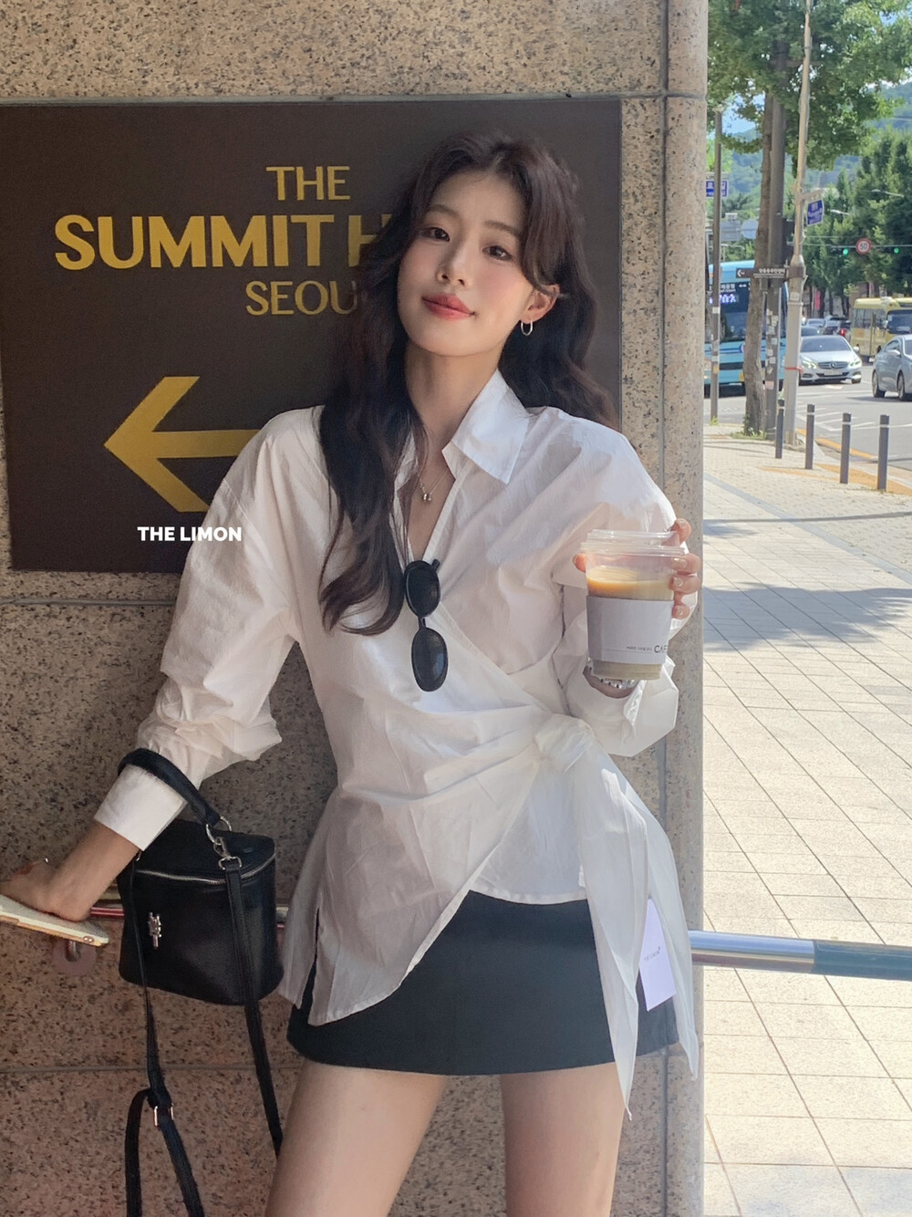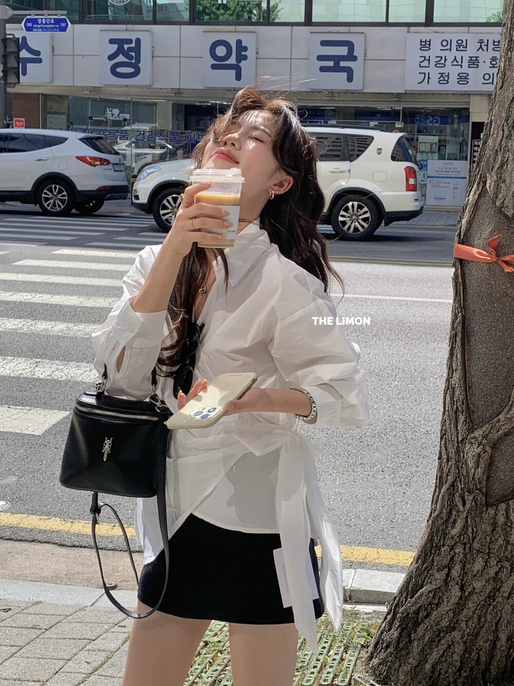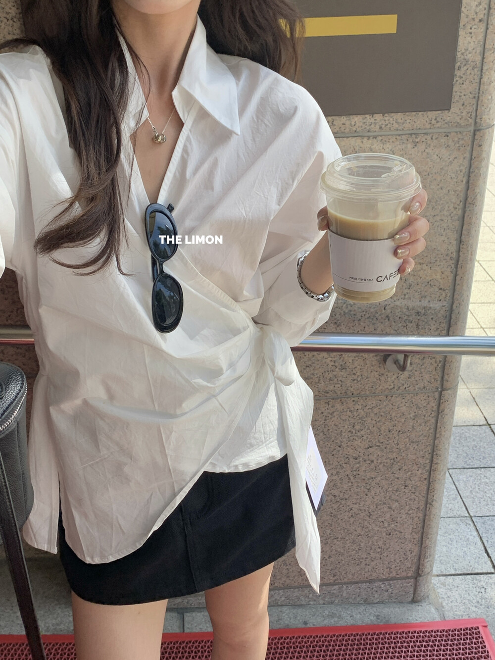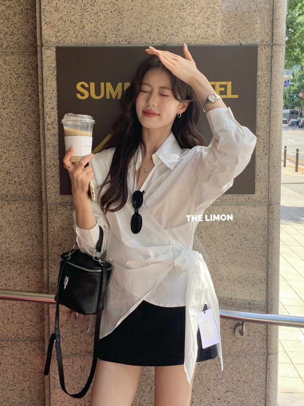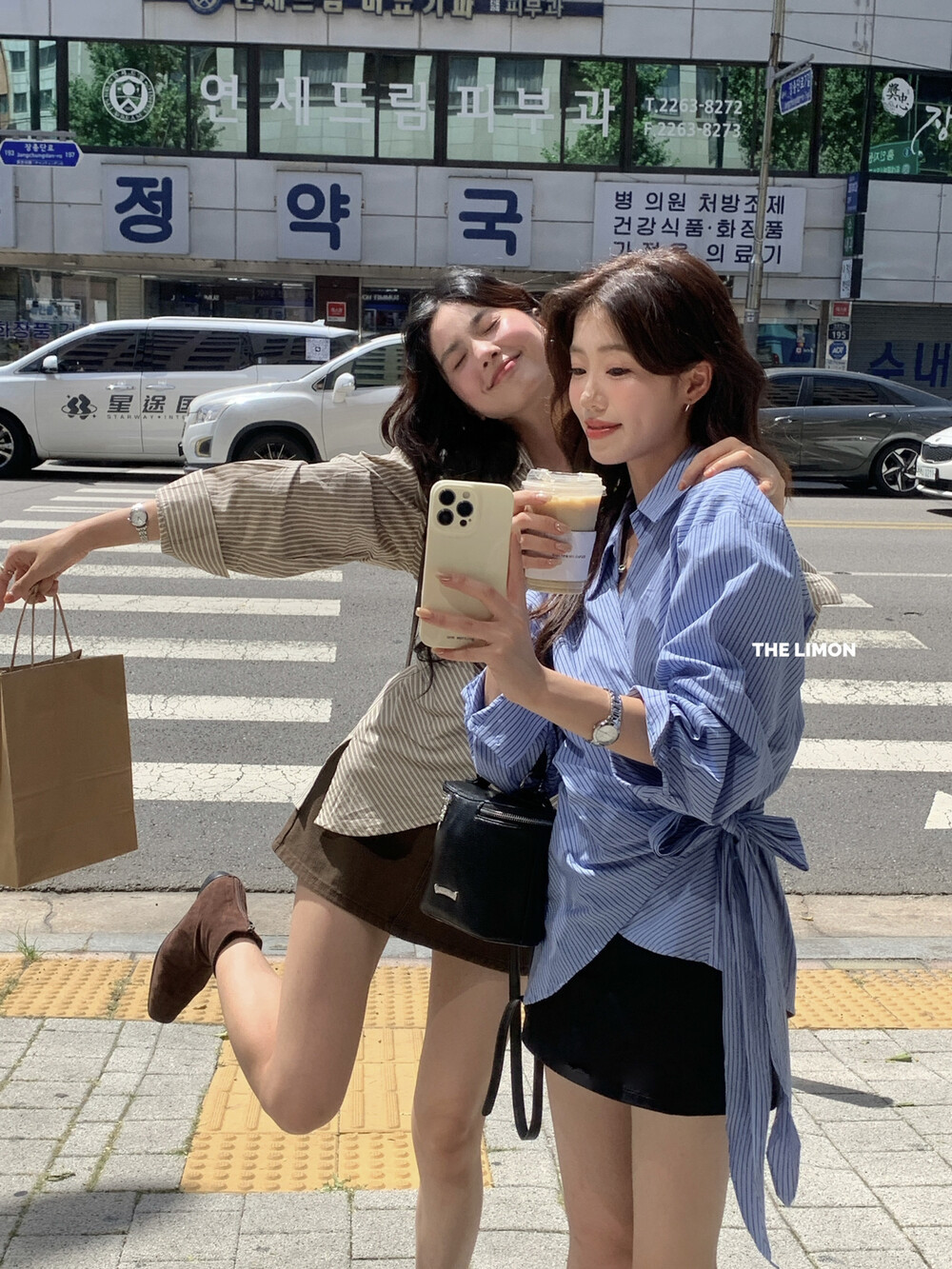 재고정리 무반품 레몬그린티 초가을 여성 한국 스타일 디자인 다용도 사이드 스트랩 스트라이프 폴로 긴팔 셔츠스토어 가기
