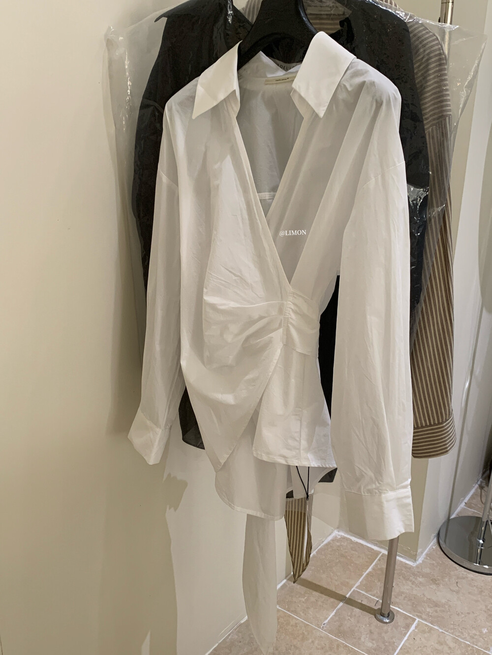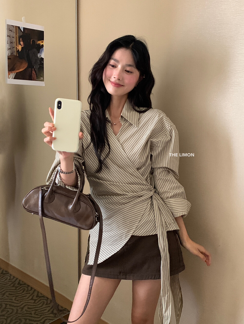재고정리 무반품 레몬그린티 초가을 여성 한국 스타일 디자인 다용도 사이드 스트랩 스트라이프 폴로 긴팔 셔츠