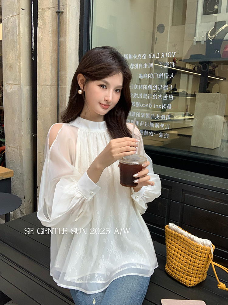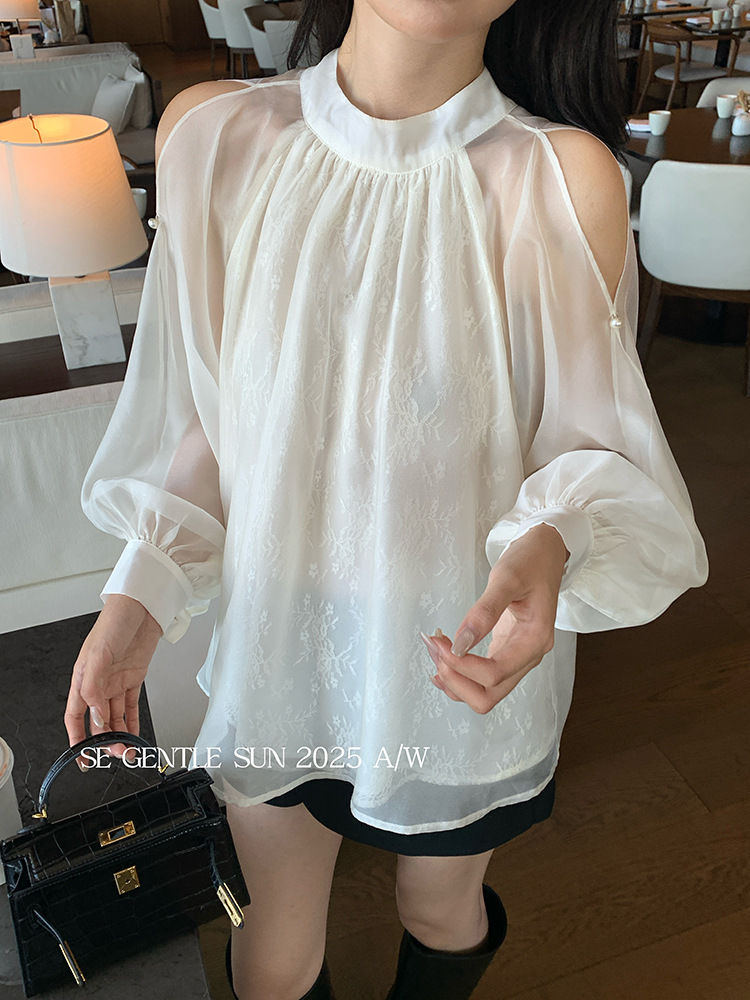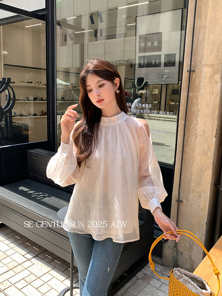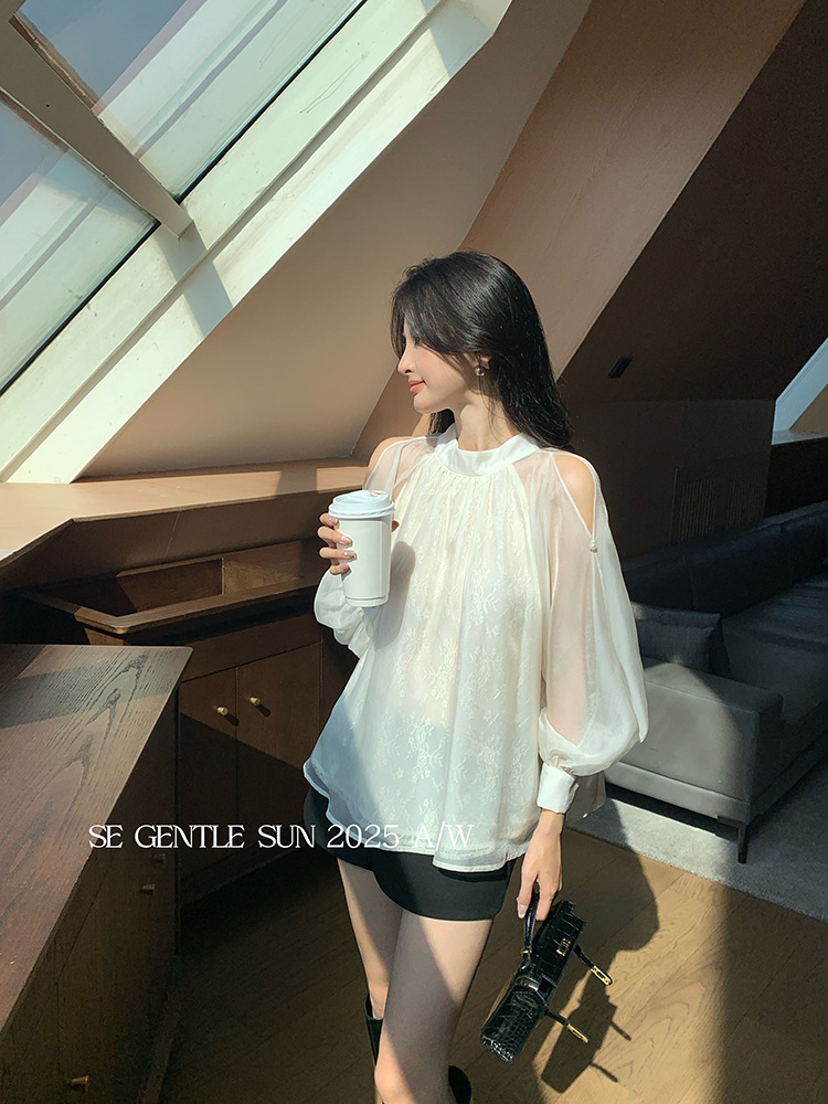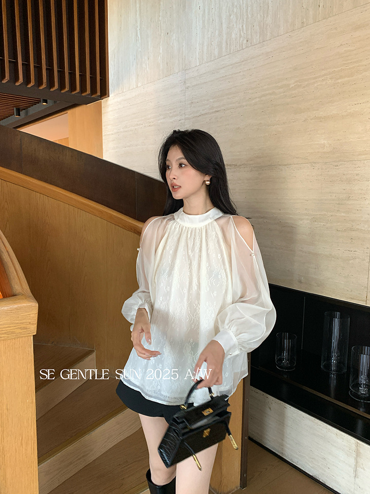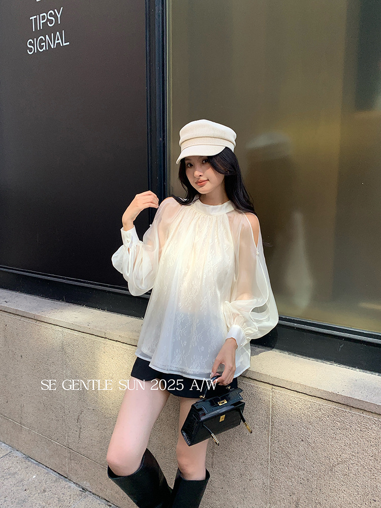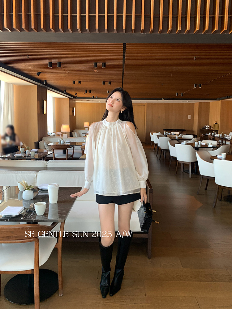 Xiuxixi 2025 가을 화이트 라벨 한국 스타일 다목적 기질 레이스 업 쉬폰 긴팔 셔츠 여성상의 89490