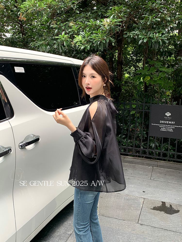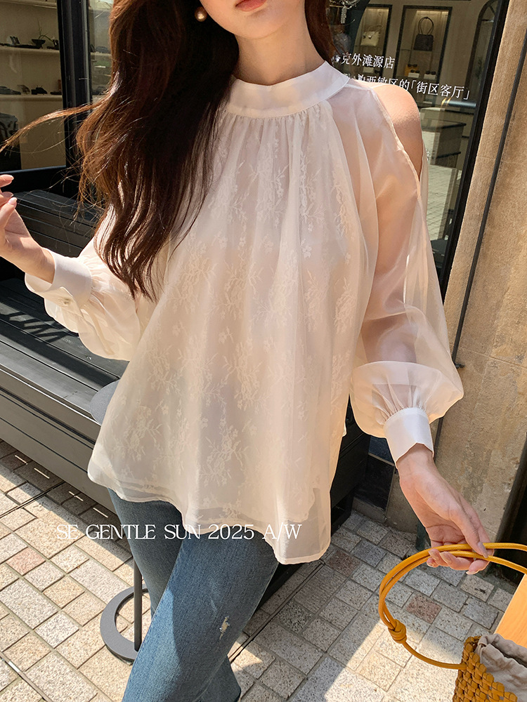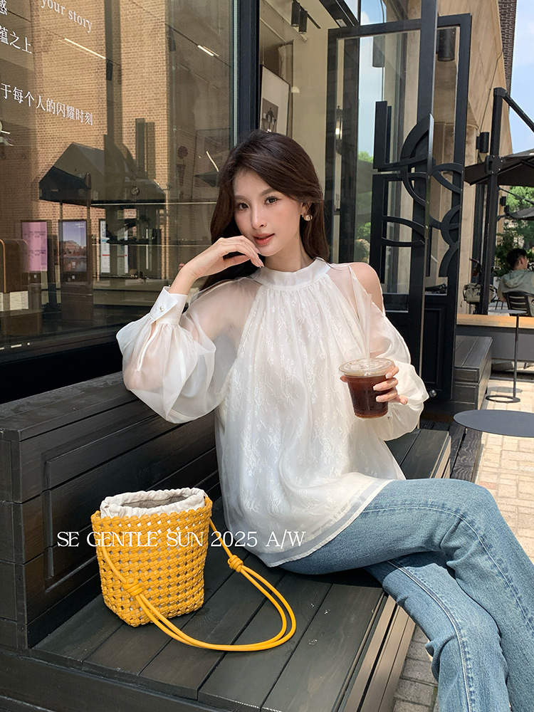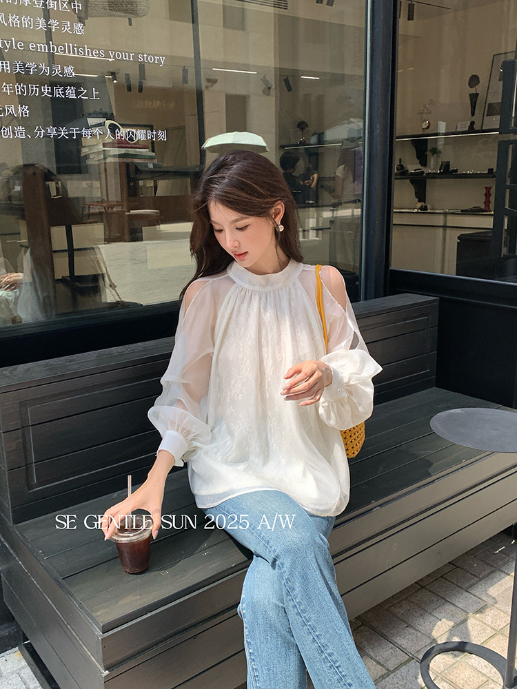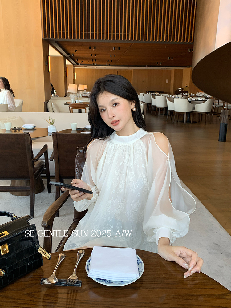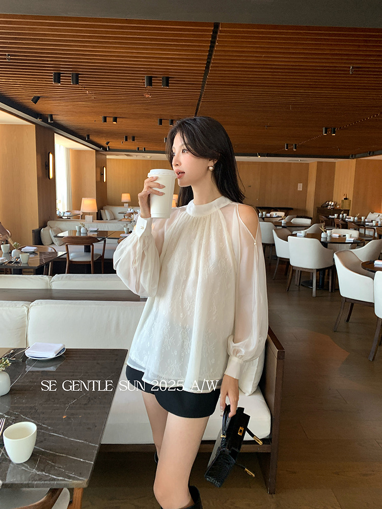 Xiuxixi 2025 가을 화이트 라벨 한국 스타일 다목적 기질 레이스 업 쉬폰 긴팔 셔츠 여성상의 89490