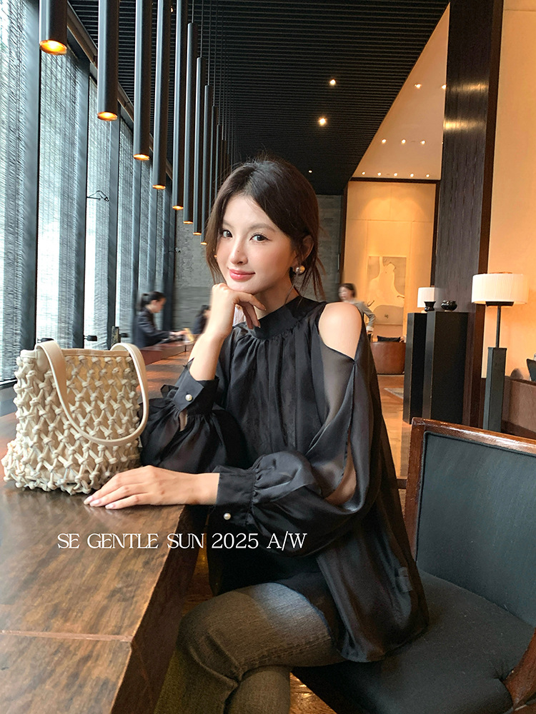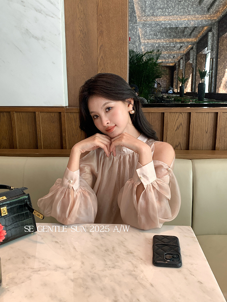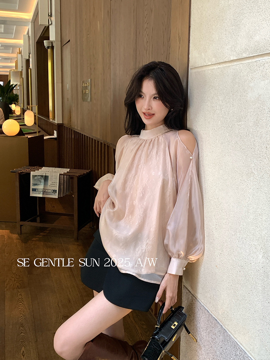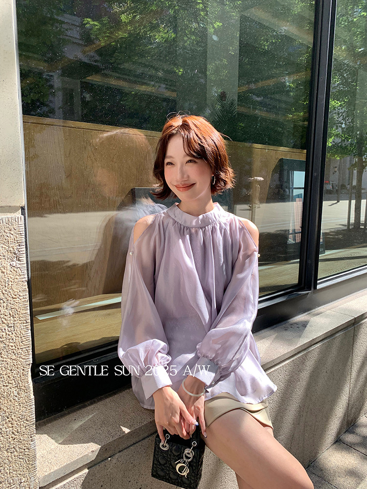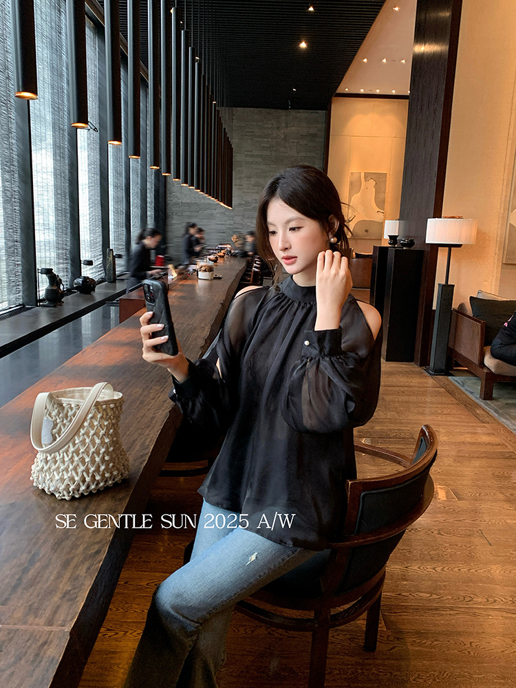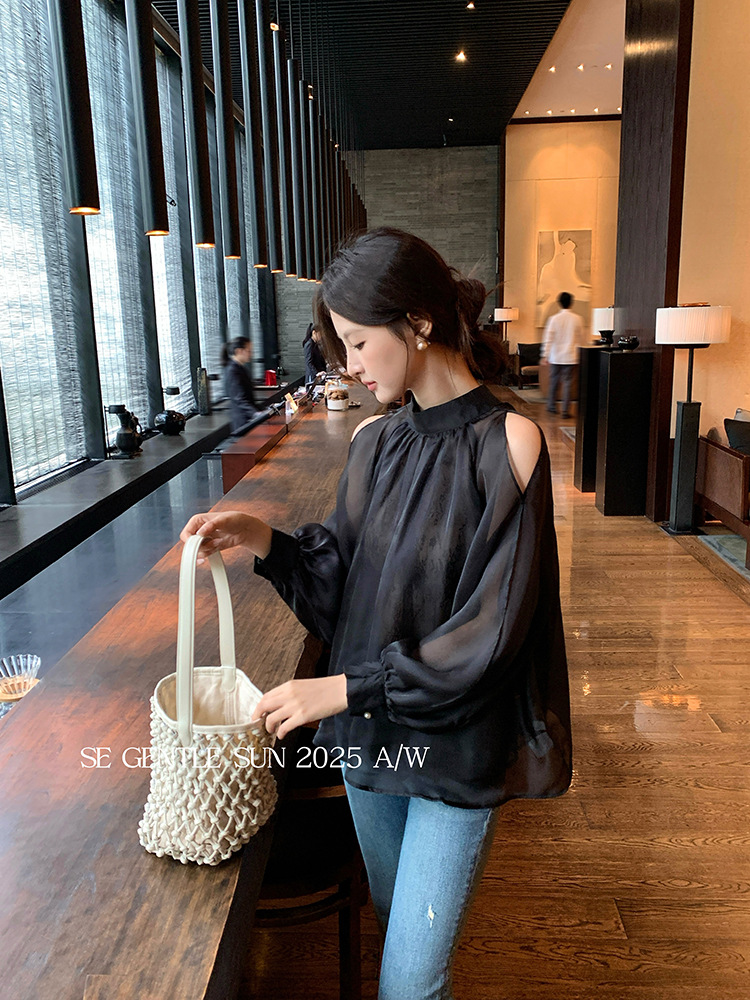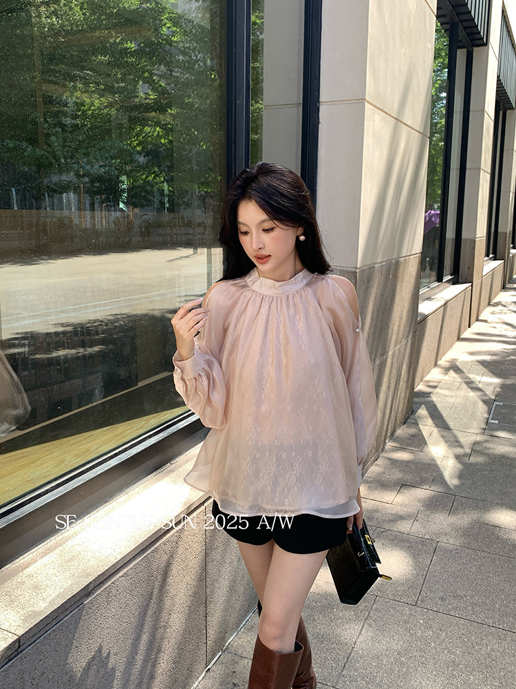 Xiuxixi 2025 가을 화이트 라벨 한국 스타일 다목적 기질 레이스 업 쉬폰 긴팔 셔츠 여성상의 89490
