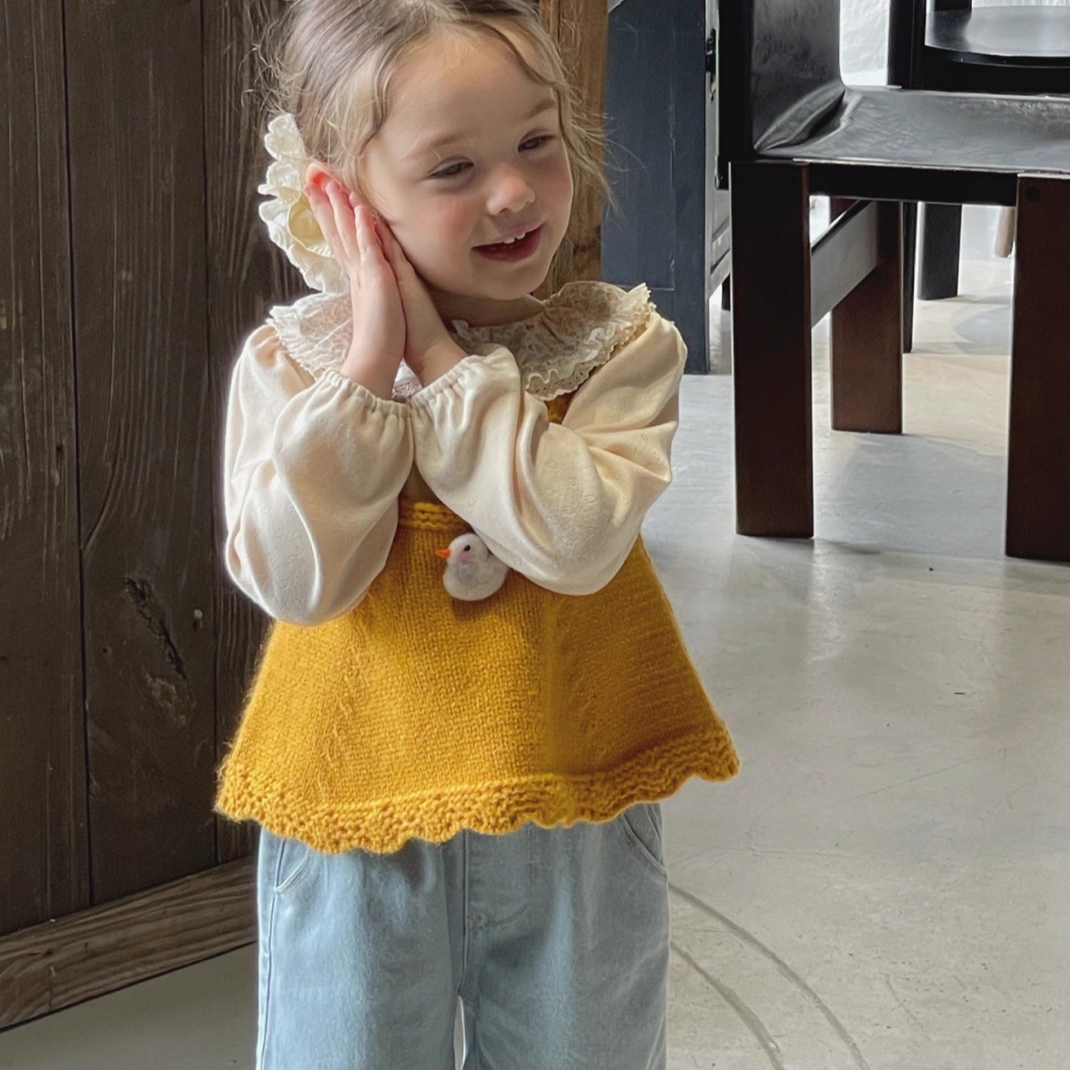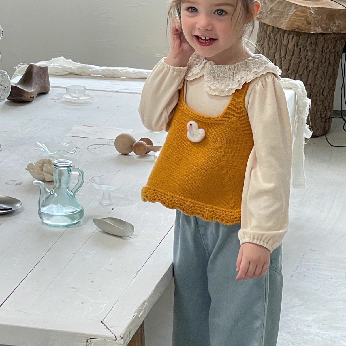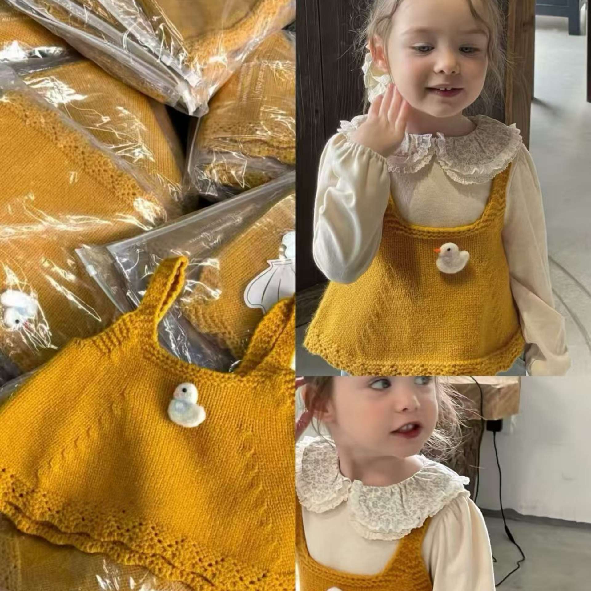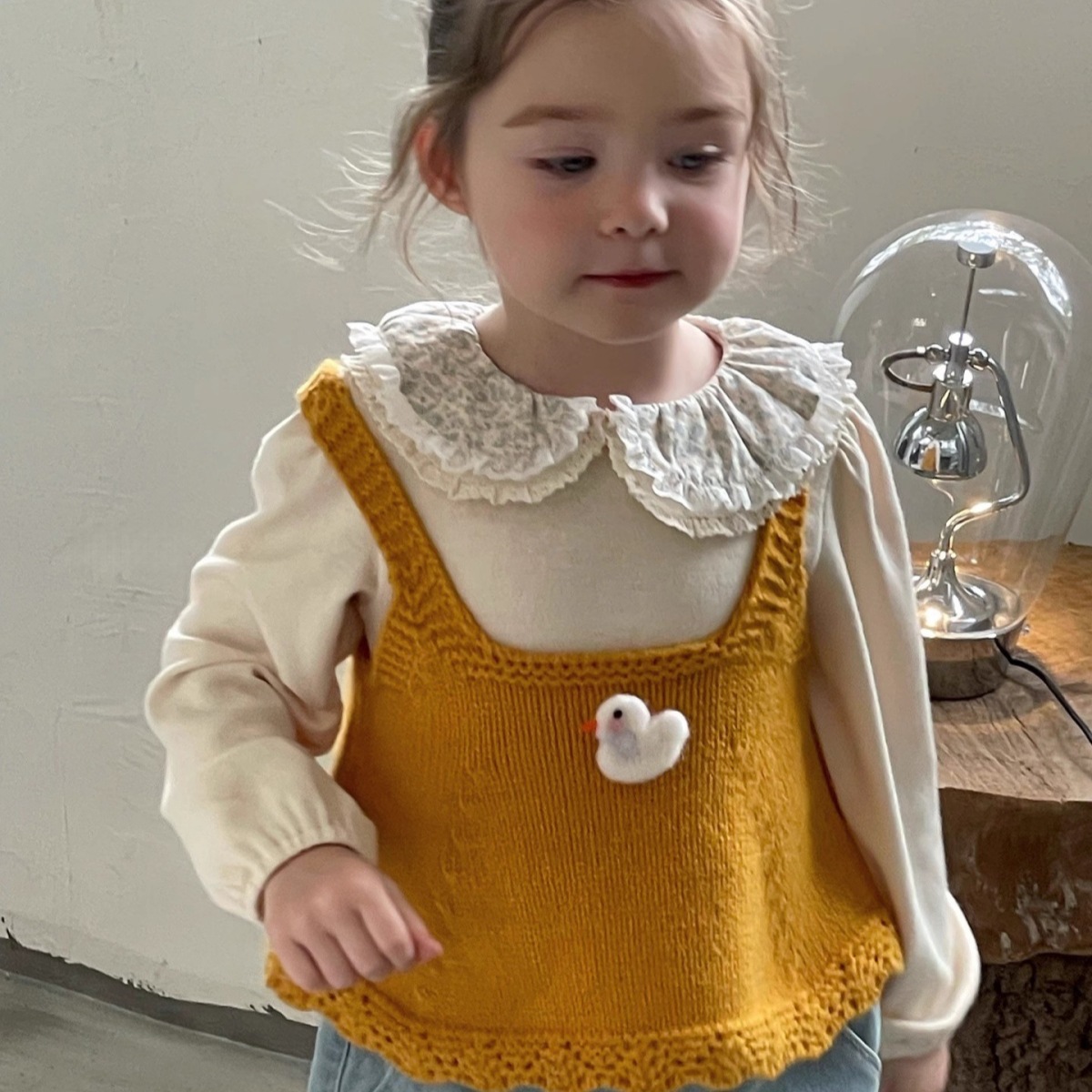 Ningli 여아 봄, 가을 정장 작은 노란색 오리 니트 조끼 + 꽃무늬 칼라 셔츠 + 데님 와이드 팬츠 3피스 세트스토어 가기