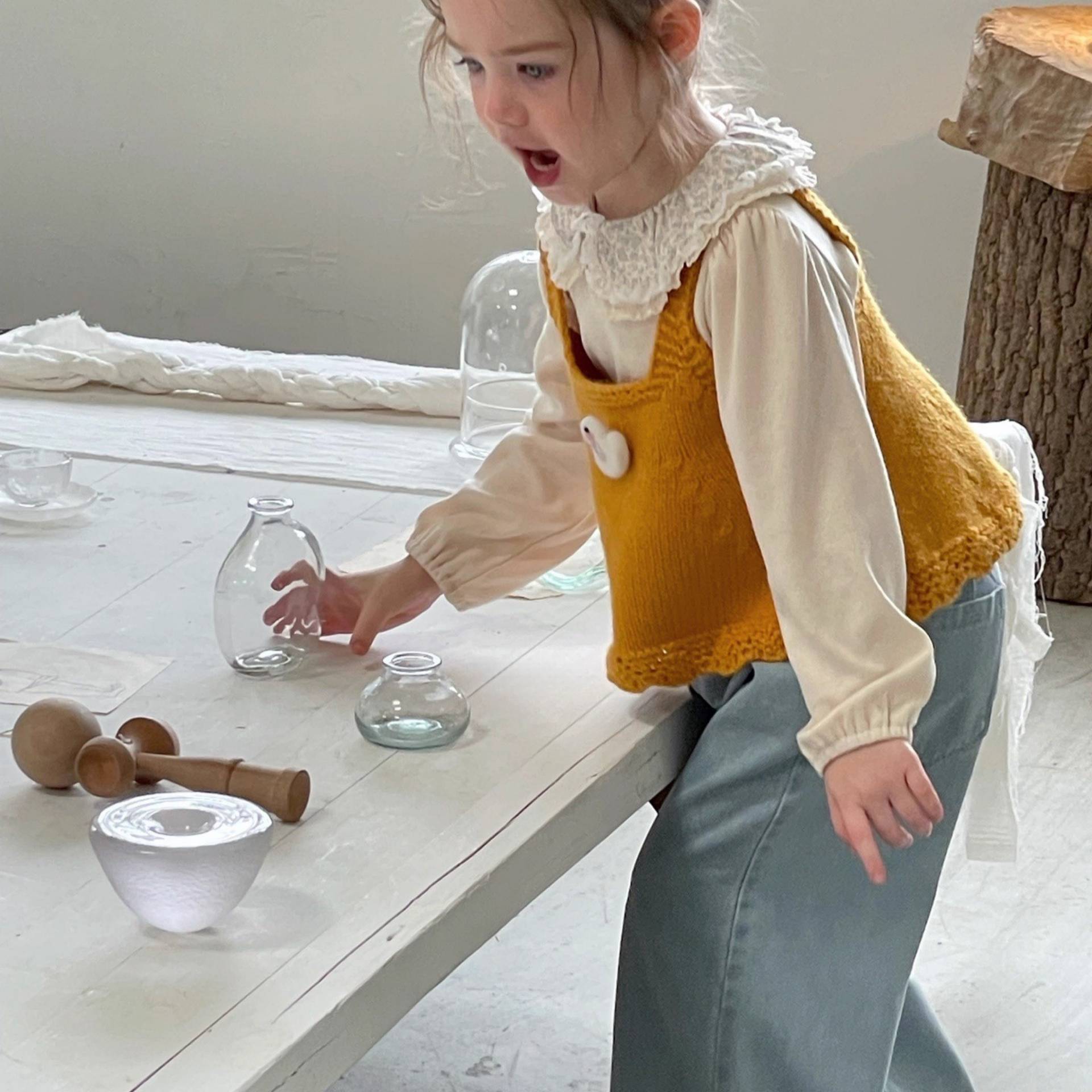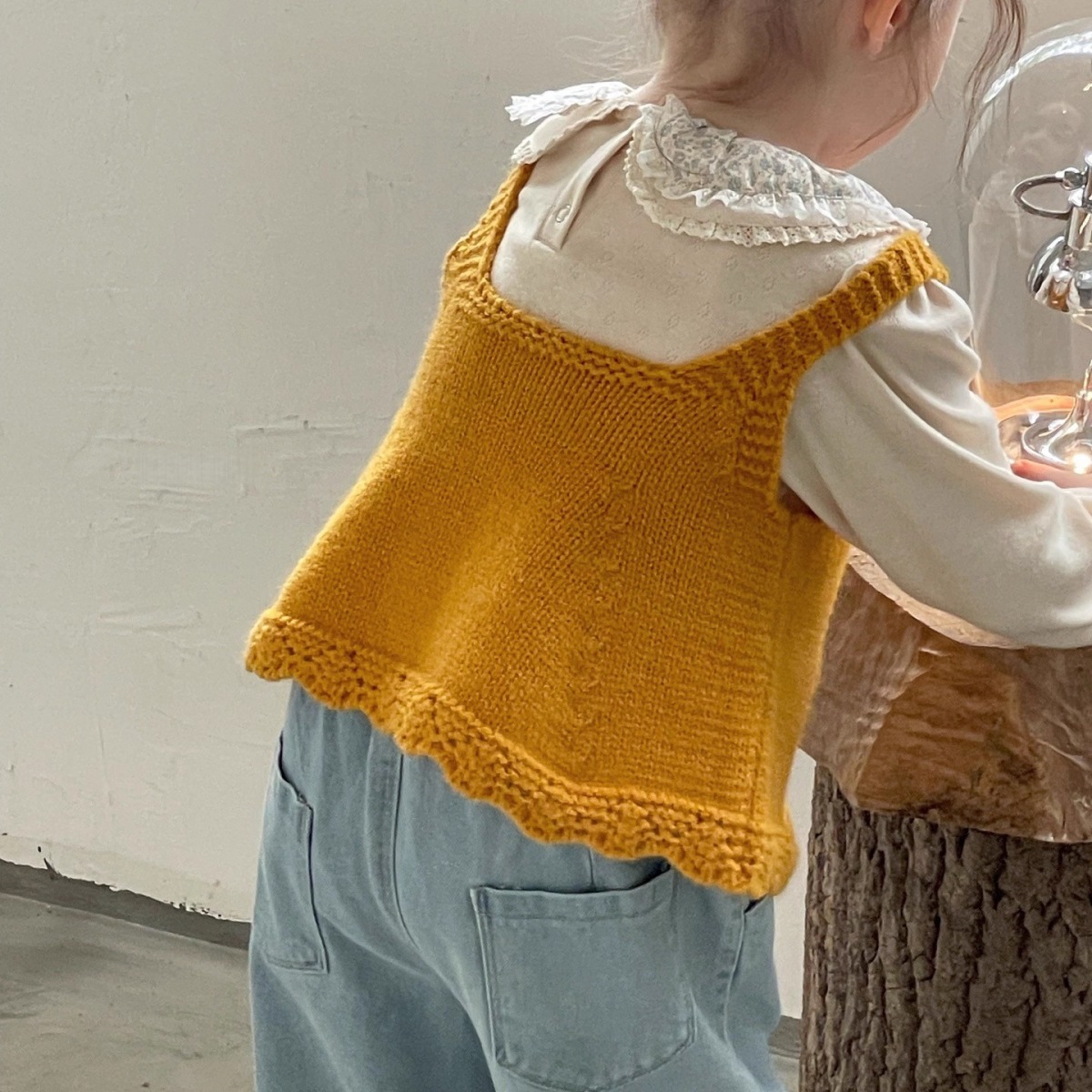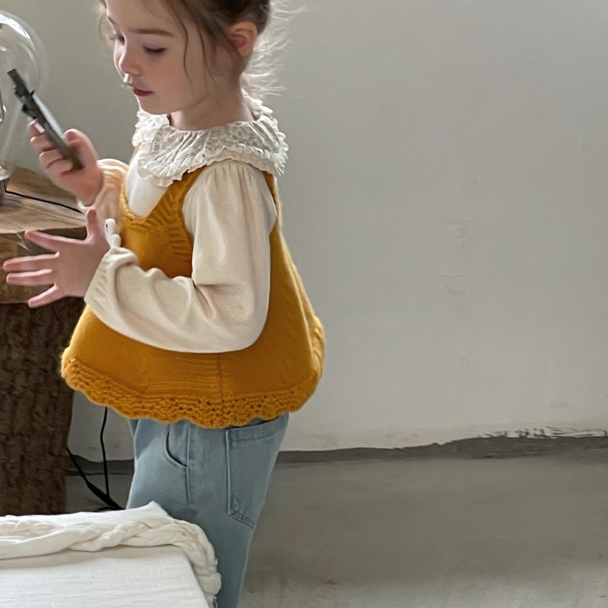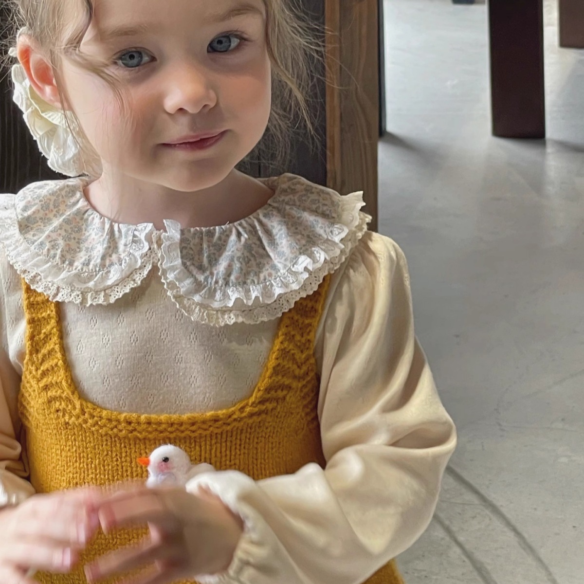 Ningli 여아 봄, 가을 정장 작은 노란색 오리 니트 조끼 + 꽃무늬 칼라 셔츠 + 데님 와이드 팬츠 3피스 세트스토어 가기
