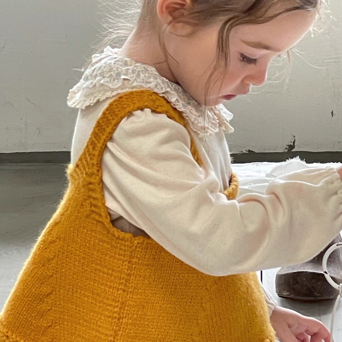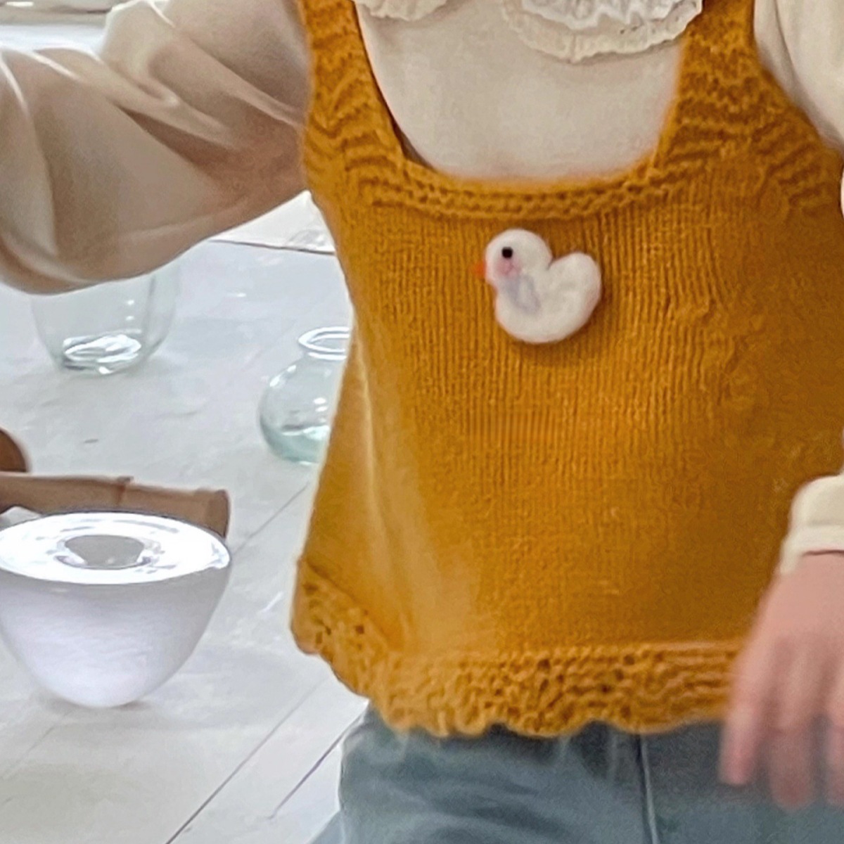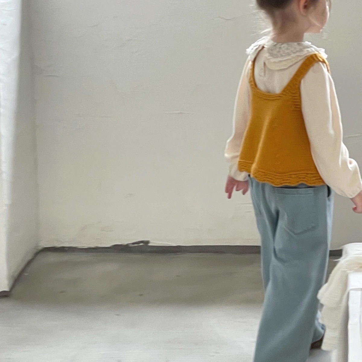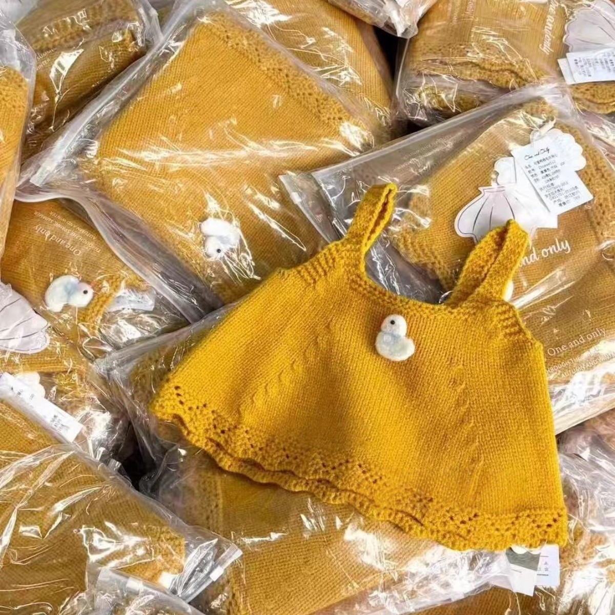 Ningli 여아 봄, 가을 정장 작은 노란색 오리 니트 조끼 + 꽃무늬 칼라 셔츠 + 데님 와이드 팬츠 3피스 세트스토어 가기