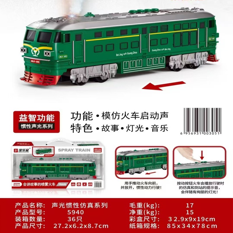 새로운 Baolaxing 관성 자동차 5940 스프레이 기차 시뮬레이션 녹색 가죽 기차 어린이 장난감 자동차 이야기를 들려줍니다