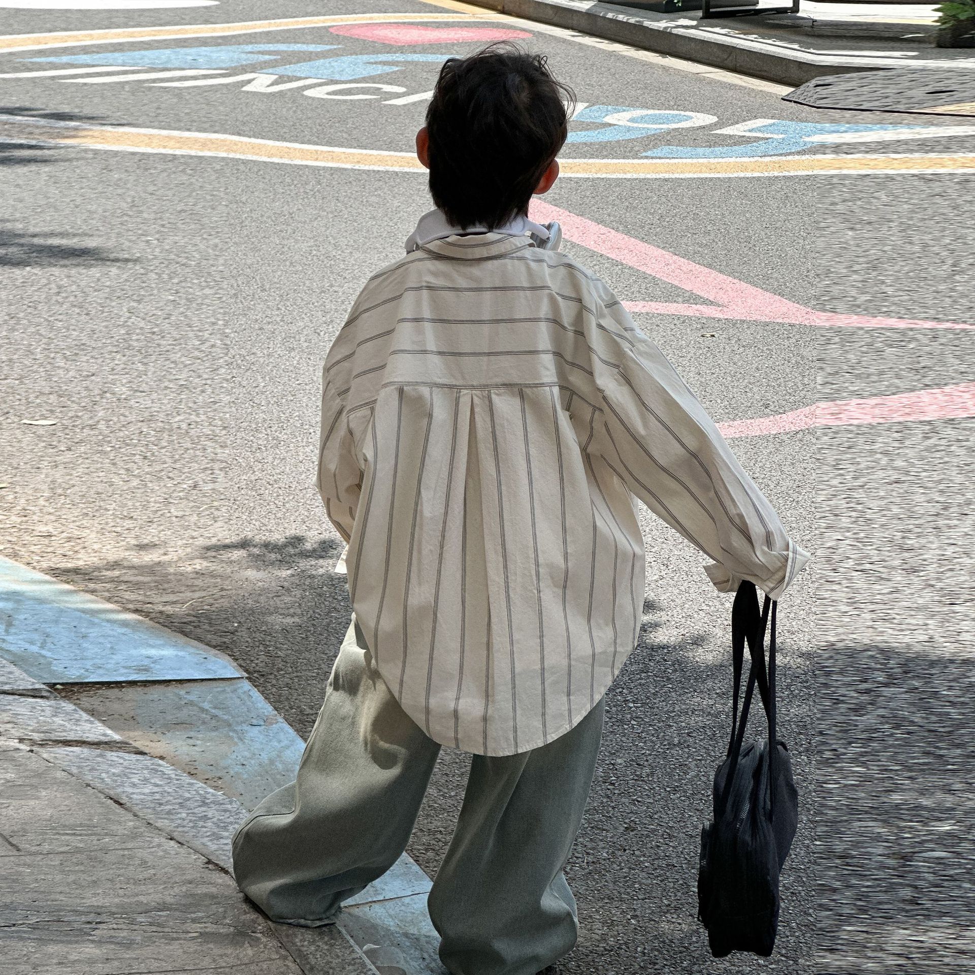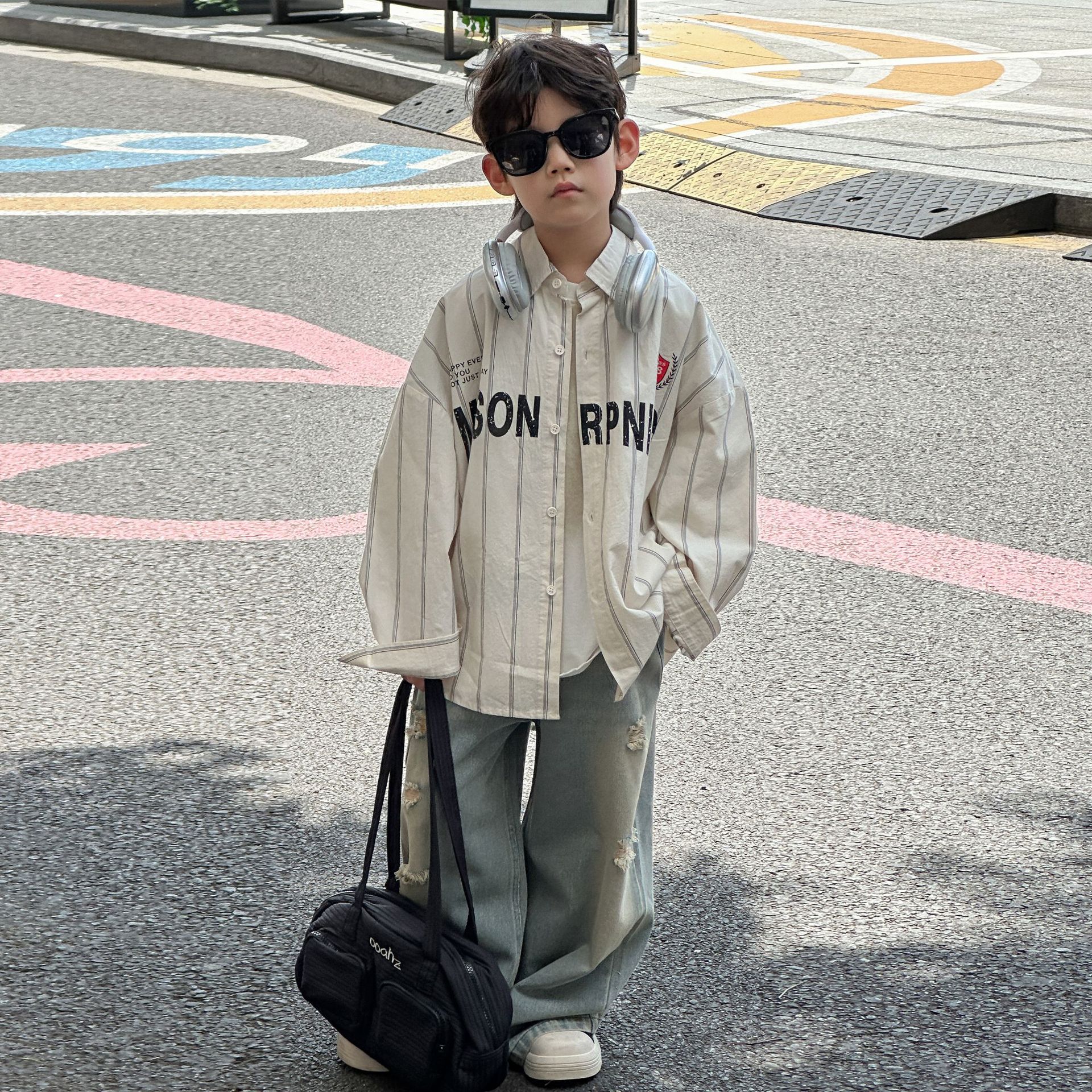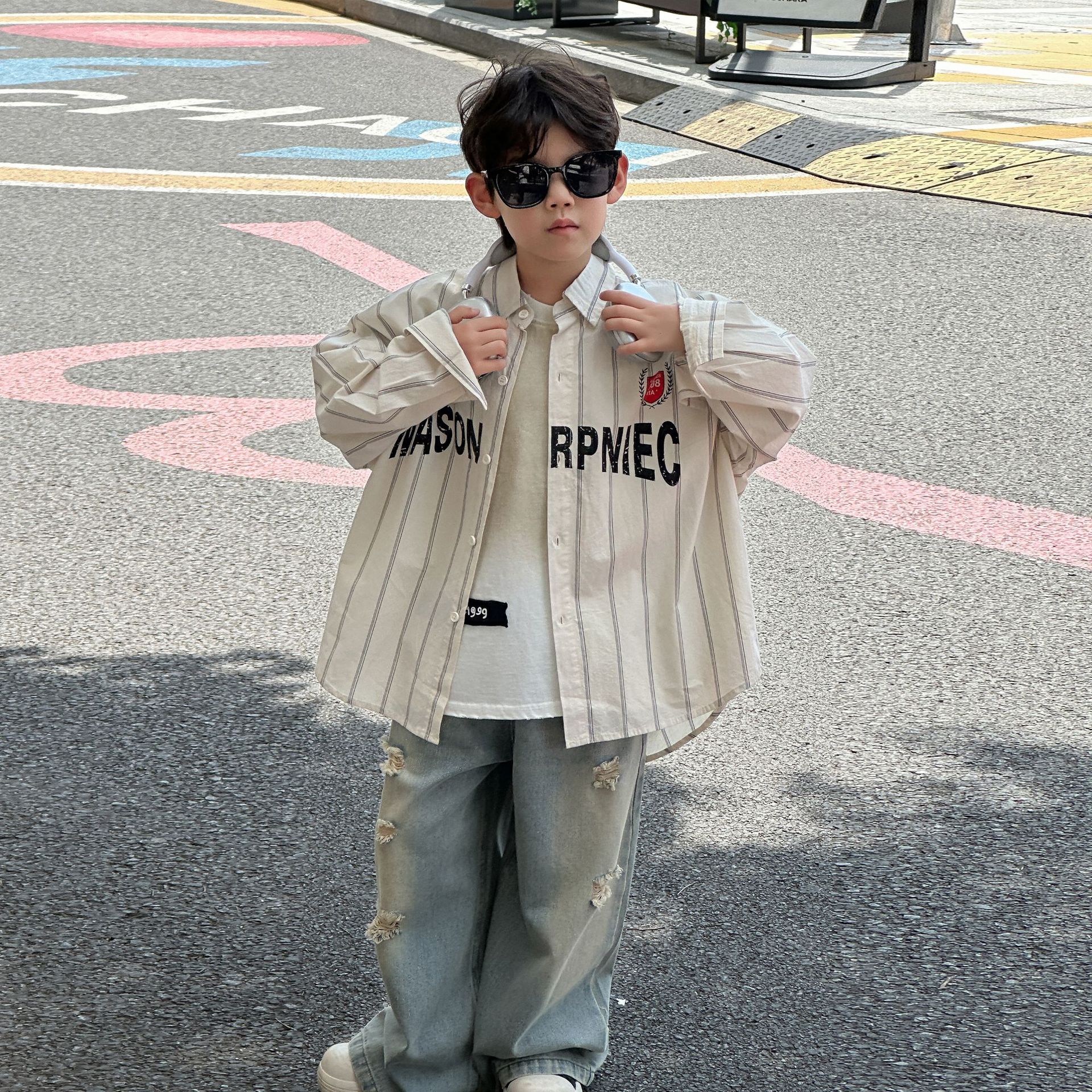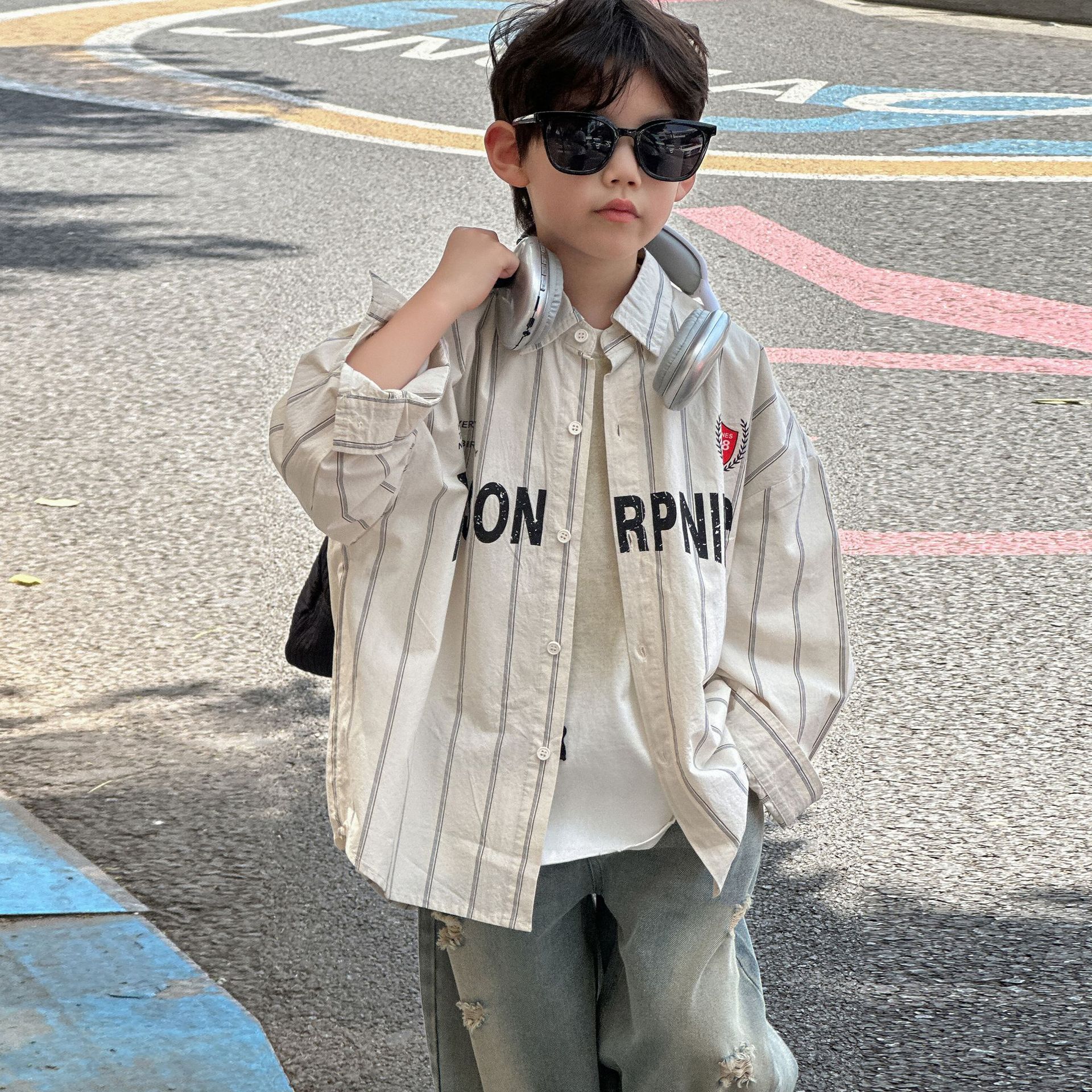 소년 봄, 가을 긴팔 셔츠 재킷 2025 새로운 어린이 느슨한 면화 가을 탑 캐주얼 줄무늬 아동 의류스토어 가기