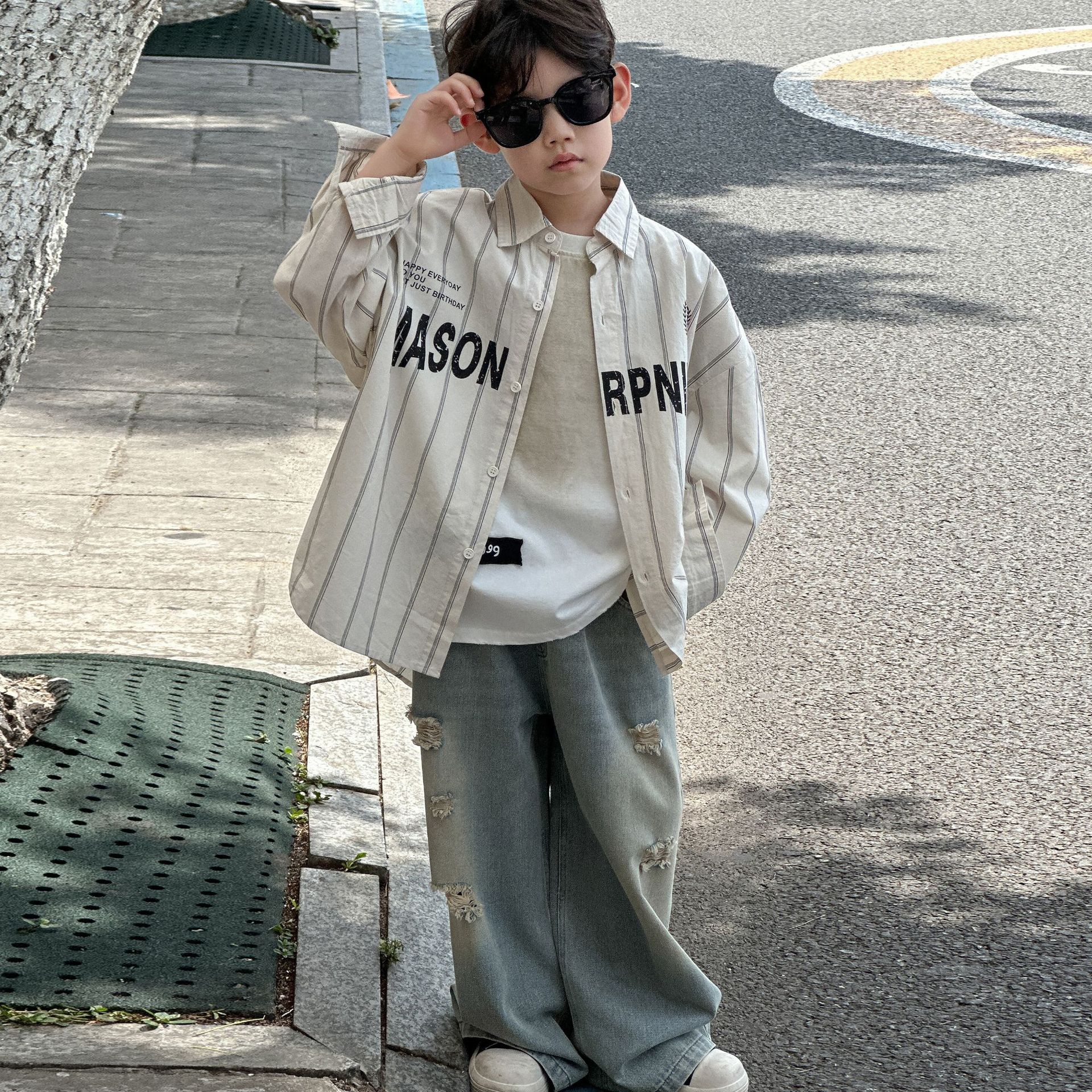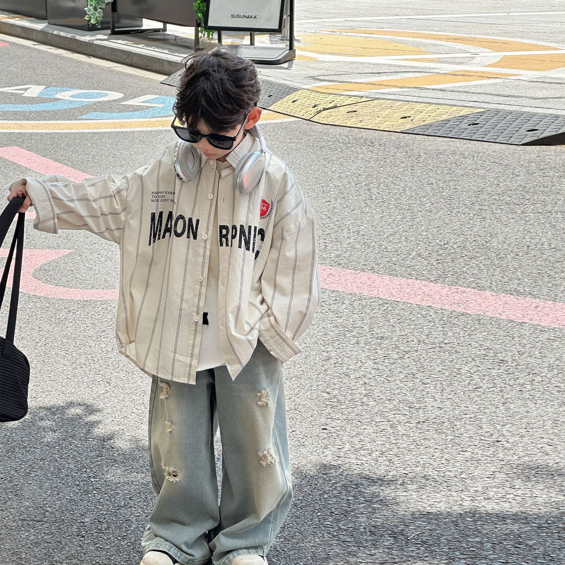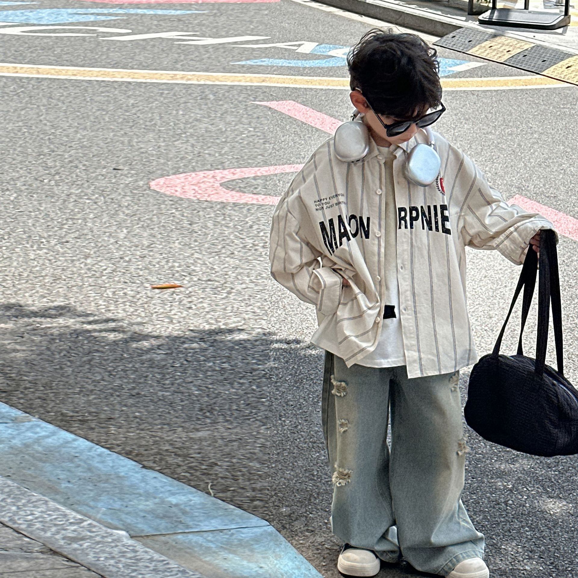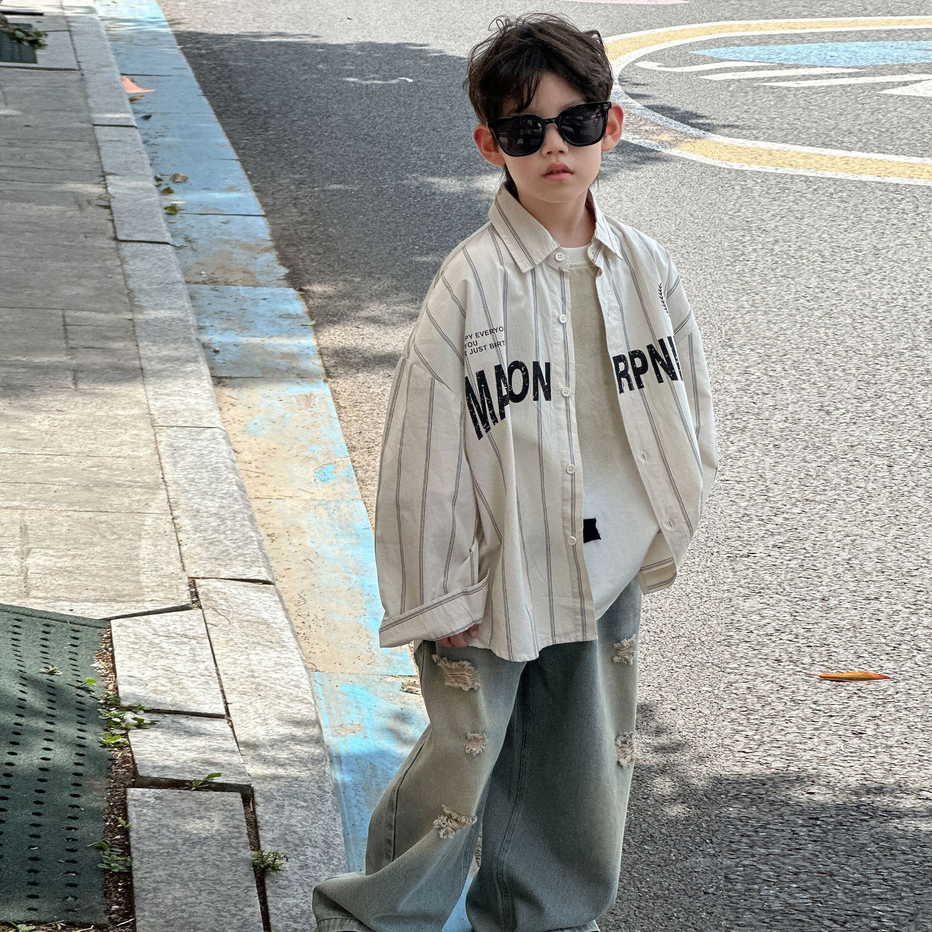 소년 봄, 가을 긴팔 셔츠 재킷 2025 새로운 어린이 느슨한 면화 가을 탑 캐주얼 줄무늬 아동 의류스토어 가기