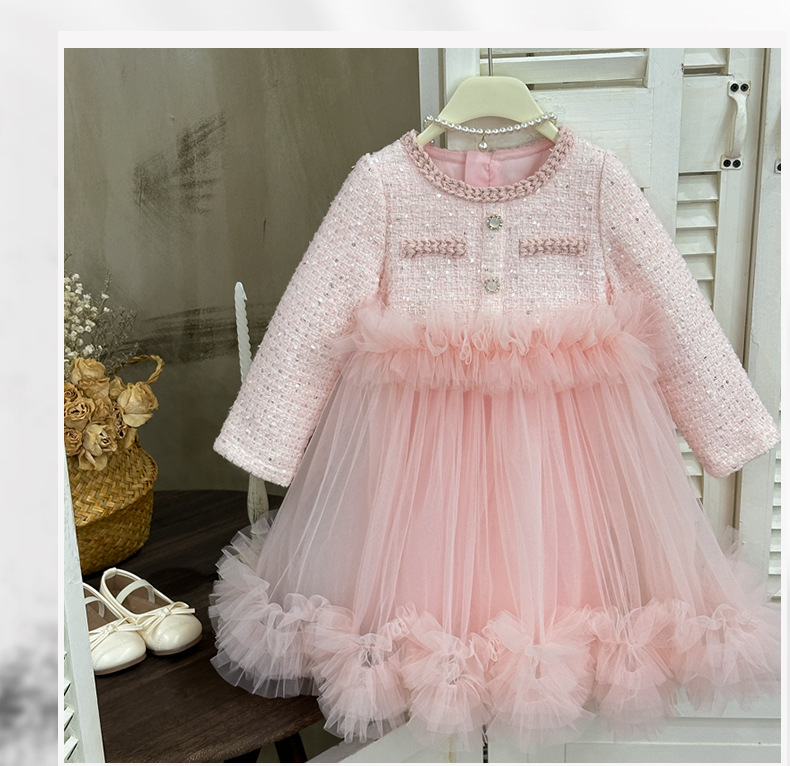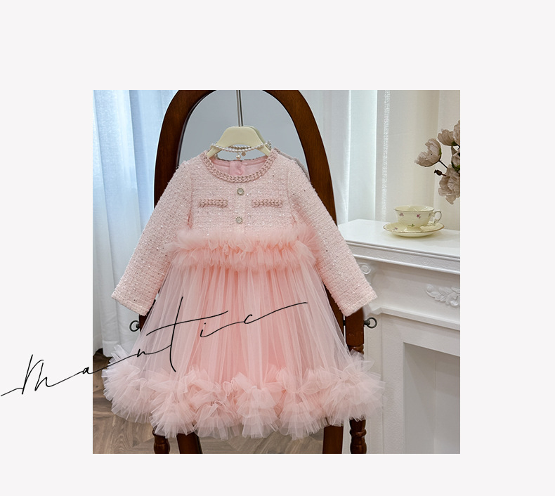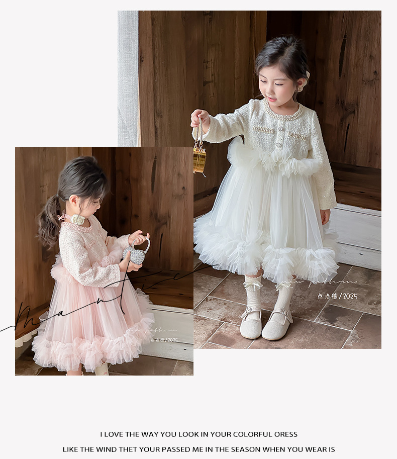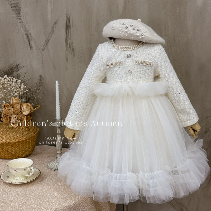 여자 드레스 2025 가을 새로운 한국 스타일 모직 작은 향기 스타일 모직 공주 드레스 슬리밍 메쉬 퍼프 스커트