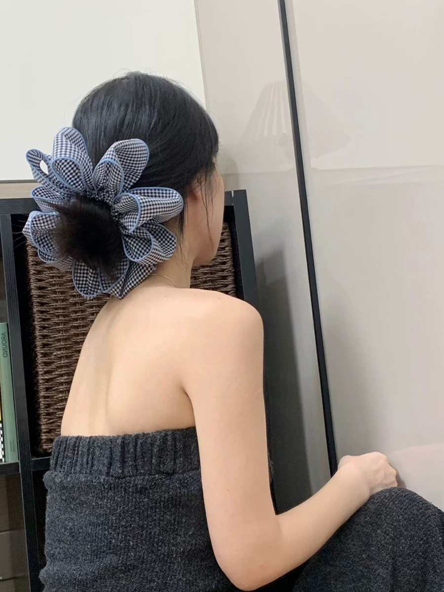 한국의 다재다능한 분위기와 대비되는 체크무늬 주름 장식의 여아용 심플한 뒷머리 머리끈과 탄성 고무밴드스토어 가기
