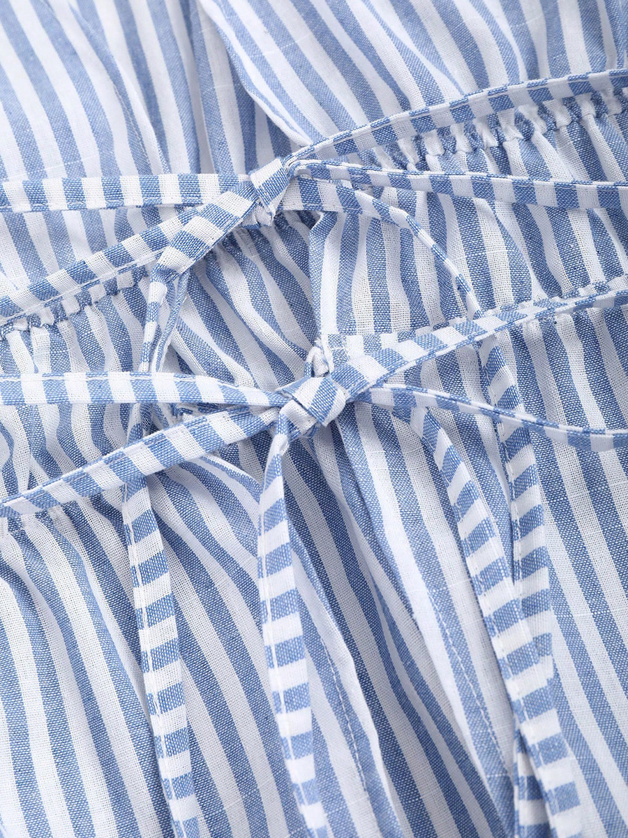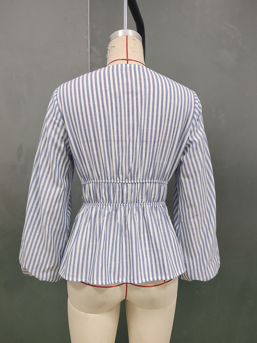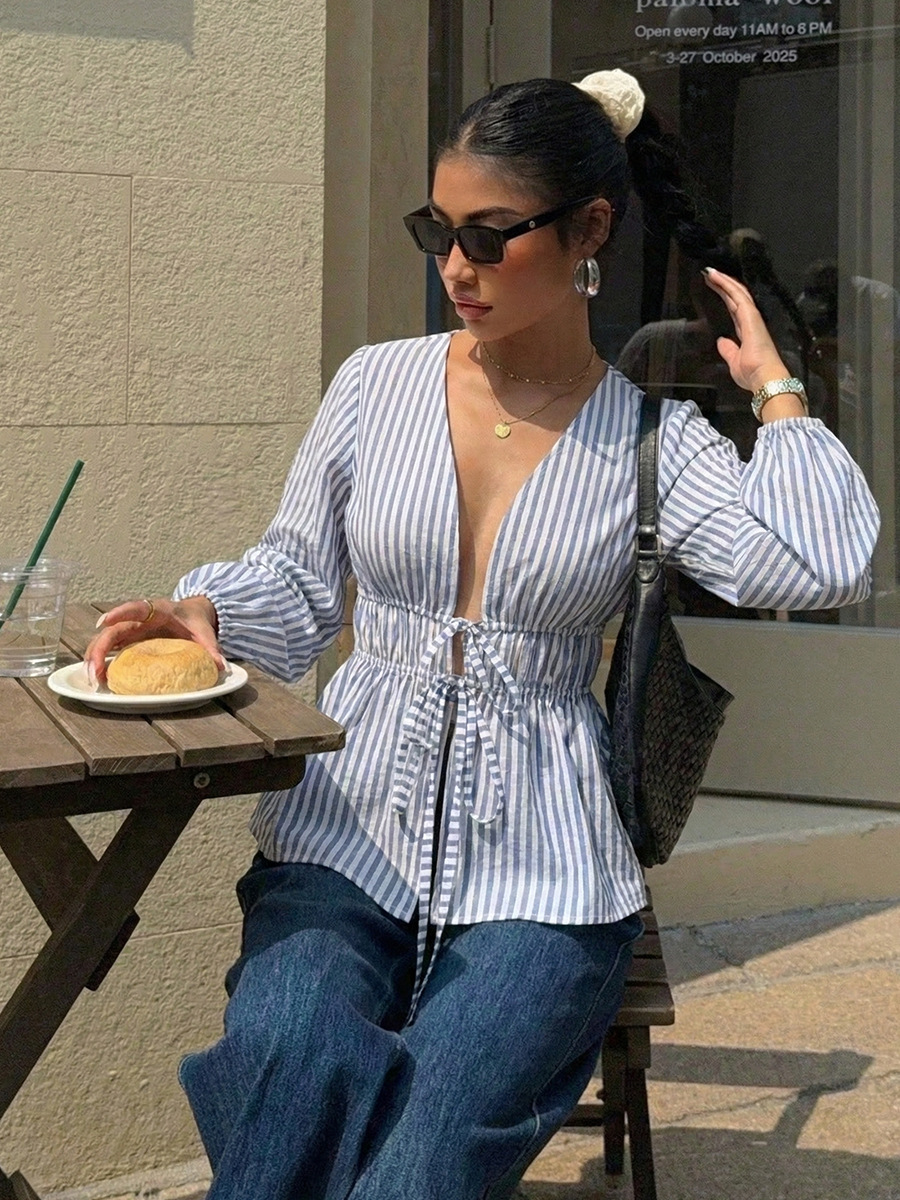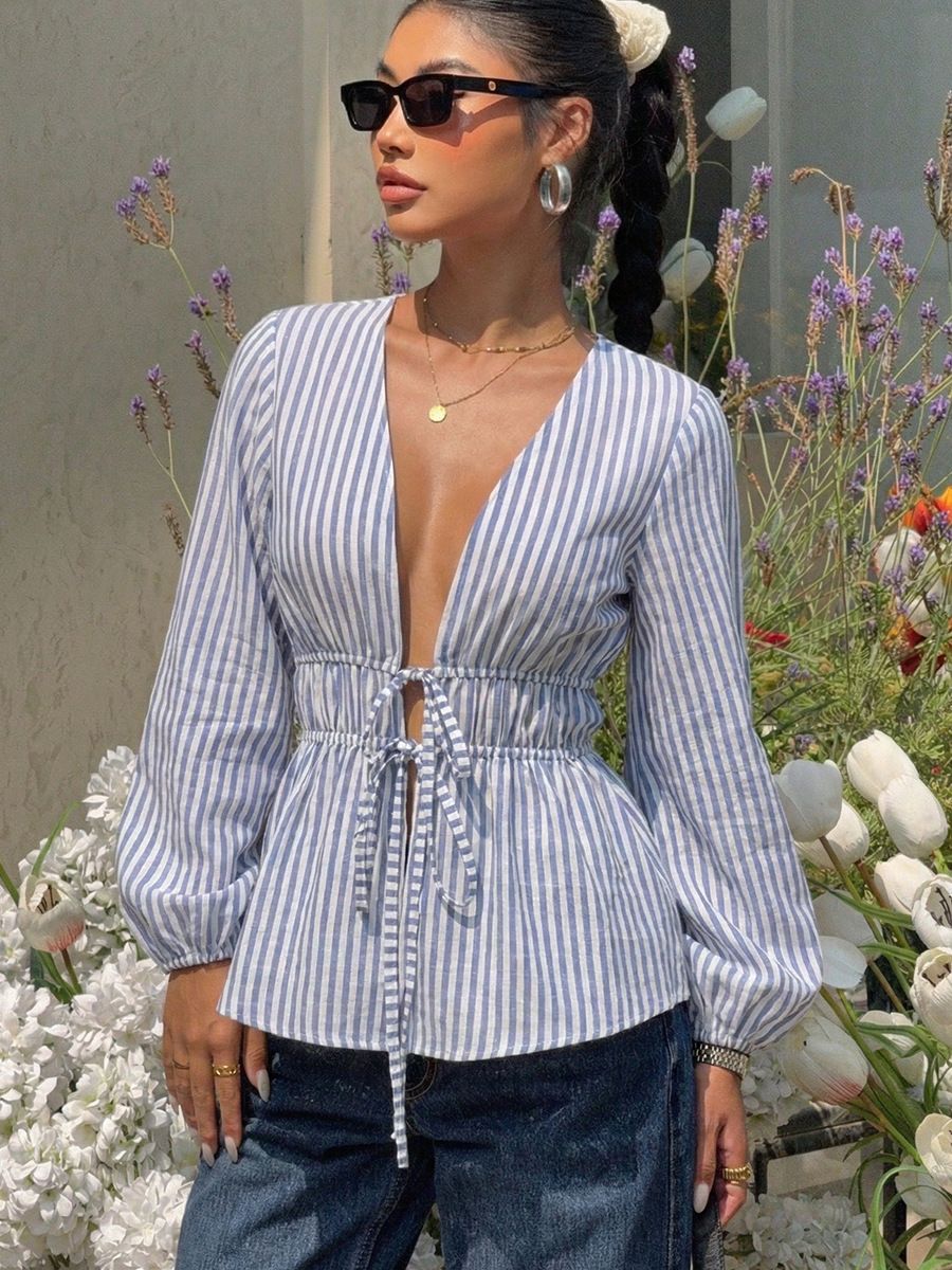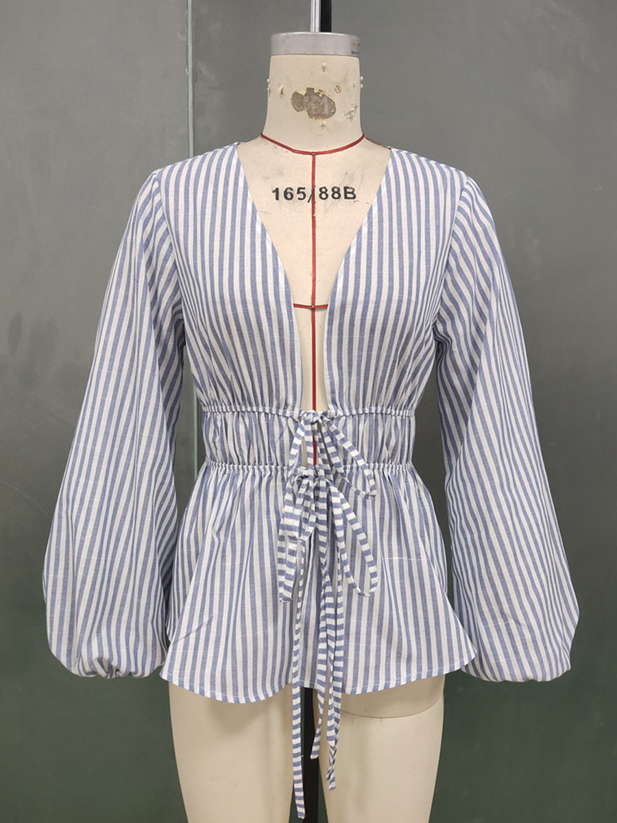 2025 가을 새로운 유럽과 미국 스타일의 스트라이프 셔츠 긴팔 레이스 업 셔츠 카디건 크로스 보더 아마존 여성 의류스토어 가기