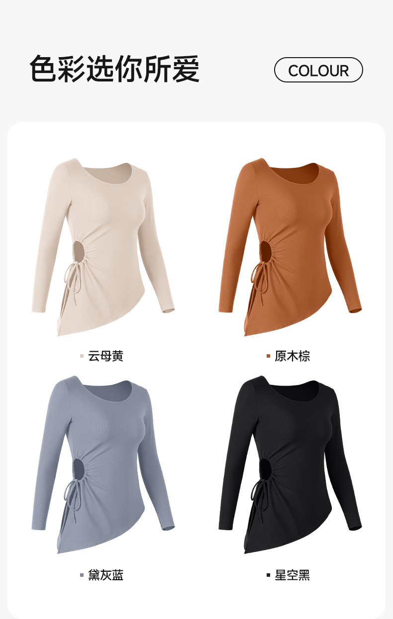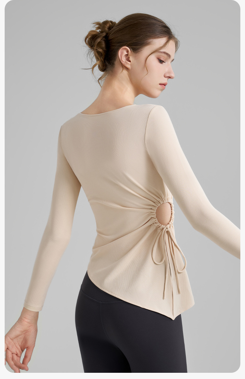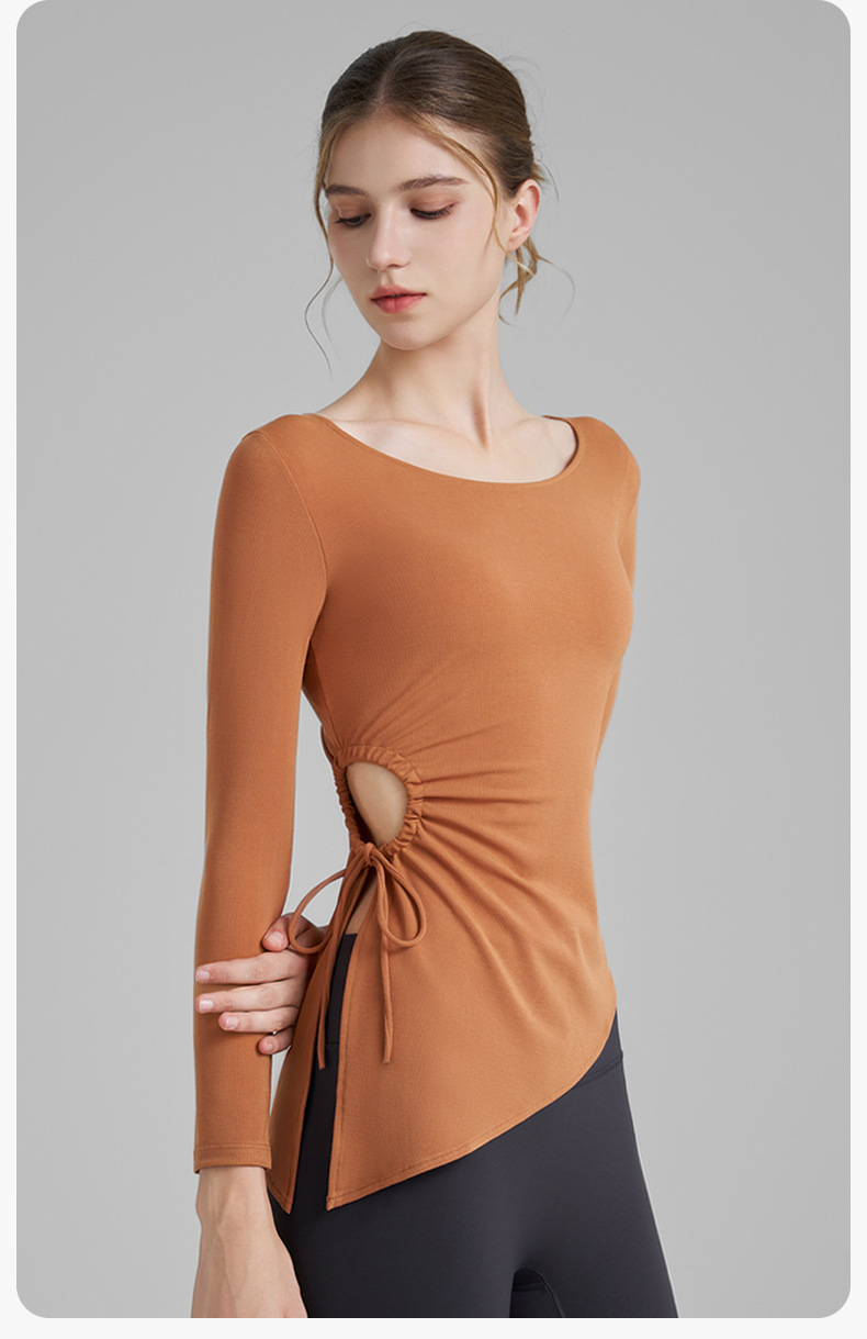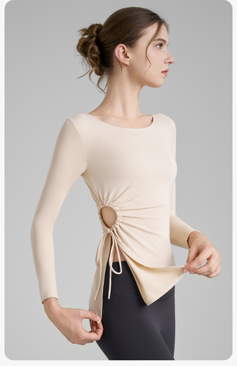 누드톤 고탄력 요가 티셔츠 여성용 고급 가을 신상 요가복 긴팔 조임끈 허리 트임 피트니스복