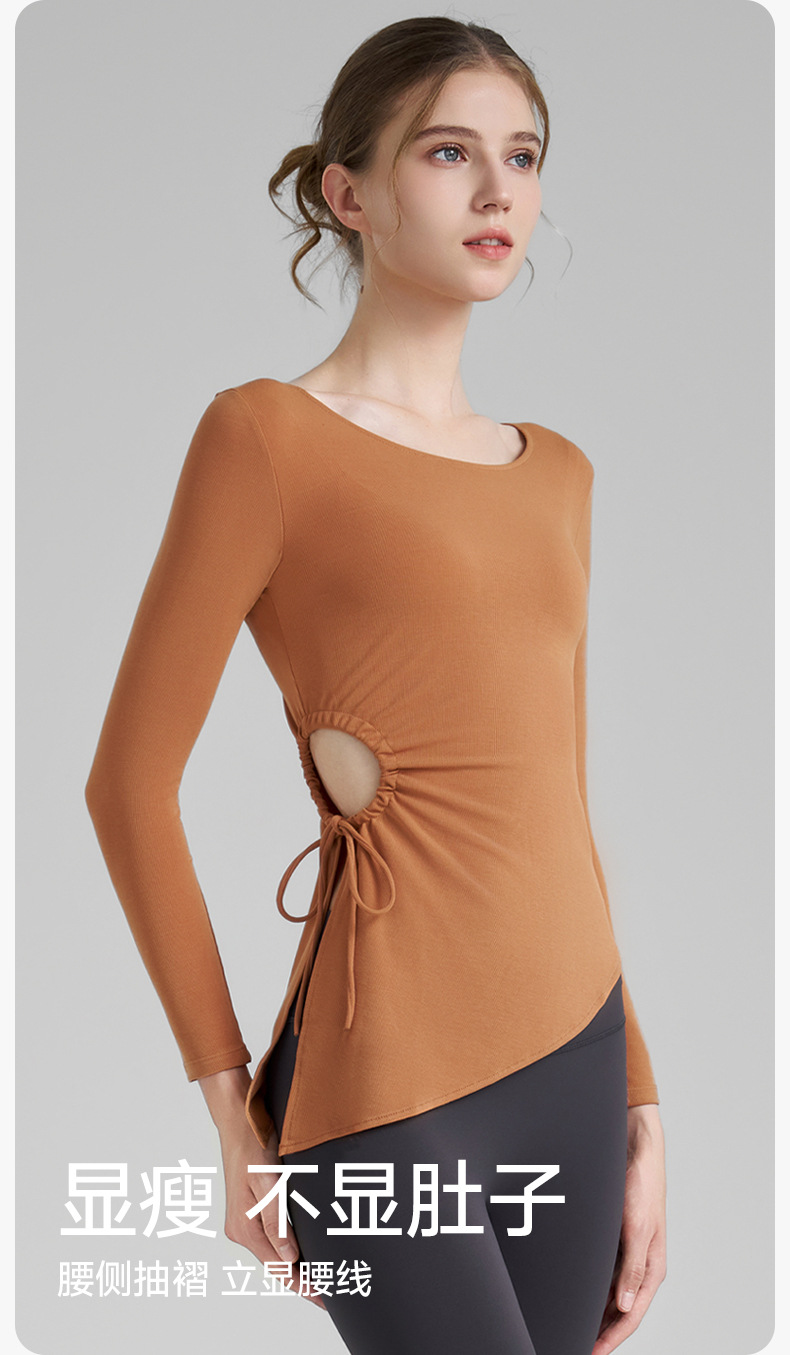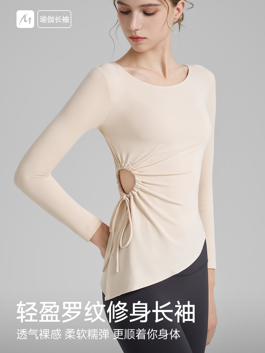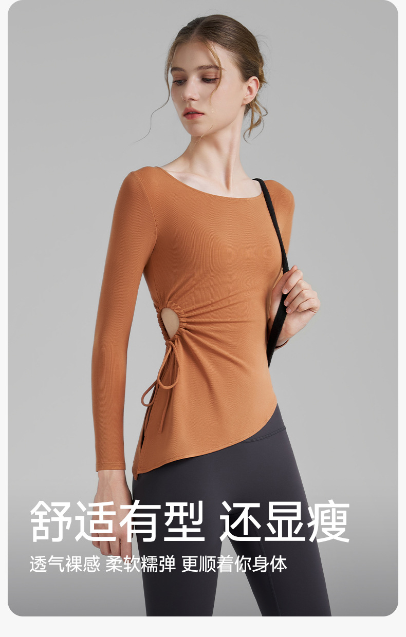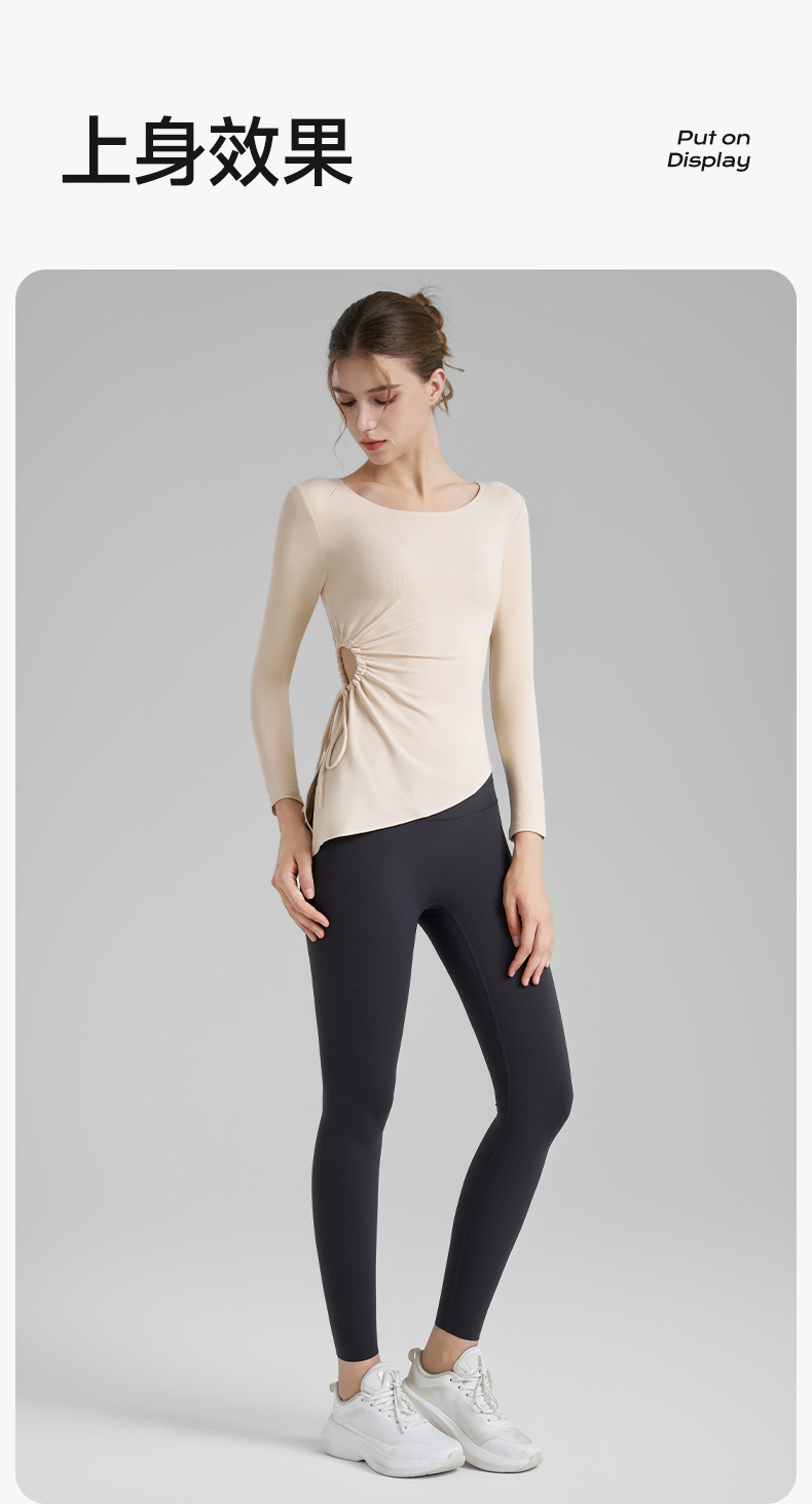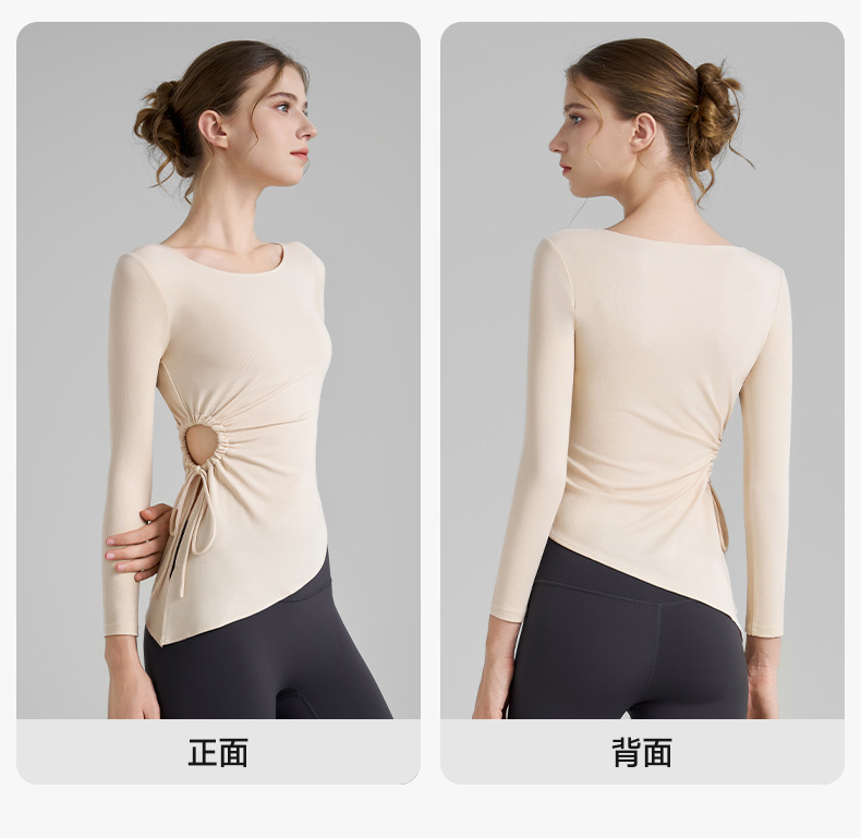 누드톤 고탄력 요가 티셔츠 여성용 고급 가을 신상 요가복 긴팔 조임끈 허리 트임 피트니스복스토어 가기